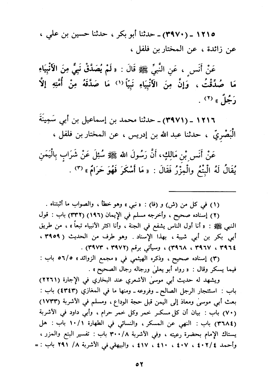 3970 - حَدَّثَنَا أَبُو بَكْرٍ، حَدَّثَنَا حُسَيْنُ بْنُ عَلِيٍّ، عَنْ زَائِدَةَ، عنِ الْمُخْتَارِ بْنِ فُلْفُلٍ، عَنْ أَنَسٍ، عَنِ النَّبِيِّ صَلَّى اللهُ عَلَيْهِ وَسَلَّمَ قَالَ: «§لَمْ يُصَدَّقْ نَبِيٌّ مِنَ الْأَنْبِيَاءِ مَا صُدِّقْتُ، وَإِنَّ مِنَ الْأَنْبِيَاءِ نَبِيًّا مَا صَدَّقَهُ مِنْ أُمَّتِهِ إِلَّا رَجُلٌ» Kإسناده صحيح