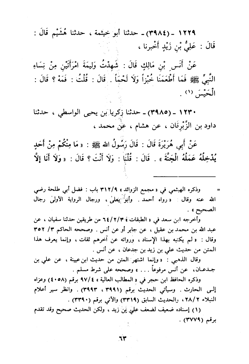 3984 - حَدَّثَنَا أَبُو خَيْثَمَةَ، حَدَّثَنَا هُشَيْمٌ، قَالَ: قَالَ عَلِيُّ بْنُ زَيْدٍ، أَخْبَرَنَا، عَنْ أَنَسِ بْنِ مَالِكٍ قَالَ: «§شَهِدْتُ وَلِيمَةَ امْرَأَتَيْنِ مِنْ نِسَاءِ النَّبِيِّ صَلَّى اللهُ عَلَيْهِ وَسَلَّمَ، فَمَا أَطْعَمَنَا خُبْزًا وَلَا لَحْمًا»، قَالَ: قُلْتُ: فَمَهْ؟ قَالَ: «الْحَيْسَ» Kإسناده ضعيف ولكن الحديث صحيح
