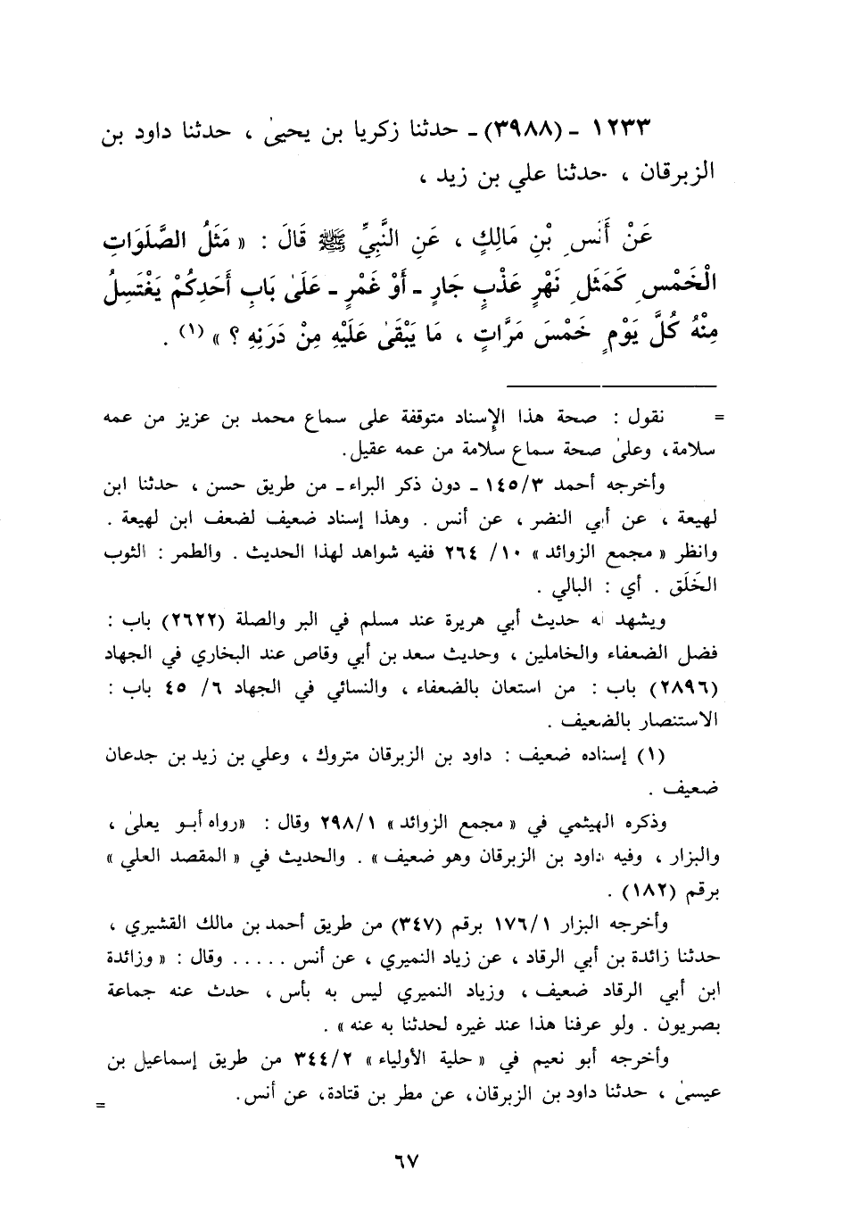 3988 - حَدَّثَنَا زَكَرِيَّا بْنُ يَحْيَى، حَدَّثَنَا دَاوُدُ بْنُ الزِّبْرِقَانِ، حَدَّثَنَا عَلِيُّ بْنُ زَيْدٍ، عَنْ أَنَسِ بْنِ مَالِكٍ، عَنِ النَّبِيِّ صَلَّى اللهُ عَلَيْهِ وَسَلَّمَ قَالَ: «§مَثَلُ الصَّلَوَاتِ الْخَمْسِ كَمَثَلِ نَهْرٍ عَذْبٍ جَارٍ، أَوْ غَمْرٍ، عَلَى بَابِ أَحَدِكُمْ، يَغْتَسِلُ مِنْهُ كُلَّ يَوْمٍ خَمْسَ مَرَّاتٍ، مَا يَبْقَى عَلَيْهِ مِنْ دَرَنِهِ؟» Kإسناده ضعيف