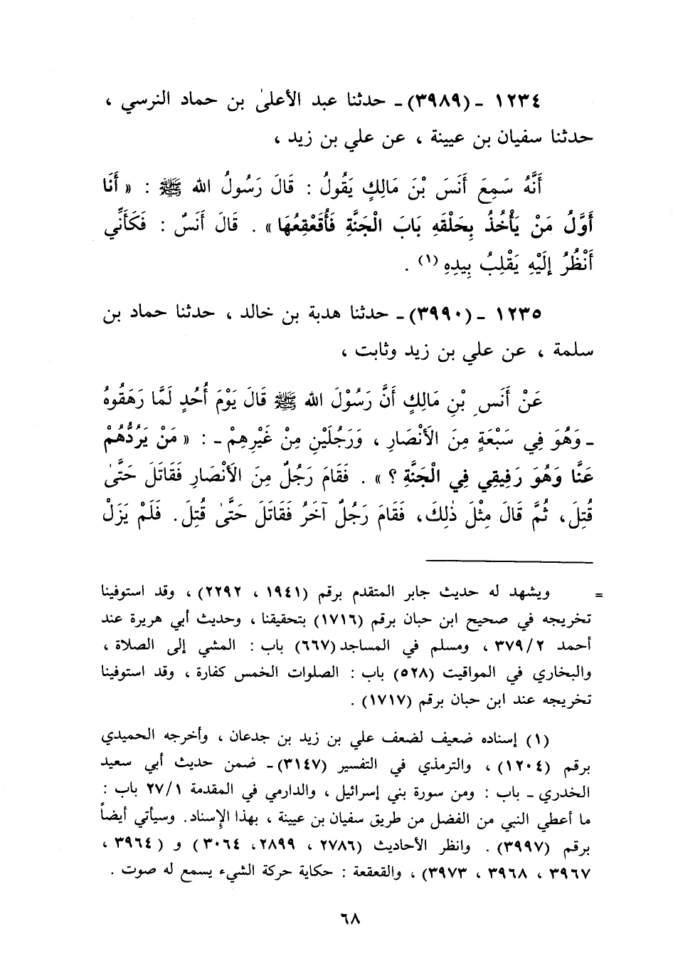 3989 - حَدَّثَنَا عَبْدُ الْأَعْلَى بْنُ حَمَّادٍ النَّرْسِيُّ، حَدَّثَنَا سُفْيَانُ بْنُ عُيَيْنَةَ، عَنْ عَلِيِّ بْنِ زَيْدٍ، أَنَّهُ سَمِعَ أَنَسَ بْنَ مَالِكٍ يَقُولُ: قَالَ رَسُولُ اللَّهِ صَلَّى اللهُ عَلَيْهِ وَسَلَّمَ: «§أَنَا أَوَّلُ مَنْ يَأْخُذُ بِحَلْقَةِ بَابِ الْجَنَّةِ فَأُقَعْقِعُهَا»، قَالَ أَنَسٌ: فَكَأَنِّي أَنْظُرُ إِلَيْهِ يَقْلِبُ بِيَدِهِKإسناده ضعيف