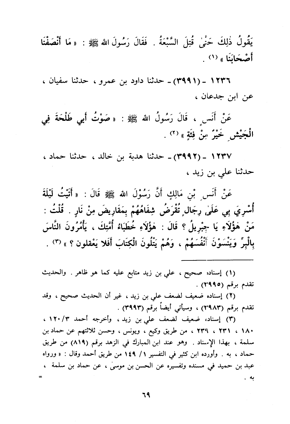 3992 - حَدَّثَنَا هُدْبَةُ بْنُ خَالِدٍ، حَدَّثَنَا حَمَّادٌ، حَدَّثَنَا عَلِيُّ بْنُ زَيْدٍ، عَنْ أَنَسِ بْنِ مَالِكٍ، أَنَّ رَسُولَ اللَّهِ صَلَّى اللهُ عَلَيْهِ وَسَلَّمَ قَالَ: " §أَتَيْتُ لَيْلَةَ أُسْرِيَ بِي عَلَى رِجَالٍ تُقْرَضُ شِفَاهُهُمْ بِمَقَارِيضَ مِنْ نَارٍ، قُلْتُ: مَنْ هَؤُلَاءِ يَا جِبْرِيلُ؟ قَالَ: هَؤُلَاءِ خُطَبَاءُ أُمَّتِكَ، يَأْمُرُونَ النَّاسَ بِالْبِرِّ وَيَنْسَوْنَ أَنْفُسَهُمْ، وَهُمْ يَتْلُونَ الْكِتَابَ، أَفَلَا يَعْقِلُونَ؟ "Kإسناده ضعيف