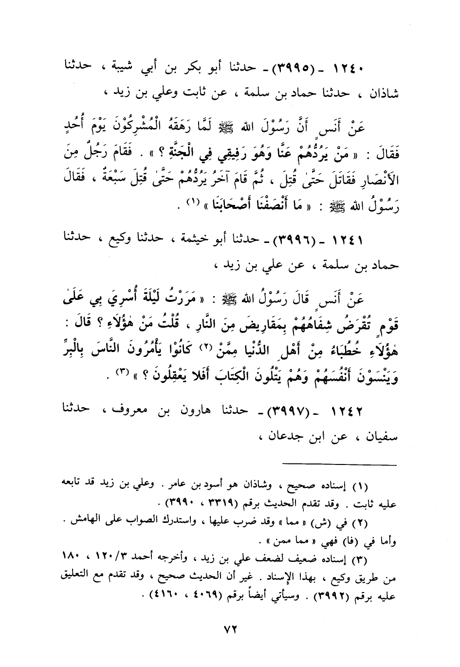 3995 - حَدَّثَنَا أَبُو بَكْرِ بْنُ أَبِي شَيْبَةَ، حَدَّثَنَا شَاذَانُ، حَدَّثَنَا حَمَّادُ بْنُ سَلَمَةَ، عَنْ ثَابِتٍ، وَعَلِيِّ بْنِ زَيْدٍ، عَنْ أَنَسٍ، أَنَّ رَسُولَ اللَّهِ صَلَّى اللهُ عَلَيْهِ وَسَلَّمَ لَمَّا رَهَقَهُ الْمُشْرِكُونَ يَوْمَ أُحُدٍ فَقَالَ: «§مَنْ يَرُدُّهُمْ عَنَّا وَهُوَ رَفِيقِي فِي الْجَنَّةِ»، فَقَامَ رَجُلٌ مِنَ الْأَنْصَارِ، فَقَاتَلَ حَتَّى قُتِلَ، ثُمَّ قَامَ آخَرُ يَرُدُّهُمْ حَتَّى قُتِلَ سَبْعَةٌ، فَقَالَ رَسُولُ اللَّهِ صَلَّى اللهُ عَلَيْهِ وَسَلَّمَ: «مَا أَنْصَفْنَا أَصْحَابَنَا» Kإسناده صحيح