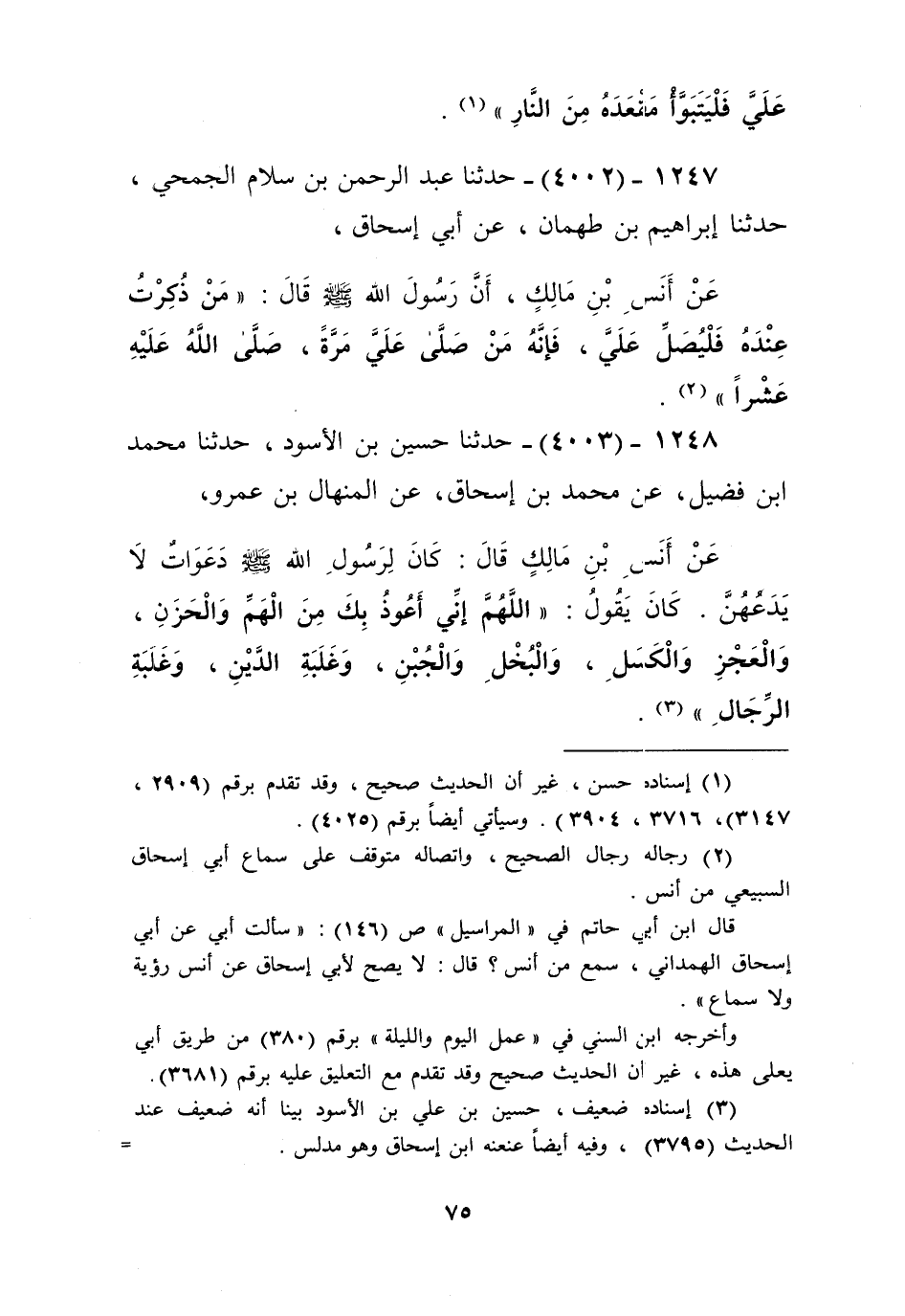 4002 - حَدَّثَنَا عَبْدُ الرَّحْمَنِ بْنُ سَلَامٍ الْجُمَحِيُّ، حَدَّثَنَا إِبْرَاهِيمُ بْنُ طَهْمَانَ، عَنْ أَبِي إِسْحَاقَ، عَنْ أَنَسِ بْنِ مَالِكٍ، أَنَّ رَسُولَ اللَّهِ صَلَّى اللهُ عَلَيْهِ وَسَلَّمَ قَالَ: «§مَنْ ذُكِرْتُ عِنْدَهُ فَلْيُصَلِّ عَلَيَّ؛ فَإِنَّهُ مَنْ صَلَّى عَلَيَّ مَرَّةً صَلَّى اللَّهُ عَلَيْهِ عَشْرًا» Kرجاله رجال الصحيح