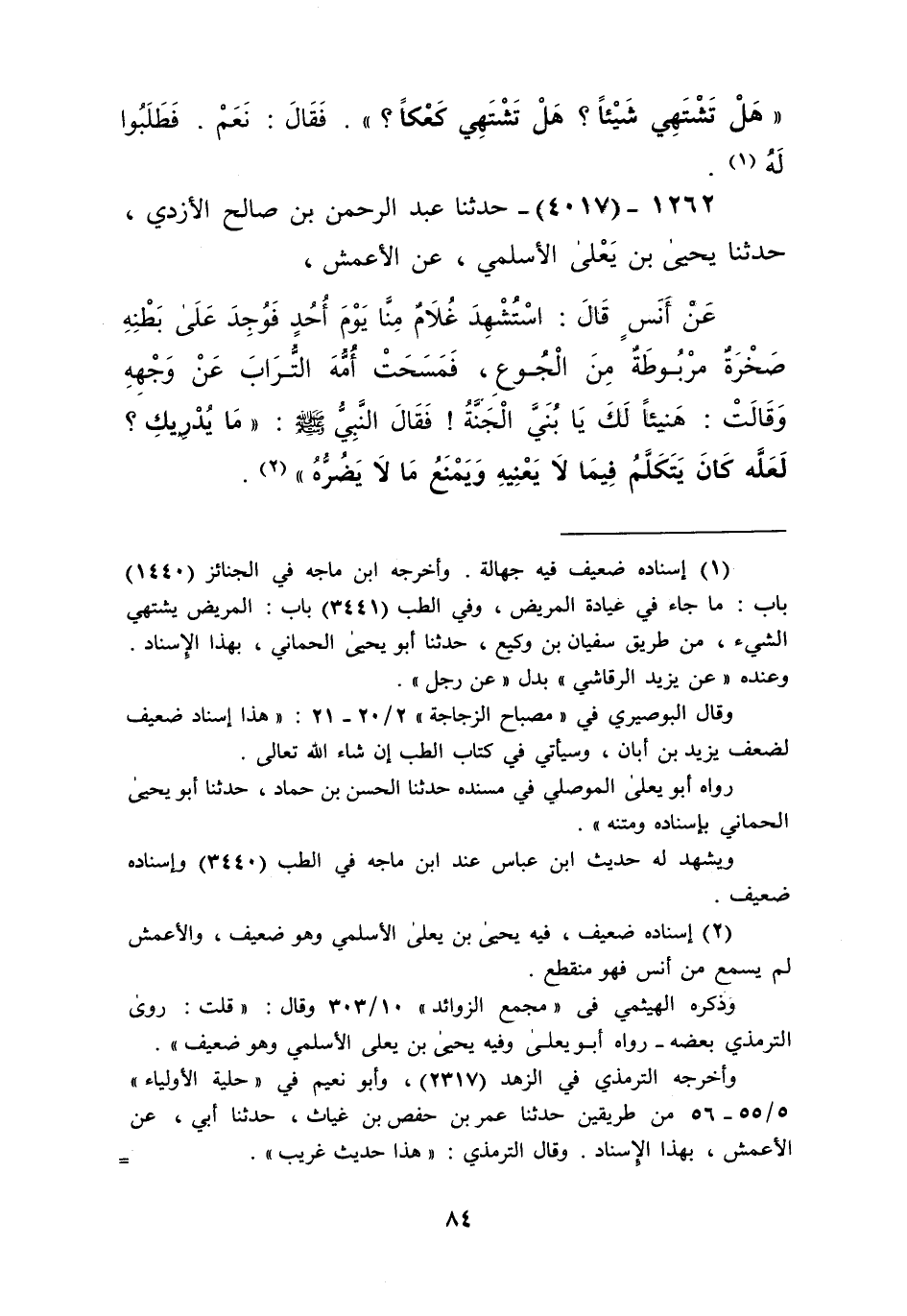 4017 - حَدَّثَنَا عَبْدُ الرَّحْمَنِ بْنُ صَالِحٍ الْأَزْدِيُّ، حَدَّثَنَا يَحْيَى بْنُ يَعْلَى الْأَسْلَمِيُّ، عَنِ الْأَعْمَشِ، عَنْ أَنَسٍ قَالَ: اسْتُشْهِدَ غُلَامٌ مِنَّا يَوْمَ أُحُدٍ، فَوُجِدَ عَلَى بَطْنِهِ صَخْرَةٌ مَرْبُوطَةٌ مِنَ الْجُوعِ، فَمَسَحَتْ أُمُّهُ التُّرَابَ عَنْ وَجْهِهِ وَقَالَتْ: هَنِيئًا لَكَ يَا بُنَيَّ الْجَنَّةُ فَقَالَ النَّبِيُّ صَلَّى اللهُ عَلَيْهِ وَسَلَّمَ: «§مَا يُدْرِيكِ؟ لَعَلَّهُ كَانَ يَتَكَلَّمُ فِيمَا لَا يَعْنِيهِ، وَيَمْنَعُ مَا لَا يَضُرُّهُ» Kإسناده ضعيف