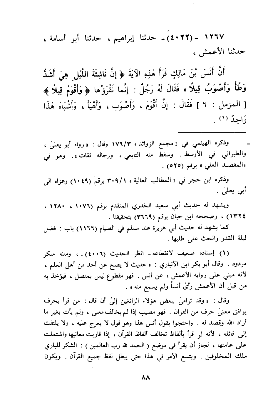 4022 - حَدَّثَنَا إِبْرَاهِيمُ، حَدَّثَنَا أَبُو أُسَامَةَ، حَدَّثَنَا الْأَعْمَشُ، أَنَّ أَنَسَ بْنَ مَالِكٍ قَرَأَ هَذِهِ الْآيَةَ: (§إِنَّ نَاشِئَةَ اللَّيْلِ هِيَ أَشَدُّ وَطْأً وَأَصْوَبُ قِيلًا)، فَقَالَ لَهُ رَجُلٌ: إِنَّمَا نَقْرَؤُهَا {وَأَقْوَمُ قِيلًا} [المزمل: 6]، فَقَالَ: «إِنَّ أَقْوَمَ، وَأَصْوَبَ، وَأَهْيَأَ، وَأَشْبَاهَ هَذَا وَاحِدٌ» Kإسناده ضعيف ومتنه منكر مردود