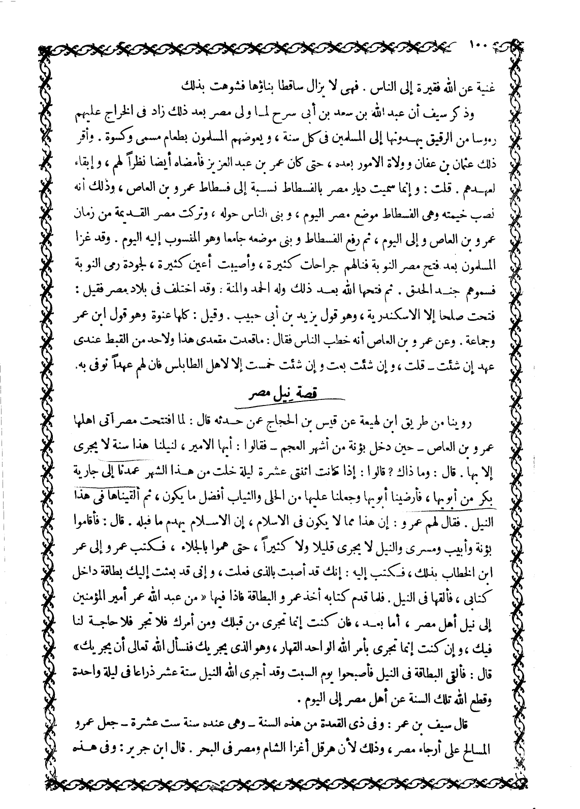 رُوِّينَا مِنْ طَرِيقِ ابْنِ لَهِيعَةَ عَنْ قَيْسِ بْنِ الْحَجَّاجِ عَمَّنْ حَدَّثَهُ قَالَ: لَمَّا افْتُتِحَتْ مِصْرُ أَتَى أَهْلُهَا عَمْرَو بْنَ الْعَاصِ- حِينَ دَخَلَ بُؤْنَةُ مِنْ أَشْهُرِ الْعَجَمِ- فَقَالُوا: أَيُّهَا الْأَمِيرُ، لِنِيلِنَا هَذَا سُنَّةً لَا يَجْرِي إِلَّا بِهَا. قَالَ: وَمَا ذَاكَ؟ قَالُوا: إِذَا كَانَتِ اثْنَتَيْ عَشْرَةَ لَيْلَةً خَلَتْ مِنْ هَذَا الشَّهْرِ عَمَدْنَا إِلَى جَارِيَةٍ بِكْرٍ مِنْ أَبَوَيْهَا، فَأَرْضَيْنَا أَبَوَيْهَا وَجَعَلْنَا عَلَيْهَا مِنَ الْحَلْيِ وَالثِّيَابِ أَفْضَلَ مَا يَكُونُ، ثُمَّ أَلْقَيْنَاهَا فِي هَذَا النِّيلِ. فَقَالَ لَهُمْ عَمْرٌو: إِنَّ هَذَا مِمَّا لَا يَكُونُ فِي الْإِسْلَامِ، إِنَّ الْإِسْلَامَ يَهْدِمُ مَا قَبْلَهُ. قَالَ: فَأَقَامُوا بُؤْنَةَ وَأَبِيبَ وَمِسْرَى وَالنِّيلُ لَا يَجْرِي قَلِيلًا وَلَا كَثِيرًا، حَتَّى هَمُّوا بِالْجَلَاءِ، فَكَتَبَ عَمْرٌو إِلَى عُمَرَ ابن الْخَطَّابِ بِذَلِكَ، فَكَتَبَ إِلَيْهِ: إِنَّكَ قَدْ أَصَبْتَ بِالَّذِي فَعَلْتَ، وَإِنِّي قَدْ بعثت إليك بطاقة دَاخِلَ كِتَابِي، فَأَلْقِهَا فِي النِّيلِ. فَلَمَّا قَدِمَ كِتَابُهُ أَخَذَ عَمْرٌو الْبِطَاقَةَ فَإِذَا فِيهَا «مِنْ عَبْدِ اللَّهِ عُمَرَ أَمِيرِ الْمُؤْمِنِينَ إِلَى نِيلِ أَهْلِ مِصْرَ، أَمَّا بَعْدُ، فَإِنْ كُنْتَ إِنَّمَا تَجْرِي مِنْ قِبَلِكَ ومن أمرك فلا تجر فلا حاجة لنا فيك، وإن كنت إنما تجرى بأمر الله الواحد القهار، وهو الَّذِي يُجْرِيكَ فَنَسْأَلُ اللَّهَ تَعَالَى أَنْ يُجْرِيَكَ» قَالَ: فَأَلْقَى الْبِطَاقَةَ فِي النِّيلِ فَأَصْبَحُوا يَوْمُ السَّبْتِ وَقَدْ أَجْرَى اللَّهُ النِّيلَ سِتَّةَ عَشَرَ ذِرَاعًا فِي لَيْلَةٍ وَاحِدَةٍ وَقَطَعَ اللَّهُ تِلْكَ السُّنَّةَ عَنْ أَهْلِ مِصْرَ إِلَى الْيَوْمِ.