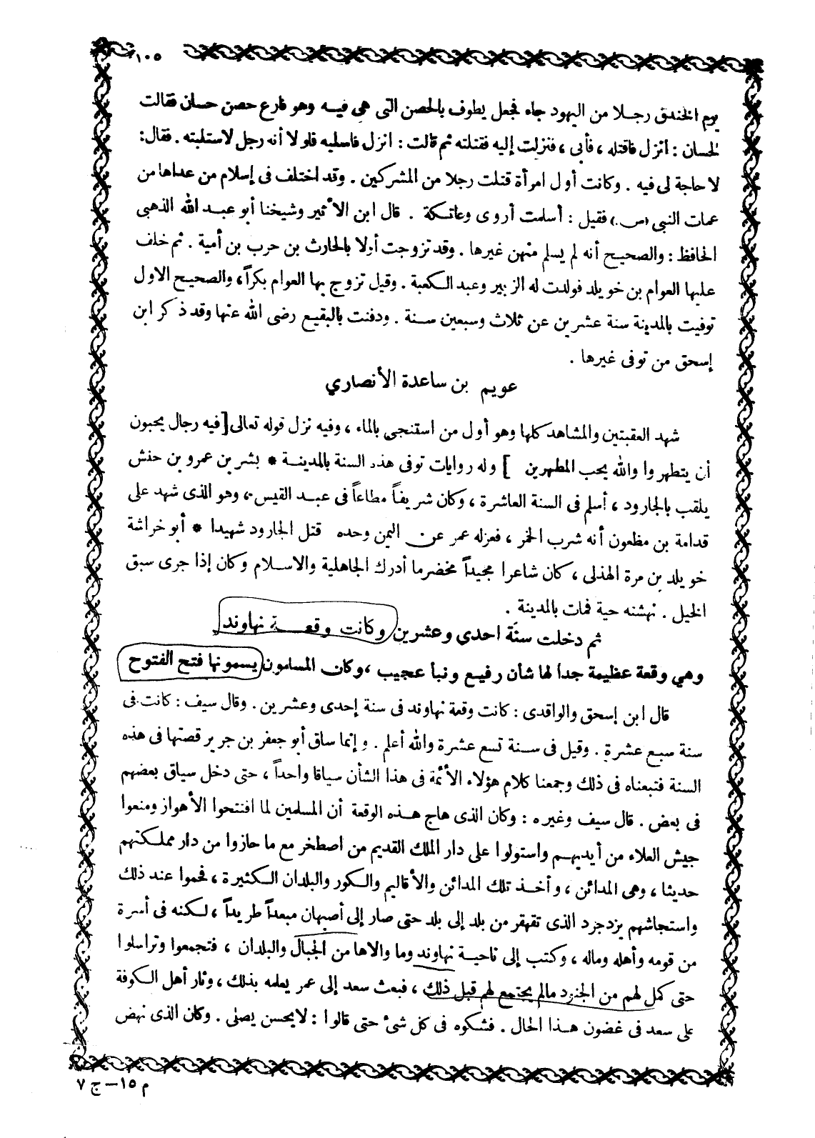 ثُمَّ دَخَلَتْ سنة إحدى وعشرين فَفِيهَا كَانَتْ وَقْعَةُ نَهَاوَنْدَ وَفَتْحُهَا عَلَى الْمَشْهُورِ