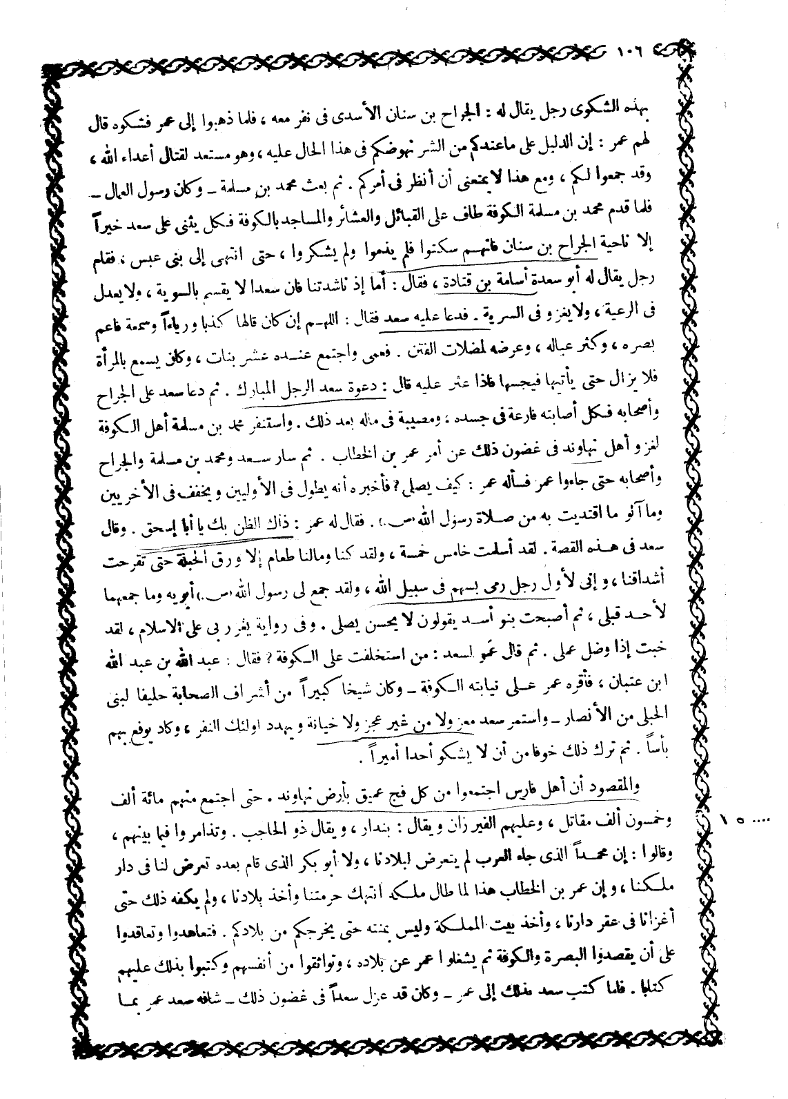 بِهَذِهِ الشَّكْوَى رَجُلٌ يُقَالُ لَهُ: الْجَرَّاحُ بْنُ سِنَانٍ الْأَسَدِيُّ فِي نَفَرٍ مَعَهُ، فَلَمَّا ذَهَبُوا إلى عمر فشكوه قال لهم عمر: إن الدليل على ما عندكم من الشر نُهُوضُكُمْ فِي هَذَا الْحَالِ عَلَيْهِ، وَهُوَ مُسْتَعِدٌّ لقتال أعداء الله، وقد جمعوا لَكُمْ، وَمَعَ هَذَا لَا يَمْنَعُنِي أَنْ أَنْظُرَ فِي أَمْرِكُمْ. ثُمَّ بَعَثَ مُحَمَّدَ بْنَ مَسْلَمَةَ- وَكَانَ رَسُولَ الْعُمَّالِ- فَلَمَّا قَدِمَ مُحَمَّدُ بْنُ مَسْلَمَةَ الْكُوفَةَ طَافَ عَلَى الْقَبَائِلِ وَالْعَشَائِرِ وَالْمَسَاجِدِ بِالْكُوفَةِ فَكُلٌّ يُثْنِي عَلَى سَعْدٍ خَيْرًا إِلَّا نَاحِيَةَ الْجَرَّاحِ بْنِ سِنَانَ فَإِنَّهُمْ سَكَتُوا فَلَمْ يَذُمُّوا وَلَمْ يَشْكُرُوا، حَتَّى انْتَهَى إِلَى بَنِي عَبْسٍ، فَقَامَ رَجُلٌ يُقَالُ لَهُ أَبُو سَعْدَةَ أُسَامَةُ بْنُ قَتَادَةَ، فقال: أما إذ ناشدتنا فَإِنَّ سَعْدًا لَا يَقْسِمُ بِالسَّوِيَّةِ، وَلَا يَعْدِلُ فِي الرَّعِيَّةِ، وَلَا يَغْزُو فِي السَّرِيَّةِ. فَدَعَا عَلَيْهِ سَعْدٌ فَقَالَ: اللَّهمّ إِنْ كَانَ قَالَهَا كذبا ورياء وسمعة فأعم بصره، وكثر عِيَالَهُ، وَعَرِّضْهُ لِمُضِلَّاتِ الْفِتَنِ. فَعَمِيَ وَاجْتَمَعَ عِنْدَهُ عَشْرُ بَنَاتٍ، وَكَانَ يَسْمَعُ بِالْمَرْأَةِ فَلَا يَزَالُ حَتَّى يَأْتِيَهَا فَيَجُسَّهَا فَإِذَا عُثِرَ عَلَيْهِ قَالَ: دَعْوَةُ سَعْدٍ الرَّجُلِ الْمُبَارَكِ. ثُمَّ دَعَا سَعْدٌ على الجراح وأصحابه فكل أصابته فارعة فِي جَسَدِهِ، وَمُصِيبَةٌ فِي مَالِهِ بَعْدَ ذَلِكَ، وَاسْتَنْفَرَ مُحَمَّدُ بْنُ مَسْلَمَةَ أَهْلَ الْكُوفَةِ لِغَزْوِ أهل نهاوند في غضون ذَلِكَ عَنْ أَمْرِ عُمَرَ بْنِ الْخَطَّابِ. ثُمَّ سَارَ سَعْدٌ وَمُحَمَّدُ بْنُ مَسْلَمَةَ وَالْجَرَّاحُ وَأَصْحَابُهُ حَتَّى جَاءُوا عُمَرَ فَسَأَلَهُ عُمَرُ: كَيْفَ يُصَلِّي؟ فَأَخْبَرَهُ أَنَّهُ يَطُولُ فِي الْأُولَيَيْنِ وَيُخَفِّفُ فِي الْأُخْرَيَيْنِ وَمَا آلُو مَا اقْتَدَيْتُ بِهِ مِنْ صَلَاةِ رَسُولِ اللَّهِ صَلَّى اللَّهُ عَلَيْهِ وَسَلَّمَ. فَقَالَ لَهُ عُمَرُ: ذَاكَ الظَّنُّ بِكَ يَا أبا إسحاق. وقال سعد في هذه القصة. لَقَدْ أَسْلَمْتُ خَامِسَ خَمْسَةٍ، وَلَقَدْ كُنَّا وَمَا لَنَا طَعَامٌ إِلَّا وَرَقُ الْحُبْلَةِ حَتَّى تَقَرَّحَتْ أَشْدَاقُنَا، وَإِنِّي لَأَوَّلُ رَجُلٍ رَمَى بِسَهْمٍ فِي سَبِيلِ اللَّهِ، وَلَقَدْ جَمَعَ لِي رَسُولُ اللَّهِ صَلَّى اللَّهُ عَلَيْهِ وَسَلَّمَ أَبَوَيْهِ وَمَا جَمَعَهُمَا لِأَحَدٍ قَبْلِي، ثُمَّ أَصْبَحَتْ بَنُو أَسَدٍ يَقُولُونَ لَا يُحْسِنُ يُصَلِّي. وَفِي رواية يغرر بى عَلَى الْإِسْلَامِ، لَقَدْ خِبْتُ إِذًا وَضَلَّ عَمَلِي. ثُمَّ قَالَ عُمَرُ لِسَعْدٍ: مَنِ اسْتَخْلَفْتَ عَلَى الْكُوفَةِ؟ فَقَالَ: عَبْدَ اللَّهِ بْنَ عَبْدِ اللَّهِ ابن عِتْبَانَ، فَأَقَرَّهُ عُمَرُ عَلَى نِيَابَتِهِ الْكُوفَةَ- وَكَانَ شَيْخًا كَبِيرًا مِنْ أَشْرَافِ الصَّحَابَةِ حَلِيفًا لِبَنِي الْحُبْلَى مِنَ الْأَنْصَارِ- وَاسْتَمَرَّ سَعْدٌ مَعْزُولًا مِنْ غير عجز ولا خيانة ويهدد أُولَئِكَ النَّفَرَ، وَكَادَ يُوقِعُ بِهِمْ بَأْسًا. ثُمَّ تَرَكَ ذَلِكَ خَوْفًا مِنْ أَنْ لَا يَشْكُوَ أحدا أَمِيرًا.