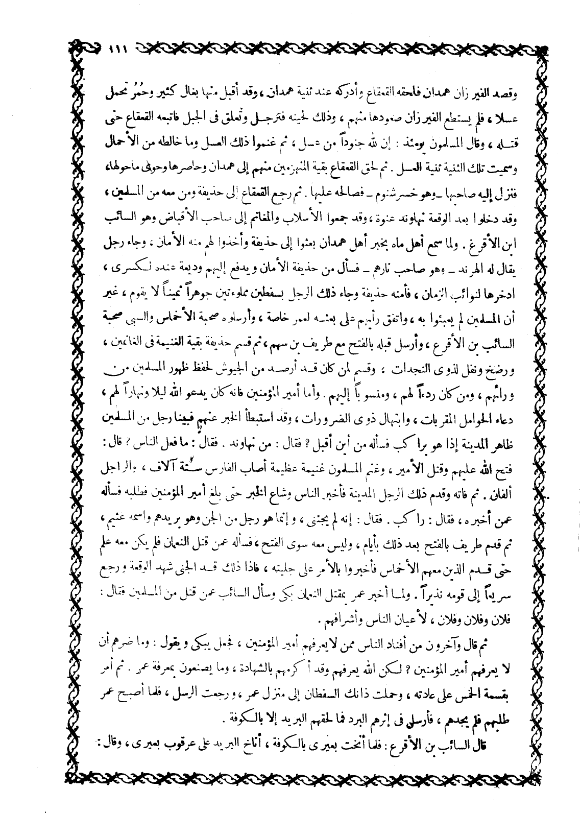 فَتَحَ اللَّهُ عَلَيْهِمْ وَقُتِلَ الْأَمِيرُ، وَغَنِمَ الْمُسْلِمُونَ غَنِيمَةً عَظِيمَةً أَصَابَ الْفَارِسُ سِتَّةَ آلَافٍ، وَالرَّاجِلُ أَلْفَانِ. ثُمَّ فَاتَهُ وَقَدِمَ ذَلِكَ الرَّجُلِ الْمَدِينَةَ فأخبر النَّاسُ وَشَاعَ الْخَبَرُ حَتَّى بَلَغَ أَمِيرَ الْمُؤْمِنِينَ فَطَلَبَهُ فَسَأَلَهُ عَمَّنْ أَخْبَرَهُ، فَقَالَ: رَاكِبٌ. فَقَالَ: إِنَّهُ لَمْ يَجِئْنِي، وَإِنَّمَا هُوَ رَجُلٌ مِنَ الْجِنِّ وَهُوَ بَرِيدُهُمْ وَاسْمُهُ عُثَيْمٌ، ثُمَّ قَدِمَ طَرِيفٌ بِالْفَتْحِ بَعْدَ ذَلِكَ بِأَيَّامٍ، وَلَيْسَ مَعَهُ سوى الفتح، فسأله عَمَّنْ قَتَلَ النُّعْمَانَ فَلَمْ يَكُنْ مَعَهُ عِلْمٌ حَتَّى قَدِمَ الَّذِينَ مَعَهُمُ الْأَخْمَاسُ فَأَخْبَرُوا بِالْأَمْرِ على جليته، فإذا ذلك قد الجنى شَهِدَ الْوَقْعَةَ وَرَجَعَ سَرِيعًا إِلَى قَوْمِهِ نَذِيرًا. وَلَمَّا أُخْبِرَ عُمَرَ بِمَقْتَلِ النُّعْمَانِ بَكَى وَسَأَلَ السَّائِبَ عَمَّنْ قُتِلَ مِنَ الْمُسْلِمِينَ فَقَالَ: