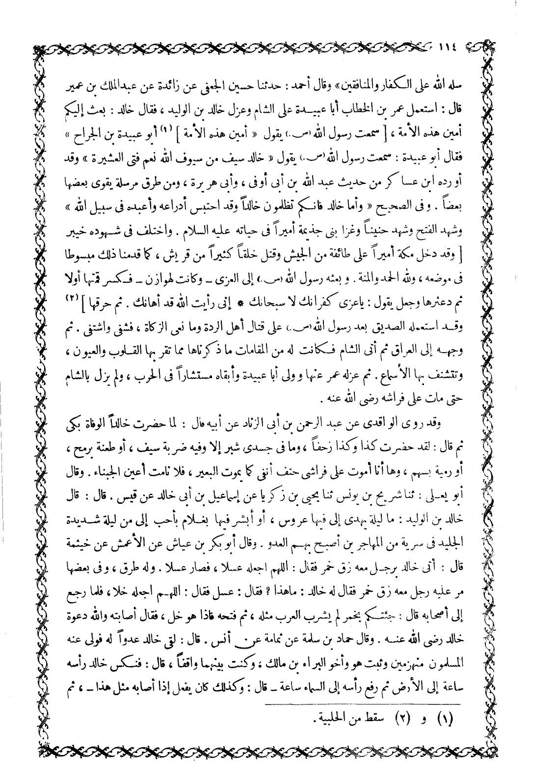 سَلَّهُ اللَّهُ عَلَى الْكُفَّارِ وَالْمُنَافِقِينَ» وَقَالَ أَحْمَدُ: حَدَّثَنَا حُسَيْنٌ الْجُعْفِيُّ عَنْ زَائِدَةَ عَنْ عَبْدِ الْمَلِكِ بْنِ عُمَيْرٍ قَالَ: اسْتَعْمَلَ عُمَرُ بْنُ الْخَطَّابِ أَبَا عُبَيْدَةَ عَلَى الشَّامِ وَعَزَلَ خَالِدَ بن الوليد، فقال خالد: بعث إليكم أَمِينَ هَذِهِ الْأُمَّةِ، [سَمِعْتُ رَسُولَ اللَّهِ صَلَّى اللَّهُ عَلَيْهِ وَسَلَّمَ يَقُولُ «أَمِينُ هَذِهِ الْأُمَّةِ] [1] أَبُو عُبَيْدَةَ بْنُ الْجَرَّاحِ» فَقَالَ أَبُو عُبَيْدَةَ: سَمِعْتُ رَسُولَ اللَّهِ صَلَّى اللَّهُ عَلَيْهِ وَسَلَّمَ: يَقُولُ «خَالِدٌ سَيْفٌ مِنْ سُيُوفِ اللَّهِ نِعْمَ فَتَى الْعَشِيرَةِ» وَقَدْ أَوْرَدَهُ ابْنُ عَسَاكِرَ مِنْ حَدِيثِ عَبْدِ اللَّهِ بْنِ أَبِي أَوْفَى، وَأَبِي هُرَيْرَةَ، وَمِنْ طُرُقٍ مُرْسَلَةٍ يُقَوِّي بَعْضُهَا بَعْضًا. وَفِي الصَّحِيحِ «وَأَمَّا خَالِدٌ فَإِنَّكُمْ تَظْلِمُونَ خَالِدًا وقد احتبس أدراعه وأعبده فِي سَبِيلِ اللَّهِ» وَشَهِدَ الْفَتْحَ وَشَهِدَ حُنَيْنًا وَغَزَا بَنِي جَذِيمَةَ أَمِيرًا فِي حَيَاتِهِ عَلَيْهِ السّلام. وَاخْتُلِفَ فِي شُهُودِهِ خَيْبَرَ [وَقَدْ دَخَلَ مَكَّةَ أَمِيرًا عَلَى طَائِفَةٍ مِنَ الْجَيْشِ وَقَتَلَ خَلْقًا كَثِيرًا مِنْ قُرَيْشٍ، كَمَا قَدَّمْنَا ذَلِكَ مَبْسُوطًا فِي مَوْضِعِهِ، وللَّه الْحَمْدُ وَالْمِنَّةُ. وَبَعَثَهُ رَسُولُ اللَّهِ صَلَّى اللَّهُ عَلَيْهِ وَسَلَّمَ إِلَى الْعُزَّى- وكانت لهوازن- فكسر قمتها أولا ثم دعثرها وجعل يقول: يا عزى كُفْرَانَكِ لَا سُبْحَانَكِ إِنِّي رَأَيْتُ اللَّهَ قَدْ أَهَانَكِ. ثُمَّ حَرَّقَهَا] [2] وَقَدِ اسْتَعْمَلَهُ الصِّدِّيقُ بَعْدَ رَسُولِ اللَّهِ صَلَّى اللَّهُ عَلَيْهِ وَسَلَّمَ على قِتَالِ أَهْلِ الرِّدَّةِ وَمَانِعِي الزَّكَاةِ، فَشَفَى وَاشْتَفَى. ثم وجهه إلى العراق ثم أتى الشَّامِ فَكَانَتْ لَهُ مِنَ الْمَقَامَاتِ مَا ذَكَرْنَاهَا مما تقربها الْقُلُوبُ وَالْعُيُونُ، وَتَتَشَنَّفُ بِهَا الْأَسْمَاعُ. ثُمَّ عَزَلَهُ عُمَرُ عَنْهَا وَوَلَّى أَبَا عُبَيْدَةَ وَأَبْقَاهُ مُسْتَشَارًا فِي الْحَرْبِ، وَلَمْ يَزَلْ بِالشَّامِ حَتَّى مَاتَ عَلَى فِرَاشِهِ رَضِيَ اللَّهُ عَنْهُ.