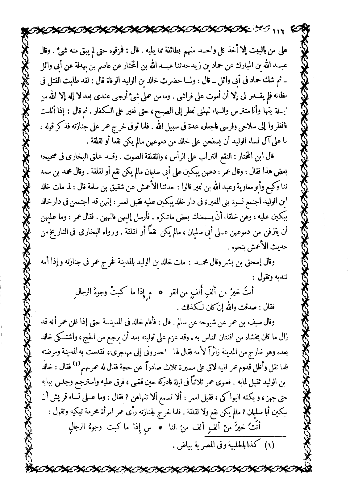 ما على آل نساء الْوَلِيدِ أَنْ يَسْفَحْنَ عَلَى خَالِدٍ مِنْ دُمُوعِهِنَّ مَا لَمْ يَكُنْ نَقْعًا أَوْ لَقْلَقَةً.