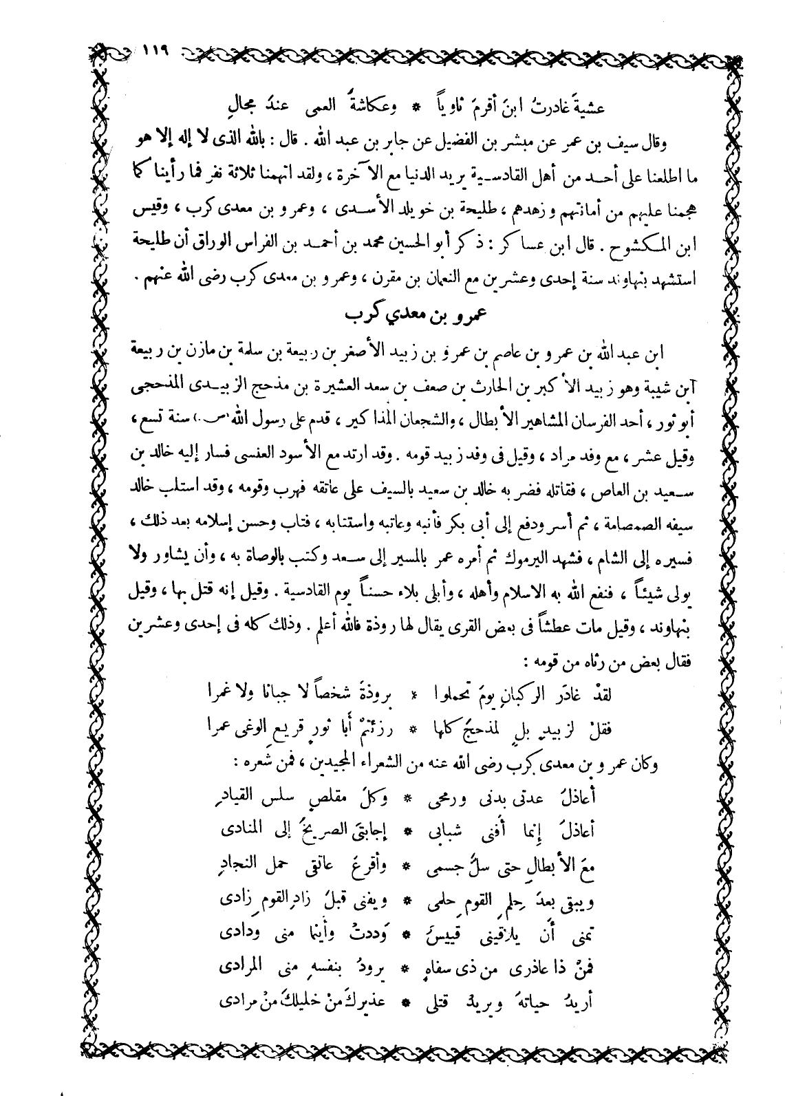 ابن عبد الله بن عمرو بن عاصم بن عمرو بن زبيد الأصغر بْنُ رَبِيعَةَ بْنِ سَلَمَةَ بْنِ مَازِنَ بْنِ ربيعة ابن شيبة وهو زبيد الأكبر بن الحارث بن صعف بْنِ سَعْدِ الْعَشِيرَةِ بْنِ مُذْحِجٍ الزُّبَيْدِيُّ الْمُذْحِجِيُّ أَبُو ثَوْرٍ، أَحَدُ الْفُرْسَانِ الْمَشَاهِيرِ الْأَبْطَالِ، وَالشُّجْعَانِ الْمَذَاكِيرِ، قَدِمَ عَلَى رَسُولِ اللَّهِ صَلَّى اللَّهُ عَلَيْهِ وَسَلَّمَ سَنَةَ تِسْعٍ، وَقِيلَ عَشْرٍ، مَعَ وَفْدِ مُرَادٍ، وَقِيلَ فِي وَفْدِ زُبَيْدٍ قَوْمِهِ. وَقَدِ ارْتَدَّ مَعَ الْأَسْوَدِ الْعَنْسِيِّ فَسَارَ إِلَيْهِ خَالِدُ بْنُ سَعِيدِ بْنِ الْعَاصِ، فَقَاتَلَهُ فَضَرَبَهُ خَالِدُ بْنُ سَعِيدٍ بِالسَّيْفِ عَلَى عَاتِقِهِ فَهَرَبَ وَقَوْمُهُ، وَقَدِ اسْتَلَبَ خَالِدٌ سَيْفَهُ الصَّمْصَامَةَ، ثُمَّ أُسِرَ وَدُفِعَ إِلَى أَبِي بَكْرٍ فَأَنَّبَهُ وَعَاتَبَهُ واستنابه، فتاب وَحَسُنَ إِسْلَامُهُ بَعْدَ ذَلِكَ، فَسَيَّرَهُ إِلَى الشَّامِ، فَشَهِدَ الْيَرْمُوكَ ثُمَّ أَمَرَهُ عُمَرُ بِالْمَسِيرِ إِلَى سَعْدٍ وَكَتَبَ بِالْوَصَاةِ بِهِ، وَأَنْ يُشَاوَرَ وَلَا يُوَلَّى شَيْئًا، فَنَفَعَ اللَّهُ بِهِ الْإِسْلَامَ وَأَهْلَهُ، وَأَبْلَى بَلَاءً حَسَنًا يَوْمَ الْقَادِسِيَّةِ. وَقِيلَ إِنَّهُ قُتِلَ بِهَا، وَقِيلَ بِنَهَاوَنْدَ، وَقِيلَ مَاتَ عَطَشًا فِي بَعْضِ الْقُرَى يُقَالُ لَهَا رَوْذَةُ فاللَّه أعلم. وذلك كله في إِحْدَى وَعِشْرِينَ فَقَالَ بَعْضُ مَنْ رَثَاهُ مَنْ قَوْمِهِ: