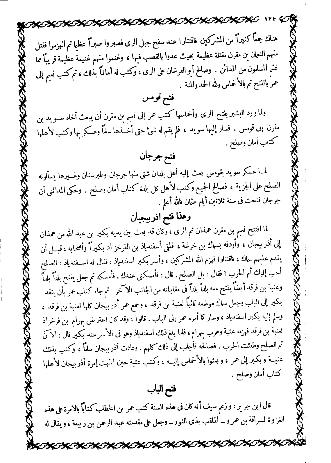 لَمَّا افْتَتَحَ نُعَيْمُ بْنُ مُقَرِّنٍ هَمَذَانَ ثُمَّ الرَّيَّ، وَكَانَ قَدْ بَعَثَ بَيْنَ يَدَيْهِ بُكَيْرَ بْنَ عَبْدِ اللَّهِ مِنْ هَمَذَانَ إِلَى أَذْرَبِيجَانَ، وَأَرْدَفَهُ بِسِمَاكِ بْنِ خَرَشَةَ، فلقى أسفنديار بْنُ الْفَرُّخْزَاذِ بُكَيْرًا وَأَصْحَابَهُ، قَبْلَ أَنْ يَقْدَمَ عَلَيْهِمْ سِمَاكٌ، فَاقْتَتَلُوا فَهَزَمَ اللَّهُ الْمُشْرِكِينَ، وَأَسَرَ بُكَيْرٌ إِسْفَنْدِيَاذَ، فَقَالَ لَهُ إِسْفَنْدِيَاذُ: الصُّلْحُ أَحَبُّ إِلَيْكَ أَمِ الْحَرْبُ؟ فَقَالَ: بَلِ الصُّلْحُ. قَالَ: فَأَمْسِكْنِي عِنْدَكَ. فَأَمْسَكَهُ ثُمَّ جَعَلَ يَفْتَحُ بَلَدًا بَلَدًا وَعُتْبَةُ بْنُ فَرْقَدٍ أَيْضًا يَفْتَحُ مَعَهُ بَلَدًا بَلَدًا فِي مُقَابَلَتِهِ مِنَ الْجَانِبِ الْآخَرِ. ثُمَّ جَاءَ كِتَابُ عُمَرَ بِأَنْ يَتَقَدَّمَ بُكَيْرٌ إِلَى الْبَابِ وَجَعْلِ سِمَاكٍ مَوْضِعَهُ نَائِبًا لِعُتْبَةَ بْنِ فَرْقَدٍ، وَجَمَعَ عُمَرُ أَذْرَبِيجَانَ كُلَّهَا لِعُتْبَةَ بن فرقد، وسلم إليه بكير اسفندياذ، وسار كَمَا أَمَرَهُ عُمَرُ إِلَى الْبَابِ. قَالُوا: وَقَدْ كَانَ اعْتَرَضَ بَهْرَامُ بْنُ فَرُّخْزَاذَ لِعُتْبَةَ بْنِ فَرْقَدٍ فَهَزَمَهُ عُتْبَةُ وَهَرَبَ بَهْرَامُ، فَلَمَّا بَلَغَ ذَلِكَ إِسْفَنْدِيَاذَ وَهُوَ فِي الْأَسْرِ عِنْدَ بُكَيْرٍ قَالَ: الْآنَ تَمَّ الصُّلْحُ وَطَفِئَتِ الْحَرْبُ. فَصَالَحَهُ فَأَجَابَ إِلَى ذَلِكَ كُلُّهُمْ. وَعَادَتْ أَذْرَبِيجَانُ سِلْمًا، وَكَتَبَ بِذَلِكَ عُتْبَةُ وَبُكَيْرٌ إِلَى عُمَرَ، وَبَعَثُوا بالأخماس إليه، وكتب عتبة حين انتهت إِمْرَةُ أَذْرَبِيجَانَ لِأَهْلِهَا كِتَابَ أَمَانٍ وَصُلْحٍ.