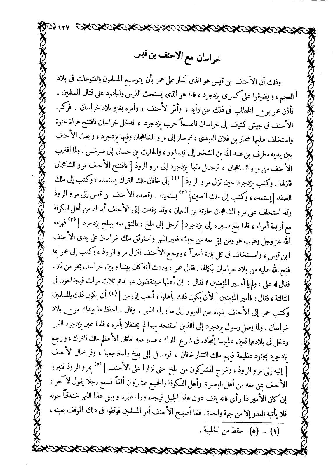 فَأَذِنَ عُمَرُ بْنُ الْخَطَّابِ فِي ذَلِكَ عَنْ رَأْيِهِ، وَأَمَّرَ الْأَحْنَفَ، وَأَمَرَهُ بِغَزْوِ بِلَادِ خُرَاسَانَ. فَرَكِبَ الْأَحْنَفُ فِي جَيْشٍ كَثِيفٍ إِلَى خُرَاسَانَ قَاصِدًا حَرْبَ يَزْدَجِرْدَ، فَدَخَلَ خُرَاسَانَ فَافْتَتَحَ هَرَاةَ عَنْوَةً وَاسْتَخْلَفَ عَلَيْهَا صُحَارَ بْنَ فُلَانٍ الْعَبْدِيَّ، ثُمَّ سَارَ إِلَى مَرْوِ الشَّاهِجَانِ وَفِيهَا يَزْدَجِرْدُ، وَبَعَثَ الْأَحْنَفُ بَيْنَ يَدَيْهِ مُطَرِّفَ بْنَ عَبْدِ اللَّهِ بْنِ الشِّخِّيرِ إِلَى نَيْسَابُورَ، وَالْحَارِثَ بْنَ حَسَّانَ إِلَى سَرْخَسَ. وَلَمَّا اقْتَرَبَ الْأَحْنَفُ مِنْ مَرْوِ الشَّاهِجَانِ، تَرَحَّلَ مِنْهَا يزدجرد إلى مروالروذ [فَافْتَتَحَ الْأَحْنَفُ مَرْوَ الشَّاهِجَانِ فَنَزَلَهَا. وَكَتَبَ يَزْدَجِرْدُ حين نزل مروالروذ] [1] إِلَى خَاقَانَ مَلِكِ التُّرْكِ يَسْتَمِدُّهُ، وَكَتَبَ إِلَى ملك الصفد [يَسْتَمِدُّهُ، وَكَتَبَ إِلَى مَلِكِ الصِّينِ] [2] يَسْتَعِينُهُ. وَقَصَدَهُ الأحنف بن قيس إلى مروالروذ وَقَدِ اسْتَخْلَفَ عَلَى مَرْوِ الشَّاهِجَانِ حَارِثَةَ بْنَ النُّعْمَانِ، وَقَدْ وَفَدَتْ إِلَى الْأَحْنَفِ أَمْدَادٌ مِنْ أَهْلِ الْكُوفَةِ مَعَ أَرْبَعَةِ أُمَرَاءَ، فَلَمَّا بَلَغَ مسيره إلى يزدجرد [ترحل إِلَى بَلْخَ، فَالْتَقَى مَعَهُ بِبَلْخَ يَزْدَجِرْدُ] [3] فَهَزَمَهُ اللَّهُ عَزَّ وَجَلَّ وَهَرَبَ هُوَ وَمَنْ بَقِيَ مَعَهُ مِنْ جَيْشِهِ فَعَبَرَ النَّهْرَ وَاسْتَوْثَقَ مُلْكُ خراسان على يدي الأحنف ابن قَيْسٍ، وَاسْتَخْلَفَ فِي كُلِّ بَلْدَةٍ أَمِيرًا، وَرَجَعَ الأحنف فنزل مروالروذ، وَكَتَبَ إِلَى عُمَرَ بِمَا فَتَحَ اللَّهُ عَلَيْهِ مِنْ بِلَادِ خُرَاسَانَ بِكَمَالِهَا. فَقَالَ عُمَرُ: وَدِدْتُ أَنَّهُ كَانَ بَيْنَنَا وَبَيْنَ خُرَاسَانَ بَحْرٌ مِنْ نَارٍ.
