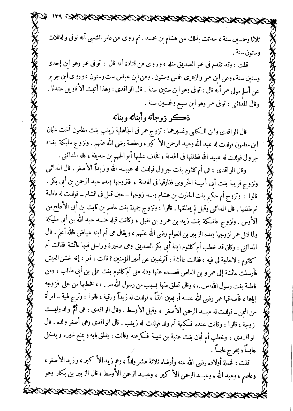 قَالُوا: وَتَزَوَّجَ أُمَّ حَكِيمِ بِنْتَ الْحَارِثِ بْنِ هِشَامٍ بَعْدَ زَوْجِهَا- حِينَ قُتِلَ فِي الشَّامِ- فَوَلَدَتْ لَهُ فَاطِمَةَ ثُمَّ طَلَّقَهَا. قَالَ الْمَدَائِنِيُّ وَقِيلَ لم يطلقها. قالوا: وتزوج جميلة بنت عَاصِمِ بْنِ ثَابِتِ بْنِ أَبِي الْأَفْلَحِ مِنَ الْأَوْسِ. وَتَزَوَّجَ عَاتِكَةُ بِنْتُ زَيْدِ بْنِ عَمْرِو بْنِ نُفَيْلٍ، وَكَانَتْ قَبْلَهُ عِنْدَ عَبْدِ اللَّهِ بن أبى مليكة وَلَمَّا قُتِلَ عُمَرُ تَزَوَّجَهَا بَعْدَهُ الزُّبَيْرُ بْنُ الْعَوَّامِ رَضِيَ اللَّهُ عَنْهُمْ، وَيُقَالُ هِيَ أُمُّ ابْنِهِ عِيَاضٍ فاللَّه أَعْلَمُ. قَالَ الْمَدَائِنِيُّ: وَكَانَ قد خطب أم كلثوم ابنة أَبِي بَكْرٍ الصِّدِّيقِ وَهِيَ صَغِيرَةٌ وَرَاسَلٌ فِيهَا عَائِشَةَ فَقَالَتْ أُمُّ كُلْثُومٍ: لَا حَاجَةَ لِي فِيهِ، فَقَالَتْ عَائِشَةُ: أَتَرْغَبِينَ عَنْ أَمِيرِ الْمُؤْمِنِينَ؟ قَالَتْ: نَعَمْ، إِنَّهُ خَشِنُ الْعَيْشِ فَأَرْسَلَتْ عَائِشَةُ إِلَى عَمْرِو بْنِ الْعَاصِ فَصَدَّهُ عَنْهَا وَدَلَّهُ عَلَى أُمِّ كُلْثُومٍ بِنْتِ عَلِيِّ بْنِ أَبِي طَالِبٍ، وَمِنْ فَاطِمَةُ بِنْتُ رَسُولِ اللَّهِ صَلَّى اللَّهُ عَلَيْهِ وَسَلَّمَ، وَقَالَ تَعْلَقُ مِنْهَا بِسَبَبٍ مِنْ رَسُولِ اللَّهِ صَلَّى اللَّهُ عَلَيْهِ وَسَلَّمَ، فَخَطَبَهَا مِنْ عَلِيٍّ فَزَوَّجَهُ إِيَّاهَا، فَأَصْدَقَهَا عُمَرُ رَضِيَ اللَّهُ عَنْهُ أَرْبَعِينَ أَلْفًا، فَوَلَدَتْ لَهُ زَيْدًا وَرُقَيَّةَ، قَالُوا: وَتَزَوَّجَ لُهَيَّةَ- امْرَأَةً مِنَ الْيَمَنِ- فَوَلَدَتْ لَهُ عَبْدَ الرَّحْمَنِ الْأَصْغَرَ، وَقِيلَ الْأَوْسَطَ. وَقَالَ الْوَاقِدِيُّ: هِيَ أُمُّ وَلَدٍ وَلَيْسَتْ بِزَوْجَةٍ، قَالُوا: وَكَانَتْ عِنْدَهُ فُكَيْهَةُ أُمُّ وَلَدٍ فَوَلَدَتْ لَهُ زَيْنَبَ. قَالَ الْوَاقِدِيُّ وَهِيَ أَصْغَرُ وَلَدِهِ. قَالَ الْوَاقِدِيُّ: وَخَطَبَ أُمَّ أَبَانَ بِنْتَ عتبة بن شيبة فَكَرِهَتْهُ وَقَالَتْ: يُغْلِقُ بَابَهُ وَيَمْنَعُ خَيْرَهُ وَيَدْخُلُ عَابِسًا وَيَخْرُجُ عَابِسًا.