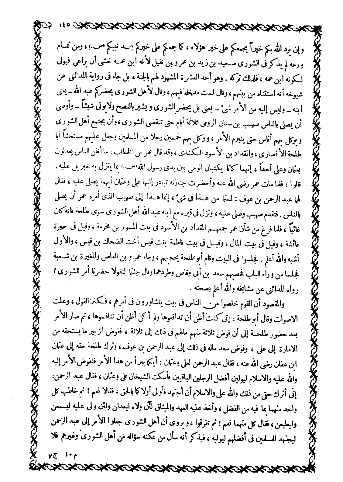 وَإِنْ يُرِدِ اللَّهُ بِكُمْ خَيْرًا يَجْمَعْكُمْ عَلَى خَيْرِ هَؤُلَاءِ، كَمَا جَمَعَكُمْ عَلَى خَيْرِكُمْ بَعْدَ نَبِيِّكُمْ صَلَّى اللَّهُ عَلَيْهِ وَسَلَّمَ، وَمِنْ تَمَامِ ورعه لم يذكر في الشُّورَى سَعِيدِ بْنِ زَيْدِ بْنِ عَمْرِو بْنِ نُفَيْلٍ لِأَنَّهُ ابْنُ عَمِّهِ خَشِيَ أَنْ يُرَاعَى فَيُوَلَّى لِكَوْنِهِ ابْنَ عَمِّهِ، فَلِذَلِكَ تَرَكَهُ. وَهُوَ أَحَدُ الْعَشْرَةِ الْمَشْهُودِ لَهُمْ بِالْجَنَّةِ، بَلْ جَاءَ فِي رِوَايَةِ الْمَدَائِنِيِّ عَنْ شُيُوخِهِ أَنَّهُ اسْتَثْنَاهُ مِنْ بَيْنِهِمْ، وَقَالَ لَسْتُ مُدْخِلَهُ فِيهِمْ، وَقَالَ لِأَهْلِ الشُّورَى يَحْضُرُكُمْ عَبْدُ اللَّهِ- يَعْنِي ابْنَهُ- وليس إليه من الأمر شيء- يعنى بَلْ يَحْضُرُ الشُّورَى وَيُشِيرُ بِالنُّصْحِ وَلَا يُوَلَّى شَيْئًا- وَأَوْصَى أَنْ يُصَلِّيَ بِالنَّاسِ صُهَيْبُ بْنُ سِنَانٍ الرُّومِيُّ ثَلَاثَةَ أَيَّامٍ حَتَّى تَنْقَضِيَ الشُّورَى، وَأَنْ يَجْتَمِعَ أَهْلُ الشُّورَى وَيُوَكَّلَ بِهِمْ أُنَاسٌ حَتَّى يَنْبَرِمَ الْأَمْرُ، وَوَكَّلَ بِهِمْ خَمْسِينَ رَجُلًا مِنَ الْمُسْلِمِينَ وَجَعَلَ عَلَيْهِمْ مُسْتَحِثًّا أَبَا طَلْحَةَ الْأَنْصَارِيَّ، وَالْمِقْدَادَ بْنَ الْأُسُودِ الْكِنْدِيَّ، وَقَدْ قَالَ عُمَرُ بْنُ الْخَطَّابِ: مَا أَظُنُّ النَّاسَ يَعْدِلُونَ بِعُثْمَانَ وَعَلِيٍّ أَحَدًا، إِنَّهُمَا كَانَا يَكْتُبَانِ الْوَحْيَ بَيْنَ يَدَيْ رَسُولِ اللَّهِ صَلَّى اللَّهُ عَلَيْهِ وَسَلَّمَ بِمَا يَنْزِلُ بِهِ جِبْرِيلُ عَلَيْهِ.
