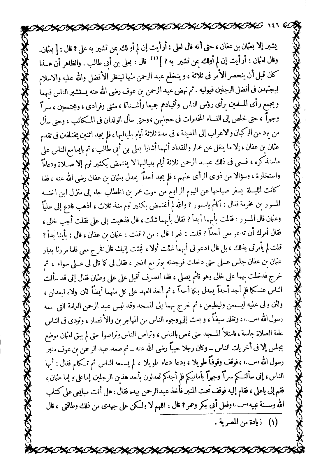 قُلْتُ لم يأمرني بذلك، بل قال أدعو لي أَيَّهُمَا شِئْتَ أَوَّلًا، فَجِئْتُ إِلَيْكَ قَالَ فَخَرَجَ مَعِي فَلَمَّا مَرَرْنَا بِدَارِ عُثْمَانَ بْنِ عَفَّانَ جَلَسَ عَلِيٌّ حَتَّى دَخَلْتُ فَوَجَدْتُهُ يُوتِرُ مَعَ الفجر، فَقَالَ لِي كَمَا قَالَ لِي عَلِيٌّ سَوَاءً، ثُمَّ خَرَجَ فَدَخَلْتُ بِهِمَا عَلَى خَالِي وَهُوَ قَائِمٌ يُصَلِّي، فَلَمَّا انْصَرَفَ أَقْبَلَ عَلَى عَلِيٍّ وعثمان فقال إنما قَدْ سَأَلْتُ النَّاسَ عَنْكُمَا فَلَمْ أَجِدْ أَحَدًا يَعْدِلُ بِكُمَا أَحَدًا، ثُمَّ أَخَذَ الْعَهْدَ عَلَى كُلٍّ مِنْهُمَا أَيْضًا لَئِنْ وَلَّاهُ لَيَعْدِلَنَّ، وَلَئِنْ وَلَّى عَلَيْهِ لَيَسْمَعَنَّ وَلِيُطِيعَنَّ، ثُمَّ خَرَجَ بِهِمَا إِلَى الْمَسْجِدِ وَقَدْ لَبِسَ عَبْدُ الرَّحْمَنِ الْعِمَامَةَ التي عممه رَسُولُ اللَّهِ صَلَّى اللَّهُ عَلَيْهِ وَسَلَّمَ، وَتَقَلَّدَ سَيْفًا، وَبَعَثَ إِلَى وُجُوهِ النَّاسِ مِنَ الْمُهَاجِرِينَ وَالْأَنْصَارِ، وَنُودِيَ فِي النَّاسِ عَامَّةً الصَّلَاةُ جَامِعَةٌ، فَامْتَلَأَ الْمَسْجِدُ حَتَّى غَصَّ بِالنَّاسِ، وَتَرَاصَّ النَّاسُ وَتَرَاصُّوا حَتَّى لَمْ يَبْقَ لِعُثْمَانَ مَوْضِعٌ يَجْلِسُ إِلَّا فِي أُخْرَيَاتِ النَّاسُ- وَكَانَ رَجُلًا حَيِيًّا رَضِيَ اللَّهُ عَنْهُ- ثُمَّ صَعِدَ عَبْدُ الرَّحْمَنِ بْنُ عَوْفٍ مِنْبَرَ رَسُولِ اللَّهِ صَلَّى اللَّهُ عَلَيْهِ وَسَلَّمَ، فَوَقَفَ وُقُوفًا طَوِيلًا، وَدَعَا دُعَاءً طَوِيلًا، لَمْ يَسْمَعْهُ النَّاسُ ثُمَّ تَكَلَّمَ فَقَالَ: أيها الناس، إني سألتكم سرا وجهرا بأمانيكم فَلَمْ أَجِدْكُمْ تَعْدِلُونَ بِأَحَدِ هَذَيْنِ الرَّجُلَيْنِ إِمَّا عَلِيٌّ وَإِمَّا عُثْمَانُ، فَقُمْ إِلَيَّ يَا عَلِيُّ، فَقَامَ إِلَيْهِ فَوَقَفَ تَحْتَ الْمِنْبَرِ فَأَخَذَ عَبْدُ الرَّحْمَنِ بِيَدِهِ فَقَالَ: هَلْ أَنْتَ مُبَايِعِي عَلَى كِتَابِ اللَّهِ وَسُنَّةَ نَبِيِّهِ صَلَّى اللَّهُ عَلَيْهِ وَسَلَّمَ وَفِعْلِ أَبِي بَكْرٍ وَعُمَرَ؟ قَالَ: اللَّهمّ لَا وَلَكِنْ عَلَى جُهْدِي مِنْ ذَلِكَ وَطَاقَتِي، قال