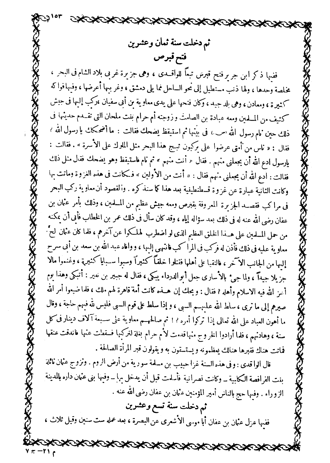 فَفِيهَا ذَكَرَ ابْنُ جَرِيرٍ فَتْحَ قُبْرُسَ تَبَعًا لِلْوَاقِدِيِّ، وَهِيَ جَزِيرَةٌ غَرْبِيُّ بِلَادِ الشَّامِ فِي الْبَحْرِ، مُخْلَصَةٌ وَحْدَهَا، وَلَهَا ذَنَبٌ مُسْتَطِيلٌ إِلَى نَحْوِ السَّاحِلِ مِمَّا يَلِي دِمَشْقَ، وَغَرْبِيُّهَا أَعْرَضُهَا، وَفِيهَا فَوَاكِهُ كَثِيرَةٌ، وَمَعَادِنُ، وَهِيَ بَلَدٌ جَيِّدٌ، وَكَانَ فَتْحُهَا عَلَى يَدَيْ مُعَاوِيَةَ بْنِ أَبِي سُفْيَانَ، رَكِبَ إِلَيْهَا فِي جَيْشٍ كَثِيفٍ مِنَ الْمُسْلِمِينَ وَمَعَهُ عُبَادَةُ بْنُ الصَّامِتِ وَزَوْجَتُهُ أُمُّ حَرَامٍ بِنْتُ مِلْحَانَ الَّتِي تَقَدَّمَ حَدِيثُهَا فِي ذَلِكَ حِينَ نَامَ رَسُولُ اللَّهِ صَلَّى اللَّهُ عَلَيْهِ وَسَلَّمَ فِي بَيْتِهَا ثُمَّ اسْتَيْقَظَ يَضْحَكُ فَقَالَتْ: مَا أَضْحَكَكَ يَا رَسُولَ اللَّهِ؟