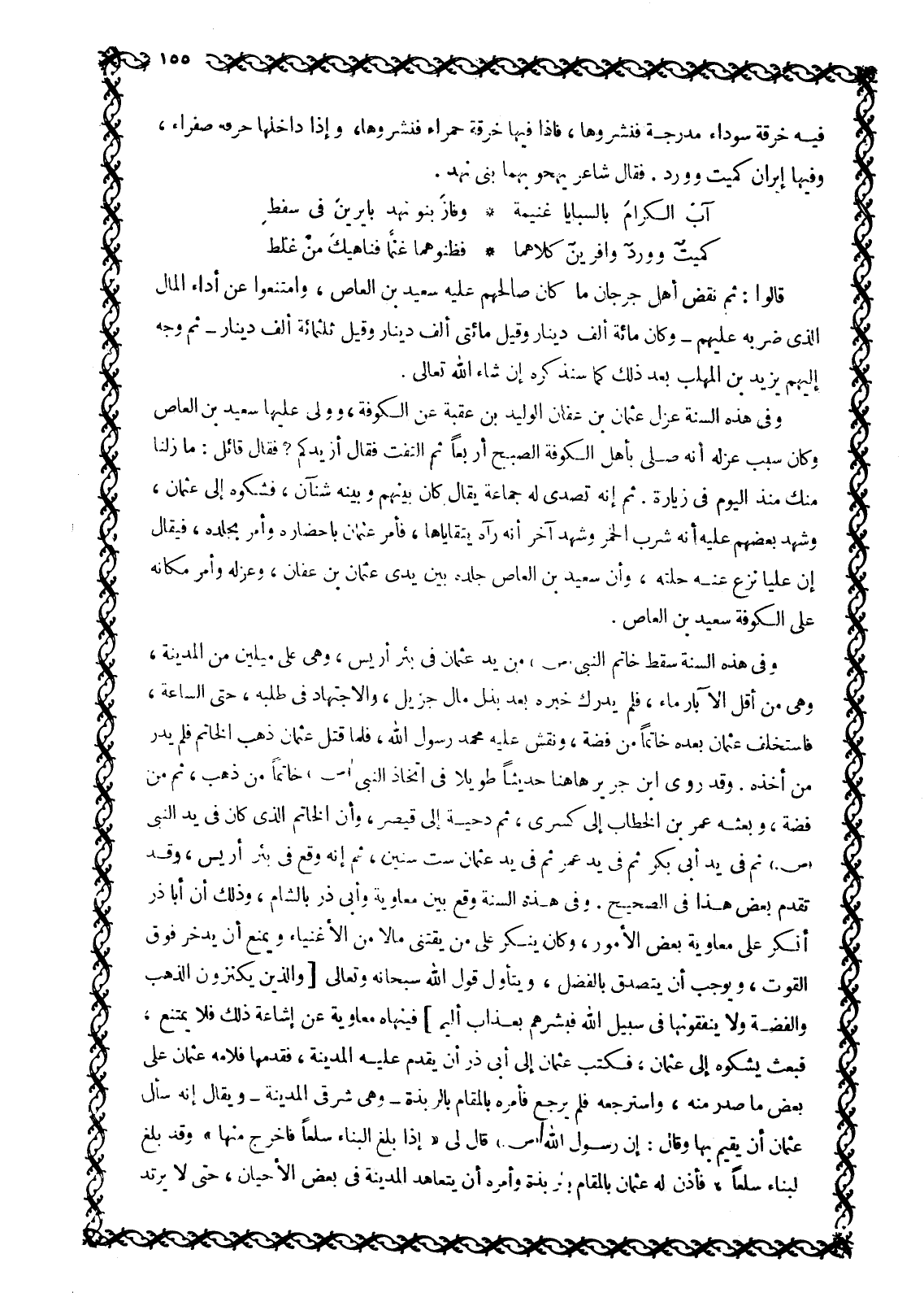 وَفِي هَذِهِ السَّنَةِ سَقَطَ خَاتَمُ النَّبِيِّ صَلَّى اللَّهُ عَلَيْهِ وَسَلَّمَ مِنْ يَدِ عُثْمَانَ فِي بِئْرِ أَرِيسٍ، وَهِيَ عَلَى مِيلَيْنِ مِنَ الْمَدِينَةِ، وَهِيَ مِنْ أَقَلِّ الْآبَارِ مَاءً، فَلَمْ يُدْرَكْ خَبَرُهُ بَعْدَ بَذْلِ مَالٍ جَزِيلٍ، وَالِاجْتِهَادِ فِي طَلَبِهِ، حَتَّى السَّاعَةَ، فَاسْتَخْلَفَ عُثْمَانُ بَعْدَهُ خَاتَمًا مِنْ فِضَّةٍ، وَنَقَشَ عَلَيْهِ مُحَمَّدٌ رَسُولُ الله، فلما قتل عثمان ذهب الخاتم فلم يدر مَنْ أَخَذَهُ. وَقَدْ رَوَى ابْنُ جَرِيرٍ هَاهُنَا حَدِيثًا طَوِيلًا فِي اتِّخَاذِ النَّبِيِّ صَلَّى اللَّهُ عَلَيْهِ وَسَلَّمَ خَاتَمًا مِنْ ذَهَبٍ، ثُمَّ مِنْ فِضَّةٍ، وَبَعَثِهِ عُمَرَ بْنَ الْخَطَّابِ إِلَى كِسْرَى، ثم دحية إلى قيصر، وأن الخاتم الّذي كَانَ فِي يَدِ النَّبِيِّ صَلَّى اللَّهُ عَلَيْهِ وَسَلَّمَ ثُمَّ فِي يَدِ أَبِي بَكْرٍ ثُمَّ فِي يَدِ عُمَرَ ثُمَّ فِي يَدِ عُثْمَانَ سِتَّ سِنِينَ، ثُمَّ إِنَّهُ وَقَعَ فِي بِئْرِ أَرِيسٍ، وَقَدْ تَقَدَّمَ بَعْضُ هَذَا فِي الصَّحِيحِ. وَفِي هَذِهِ السَّنَةِ وَقَعَ بَيْنَ مُعَاوِيَةَ وَأَبِي ذَرٍّ بِالشَّامِ، وَذَلِكَ أَنَّ أَبَا ذَرٍّ أَنْكَرَ عَلَى مُعَاوِيَةَ بَعْضَ الْأُمُورِ، وَكَانَ يُنْكِرُ عَلَى مَنْ يَقْتَنِي مَالًا مِنَ الْأَغْنِيَاءِ وَيَمْنَعُ أَنْ يَدَّخِرَ فَوْقَ الْقُوتِ، وَيُوجِبُ أَنْ يَتَصَدَّقَ بِالْفَضْلِ، وَيَتَأَوَّلُ قَوْلَ اللَّهِ سُبْحَانَهُ وَتَعَالَى وَالَّذِينَ يَكْنِزُونَ الذَّهَبَ وَالْفِضَّةَ وَلا يُنْفِقُونَها فِي سَبِيلِ اللَّهِ فَبَشِّرْهُمْ بِعَذابٍ أَلِيمٍ 9: 34 فَيَنْهَاهُ مُعَاوِيَةُ عَنْ إِشَاعَةِ ذَلِكَ فَلَا يَمْتَنِعُ، فَبَعَثَ يَشْكُوهُ إِلَى عُثْمَانَ، فَكَتَبَ عُثْمَانُ إِلَى أَبِي ذَرٍّ أَنْ يَقْدَمَ عَلَيْهِ الْمَدِينَةَ، فَقَدِمَهَا فَلَامَهُ عُثْمَانُ عَلَى بَعْضِ مَا صَدَرَ مِنْهُ، وَاسْتَرْجَعَهُ فَلَمْ يَرْجِعْ فَأَمَرَهُ بِالْمَقَامِ بِالرَّبَذَةِ- وَهِيَ شَرْقِيُّ الْمَدِينَةِ- وَيُقَالُ إِنَّهُ سَأَلَ عُثْمَانَ أَنْ يُقِيمَ بِهَا وَقَالَ: إِنَّ رَسُولَ اللَّهِ صَلَّى اللَّهُ عَلَيْهِ وَسَلَّمَ قَالَ لِي «إِذَا بَلَغَ الْبِنَاءُ سَلْعًا فَاخْرُجْ مِنْهَا» وَقَدْ بَلَغَ الْبِنَاءُ سَلْعًا، فَأَذِنَ لَهُ عُثْمَانُ بِالْمَقَامِ بِالرَّبَذَةِ وَأَمَرَهُ أَنْ يَتَعَاهَدَ الْمَدِينَةَ فِي بَعْضِ الْأَحْيَانِ، حَتَّى لا يرتد