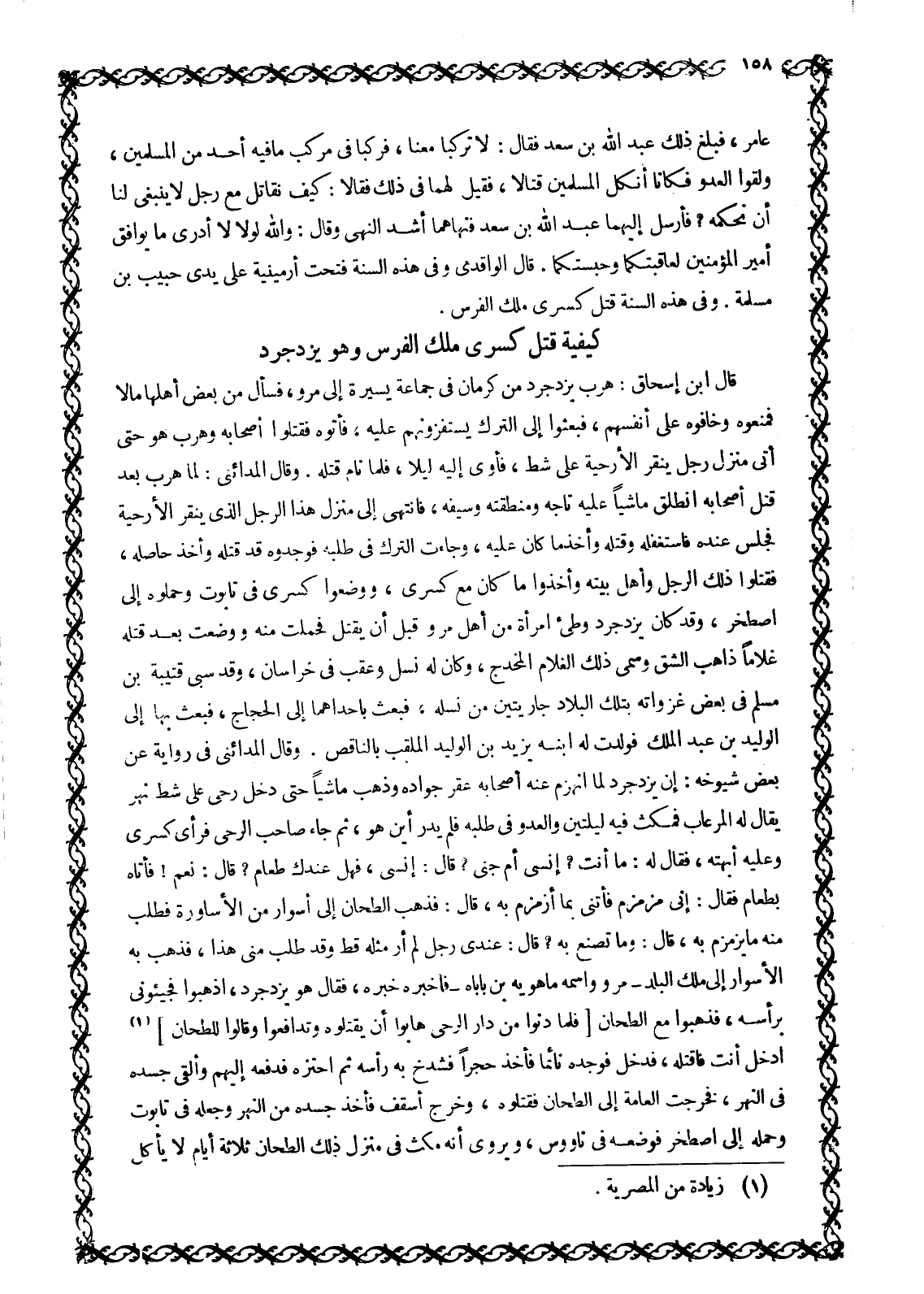 عَامِرٍ، فَبَلَغَ ذَلِكَ عَبْدَ اللَّهِ بْنَ سَعْدٍ فَقَالَ: لَا تَرْكَبَا مَعَنَا، فَرَكِبَا فِي مَرْكَبٍ مَا فِيهِ أَحَدٌ مِنَ الْمُسْلِمِينَ، وَلَقُوُا الْعَدُوَّ فَكَانَا أَنْكَلَ الْمُسْلِمِينَ قِتَالًا، فَقِيلَ لَهُمَا فِي ذَلِكَ فَقَالَا: كَيْفَ نُقَاتِلُ مَعَ رَجُلٍ لَا يَنْبَغِي لَنَا أَنْ نُحَكِّمَهُ؟ فَأَرْسَلَ إِلَيْهِمَا عَبْدُ اللَّهِ بْنُ سَعْدٍ فَنَهَاهُمَا أَشَدَّ النَّهْيِ وقال: والله لولا لَا أَدْرِي مَا يُوَافِقُ أَمِيرَ الْمُؤْمِنِينَ لِعَاقَبْتُكُمَا وَحَبَسْتُكُمَا. قَالَ الْوَاقِدِيُّ وَفِي هَذِهِ السَّنَةِ فُتِحَتْ أَرْمِينِيَةُ عَلَى يَدَيْ حَبِيبِ بْنِ مَسْلَمَةَ. وَفِي هَذِهِ السَّنَةِ قُتِلَ كِسْرَى مَلِكُ الْفُرْسِ.