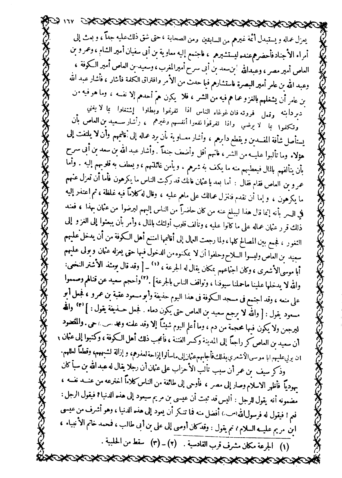 يعزل عماله ويستبدل أئمة غَيْرَهُمْ، مِنَ السَّابِقَيْنَ وَمِنَ الصَّحَابَةِ حَتَّى شَقَّ ذَلِكَ عَلَيْهِ جِدًّا، وَبَعَثَ إِلَى أُمَرَاءِ الْأَجْنَادِ فَأَحْضَرَهُمْ عِنْدَهُ لِيَسْتَشِيرَهُمْ، فَاجْتَمَعَ إِلَيْهِ مُعَاوِيَةُ بْنُ أَبِي سُفْيَانَ أَمِيرُ الشَّامِ، وَعَمْرُو بْنُ الْعَاصِ أمير مصر، وعبد الله ابن سَعْدِ بْنِ أَبِي سَرْحٍ أَمِيرُ الْمَغْرِبِ، وَسَعِيدُ بْنُ الْعَاصِ أَمِيرُ الْكُوفَةِ، وَعَبْدُ اللَّهِ بْنُ عَامِرٍ أَمِيرُ الْبَصْرَةِ فَاسْتَشَارَهُمْ فِيمَا حَدَثَ مِنَ الأمر والافتراق الكلمة عَبْدُ اللَّهِ بْنُ عَامِرٍ أَنْ يَشْغَلَهُمْ بِالْغَزْوِ عَمَّا هُمْ فِيهِ مِنَ الشَّرِّ، فَلَا يَكُونَ هَمُّ أَحَدِهِمْ إِلَّا نَفْسَهُ، وَمَا هُوَ فِيهِ من دبر دابته وقمل فروته، فان غوعاء النَّاسِ إِذَا تَفَرَّغُوا وَبَطِلُوا اشْتَغَلُوا بِمَا لَا يعنى وتكلموا بما لَا يُرْضِي وَإِذَا تَفَرَّقُوا نَفَعُوا أَنْفُسَهُمْ وَغَيْرَهُمْ أشار سَعِيدُ بْنُ الْعَاصِ بِأَنْ يَسْتَأْصِلَ شَأْفَةَ الْمُفْسِدِينَ وَيَقْطَعَ دَابِرَهُمْ، وَأَشَارَ مُعَاوِيَةُ بِأَنْ يَرُدَّ عُمَّالَهُ إِلَى أَقَالِيمِهِمْ وَأَنْ لَا يَلْتَفِتَ إِلَى هَؤُلَاءِ وَمَا تَأَلَّبُوا عَلَيْهِ مِنَ الشَّرِّ، فَإِنَّهُمْ أَقَلُّ وَأَضْعَفُ جُنْدًا. وَأَشَارَ عَبْدِ اللَّهِ بْنِ سَعْدِ بْنِ أَبِي سَرْحٍ بِأَنْ يَتَأَلَّفَهُمْ بِالْمَالِ فَيُعْطِيَهِمْ مِنْهُ مَا يَكُفُّ بِهِ شَرَّهُمْ، وَيَأْمَنُ غَائِلَتَهُمْ، وَيَعْطِفُ بِهِ قُلُوبَهُمْ إِلَيْهِ. وَأَمَّا عَمْرُو بْنُ الْعَاصِ فَقَامَ فَقَالَ: أَمَّا بَعْدُ يَا عُثْمَانُ فَإِنَّكَ قَدْ رَكَّبْتَ النَّاسَ مَا يَكْرَهُونَ فَإِمَّا أَنْ تَعْزِلَ عَنْهُمْ مَا يَكْرَهُونَ، وَإِمَّا أَنْ تقدم فتنزل عمالك على ما هُمْ عَلَيْهِ، وَقَالَ لَهُ كَلَامًا فِيهِ غِلْظَةٌ، ثُمَّ اعْتَذَرَ إِلَيْهِ فِي السِّرِّ بِأَنَّهُ إِنَّمَا قَالَ هَذَا لِيُبَلِّغَ عَنْهُ مَنْ كَانَ حَاضِرًا مِنَ النَّاسِ إِلَيْهِمْ لِيَرْضَوْا مِنْ عُثْمَانَ بِهَذَا، فَعِنْدَ ذَلِكَ قَرَّرَ عُثْمَانُ عُمَّالَهُ عَلَى مَا كَانُوا عَلَيْهِ، وَتَأَلَّفَ قُلُوبَ أُولَئِكَ بِالْمَالِ، وَأَمَرَ بأن يبعثوا إلى الْغَزْوِ إِلَى الثُّغُورِ، فَجَمَعَ بَيْنَ الْمَصَالِحِ كُلِّهَا، وَلَمَّا رَجَعَتِ الْعُمَّالُ إِلَى أَقَالِيمِهَا امْتَنَعَ أَهْلُ الْكُوفَةِ مِنْ أَنْ يَدْخُلَ عَلَيْهِمْ سَعِيدُ بْنُ الْعَاصِ وَلَبِسُوا السِّلَاحَ وَحَلَفُوا أَنْ لَا يُمَكِّنُوهُ من الدخول فيها حَتَّى يَعْزِلَهُ عُثْمَانُ وَيُوَلِّيَ عَلَيْهِمْ أَبَا مُوسَى الْأَشْعَرِيَّ، وَكَانَ اجْتِمَاعُهُمْ بِمَكَانٍ يُقَالُ لَهُ الْجَرَعَةُ [1] ، -[وَقَدْ قَالَ يَوْمَئِذٍ الْأَشْتَرُ النَّخَعِيُّ: