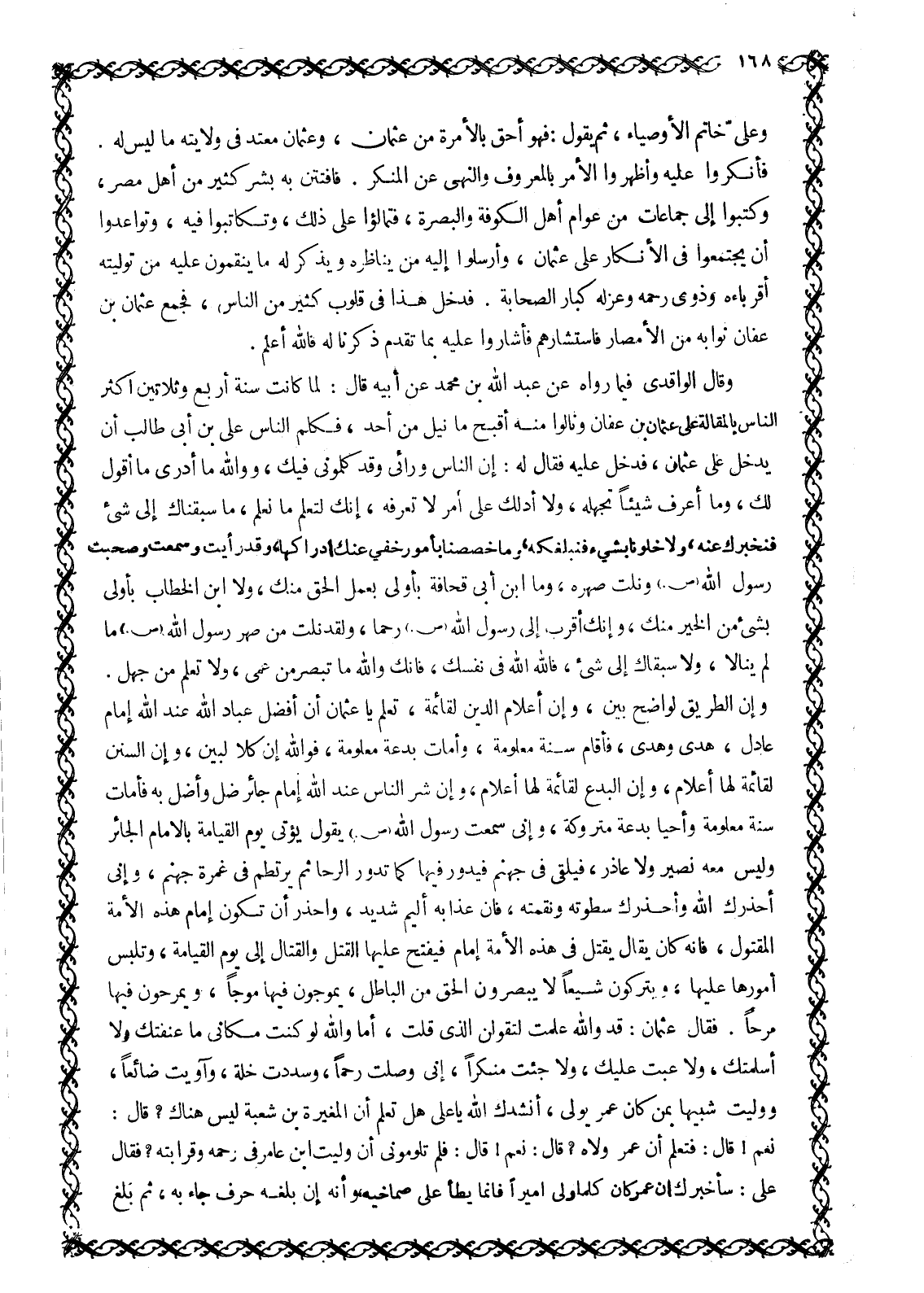 وَإِنَّ الطَّرِيقَ لِوَاضِحٌ بَيِّنٌ، وَإِنَّ أَعْلَامَ الدِّينِ لِقَائِمَةٌ، تَعْلَمُ يَا عُثْمَانُ أَنَّ أَفْضَلَ عِبَادِ اللَّهِ عِنْدَ اللَّهِ إِمَامٌ عَادِلٌ، هُدِيَ وَهَدَى، فَأَقَامَ سنة معلومة، وأمات بدعة معلومة، فو الله إِنَّ كُلًّا لَبَيِّنٌ، وَإِنَّ السُّنَنَ لَقَائِمَةٌ لَهَا أَعْلَامٌ، وَإِنَّ الْبِدَعَ لَقَائِمَةٌ لَهَا أَعْلَامٌ، وَإِنَّ شَرَّ النَّاسِ عِنْدَ اللَّهِ إِمَامٌ جَائِرٌ ضَلَّ وأضل بِهِ فَأَمَاتَ سُنَّةً مَعْلُومَةً وَأَحْيَا بِدْعَةً مَتْرُوكَةً، وَإِنِّي سَمِعْتُ رَسُولَ اللَّهِ صَلَّى اللَّهُ عَلَيْهِ وَسَلَّمَ يَقُولُ يُؤْتَى يَوْمَ الْقِيَامَةِ بِالْإِمَامِ الْجَائِرِ وَلَيْسَ مَعَهُ نَصِيرٌ وَلَا عَاذِرٌ، فَيُلْقَى فِي جَهَنَّمَ فَيَدُورُ فِيهَا كَمَا تَدُورُ الرَّحَا ثُمَّ يَرْتَطِمُ فِي غَمْرَةِ جَهَنَّمَ، وَإِنِّي أُحَذِّرُكَ اللَّهَ وأحذرك سطوته ونقمته، فإن عذابه أليم شديد، وَاحْذَرْ أَنْ تَكُونَ إِمَامَ هَذِهِ الْأُمَّةِ الْمَقْتُولَ، فَإِنَّهُ كَانَ يُقَالُ يُقْتَلُ فِي هَذِهِ الْأُمَّةِ إِمَامٌ فَيُفْتَحُ عَلَيْهَا الْقَتْلُ وَالْقِتَالُ إِلَى يَوْمِ الْقِيَامَةِ، وَتُلَبَّسُ أُمُورُهَا عَلَيْهَا، وَيُتْرَكُونَ شِيَعًا لَا يُبْصِرُونَ الْحَقَّ مِنَ الْبَاطِلِ، يَمُوجُونَ فِيهَا مَوْجًا، ويمرحون فيها مرحا. فَقَالَ عُثْمَانُ: قَدْ وَاللَّهِ عَلِمْتُ لَتَقُولَنَّ الَّذِي قُلْتَ: أَمَا وَاللَّهِ لَوْ كُنْتَ مَكَانِي مَا عَنَّفْتُكَ وَلَا أَسْلَمْتُكَ، وَلَا عِبْتُ عَلَيْكَ، وَلَا جئت منكرا، إني وَصَلْتُ رَحِمًا، وَسَدَدْتُ خَلَّةً، وَأَوَيْتُ ضَائِعًا، وَوَلَّيْتُ شَبِيهًا بِمَنْ كَانَ عُمَرُ يُوَلِّي، أَنْشُدُكَ اللَّهَ يَا عَلِيُّ هَلْ تَعْلَمُ أَنَّ الْمُغِيرَةَ بْنَ شُعْبَةَ لَيْسَ هُنَاكَ؟ قَالَ: