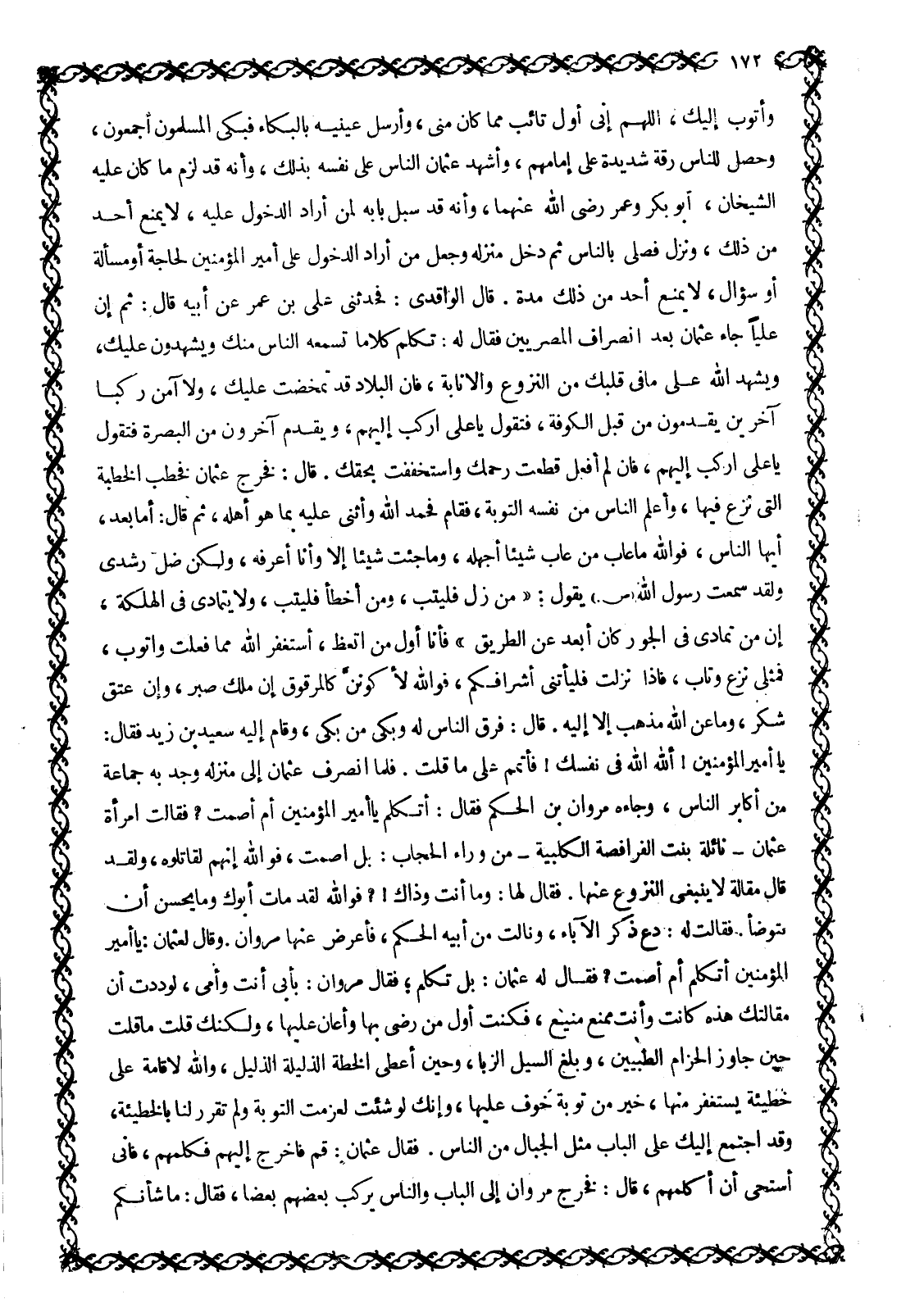 يَا أَمِيرَ الْمُؤْمِنِينَ! اللَّهَ اللَّهَ فِي نَفْسِكَ! فَأَتْمِمْ عَلَى مَا قُلْتَ. فَلَمَّا انْصَرَفَ عُثْمَانُ إِلَى مَنْزِلِهِ وَجَدَ بِهِ جَمَاعَةٌ مِنْ أَكَابِرِ النَّاسِ، وَجَاءَهُ مَرْوَانُ بْنُ الْحَكَمِ فَقَالَ: أَتَكَلَّمُ يَا أَمِيرَ الْمُؤْمِنِينَ أَمْ أَصْمُتُ؟ فَقَالَتِ امْرَأَةُ عُثْمَانَ- نَائِلَةُ بِنْتُ الْفَرَافِصَةِ الْكَلْبِيَّةُ- مِنْ وَرَاءِ الْحِجَابِ: بل اصمت، فو الله إِنَّهُمْ لَقَاتِلُوهُ، وَلَقَدْ قَالَ مَقَالَةً لَا يَنْبَغِي النُّزُوعُ عَنْهَا. فَقَالَ لَهَا: وَمَا أَنْتِ وَذَاكَ!؟ فو الله لقد مات أبوك وما يحسن أن يَتَوَضَّأُ. فَقَالَتْ لَهُ: دَعْ ذِكْرَ الْآبَاءِ، وَنَالَتْ مِنْ أَبِيهِ الْحَكَمَ، فَأَعْرَضَ عَنْهَا مَرْوَانُ. وَقَالَ لِعُثْمَانَ: يَا أَمِيرَ الْمُؤْمِنِينَ أَتَكَلَّمُ أَمْ أَصْمُتُ؟ فَقَالَ لَهُ عُثْمَانُ: بَلْ تَكَلَّمْ، فَقَالَ مَرْوَانُ: بِأَبِي أَنْتَ وَأُمِّي، لَوَدِدْتُ أَنَّ مَقَالَتَكَ هَذِهِ كانت وأنت ممنع مَنِيعٌ، فَكُنْتُ أَوَّلَ مَنْ رَضِيَ بِهَا وَأَعَانَ عليها، ولكنك قلت ما قلت حين جاوز الحزام الطبيين، وبلغ السيل الزبا، وَحِينَ أَعْطَى الْخُطَّةَ الذَّلِيلَةَ الذَّلِيلُ، وَاللَّهِ لَإِقَامَةٌ عَلَى خَطِيئَةٍ يُسْتَغْفَرُ مِنْهَا، خَيْرٌ مِنْ تَوْبَةٍ خوف عَلَيْهَا، وَإِنَّكَ لَوْ شِئْتَ لَعَزَمْتَ التَّوْبَةَ وَلَمْ تُقَرِّرْ لَنَا بِالْخَطِيئَةِ، وَقَدِ اجْتَمَعَ إِلَيْكَ عَلَى الْبَابِ مِثْلُ الْجِبَالِ مِنَ النَّاسِ. فَقَالَ عُثْمَانُ: قم فَاخْرُجْ إِلَيْهِمْ فَكَلِّمْهُمْ، فَإِنِّي أَسْتَحِي أَنْ أُكَلِّمَهُمْ، قَالَ: فَخَرَجَ مَرْوَانُ إِلَى الْبَابِ وَالنَّاسِ يَرْكَبُ بَعْضُهُمْ بَعْضًا، فَقَالَ: مَا شَأْنُكُمْ