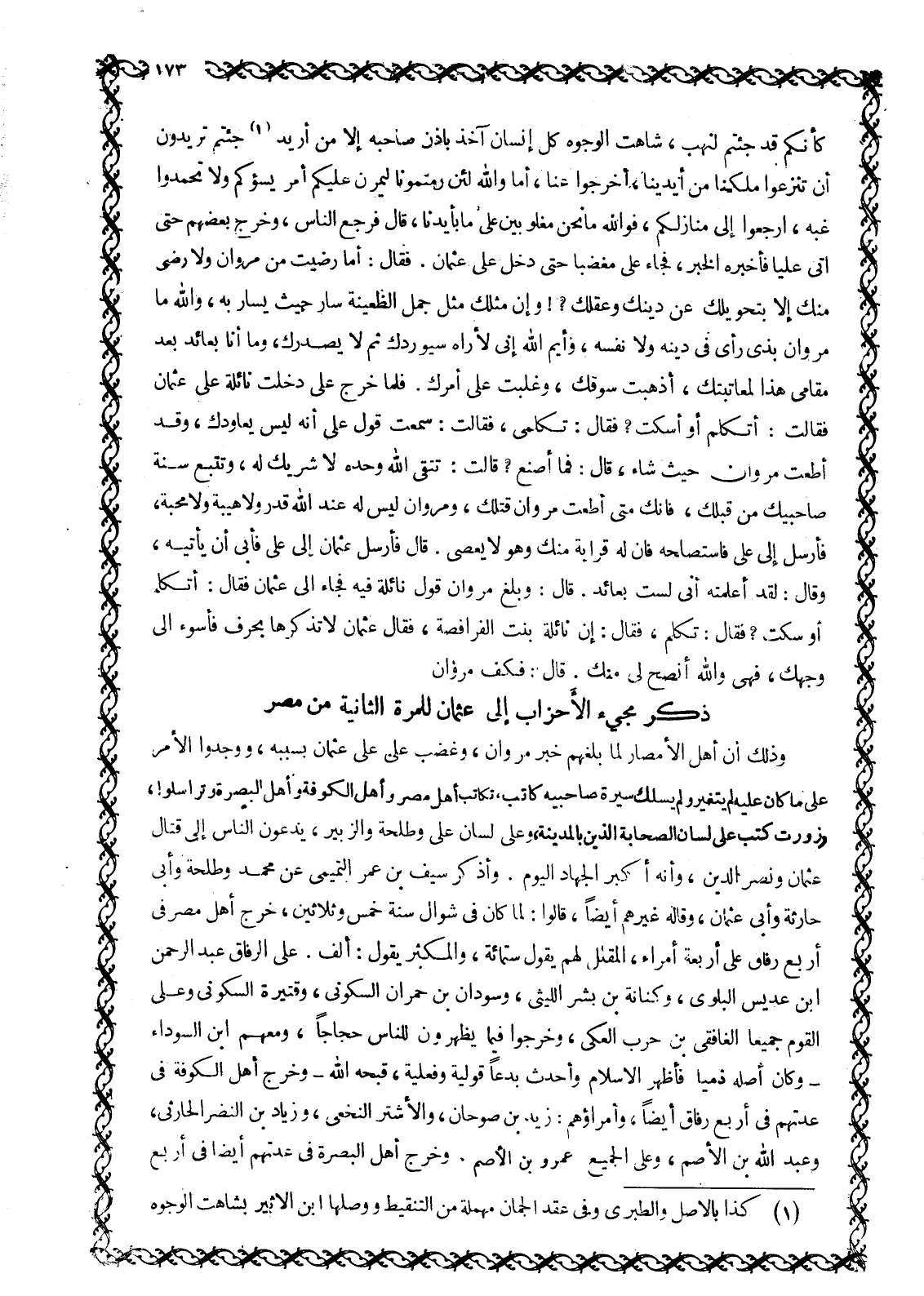 وذلك أَنَّ أَهْلَ الْأَمْصَارِ لَمَّا بَلَغَهُمْ خَبَرُ مَرْوَانَ، وَغَضَبُ عَلِيٍّ عَلَى عُثْمَانَ بِسَبَبِهِ، وَوَجَدُوا الْأَمْرَ على ما كان عليه لم يتغير ولم يسلك سيرة صاحبيه كاتب أَهْلُ مِصْرَ وَأَهْلُ الْكُوفَةِ وَأَهْلُ الْبَصْرَةِ وَتَرَاسَلُوا، وَزُوِّرَتْ كُتُبٌ عَلَى لِسَانِ الصَّحَابَةِ الَّذِينَ بِالْمَدِينَةِ، وَعَلَى لِسَانِ عَلِيٍّ وَطَلْحَةَ وَالزُّبَيْرِ، يَدْعُونَ النَّاسَ إِلَى قِتَالِ عُثْمَانَ وَنَصْرِ الدِّينِ، وَأَنَّهُ أَكْبَرُ الجهاد اليوم. وأذكر سَيْفُ بْنُ عُمَرَ التَّمِيمِيُّ عَنْ مُحَمَّدٍ وَطَلْحَةَ وَأَبِي حَارِثَةَ وَأَبِي عُثْمَانَ، وَقَالَهُ غَيْرُهُمْ أَيْضًا، قَالُوا: لَمَّا كَانَ فِي شَوَّالٍ سَنَةَ خَمْسٍ وثلاثين، خرج أهل مصرفى أَرْبَعِ رِفَاقٍ عَلَى أَرْبَعَةِ أُمَرَاءَ، الْمُقَلِّلُ لَهُمْ يَقُولُ سِتُّمِائَةٍ، وَالْمُكَثِّرُ يَقُولُ: أَلْفٌ. عَلَى الرِّفَاقِ عبد الرحمن ابن عديس البلوى، وكنانة بن بشر اللِّيثِيُّ، وَسَوْدَانُ بْنُ حُمْرَانَ السُّكُونِيُّ، وَقُتَيْرَةُ السُّكُونِيُّ وَعَلَى الْقَوْمِ جَمِيعًا الْغَافِقِيُّ بْنُ حَرْبٍ الْعَكِّيُّ، وَخَرَجُوا فِيمَا يُظْهِرُونَ لِلنَّاسِ حُجَّاجًا، وَمَعَهُمُ ابْنُ السَّوْدَاءِ- وَكَانَ أَصْلُهُ ذِمِّيًّا فَأَظْهَرَ الْإِسْلَامَ وَأَحْدَثَ بِدَعًا قَوْلِيَّةً وَفِعْلِيَّةً، قَبَّحَهُ اللَّهُ- وَخَرَجَ أَهْلُ الكوفة في عدتهم في أربع رفاق أيضا، وَأُمَرَاؤُهُمْ: زَيْدُ بْنُ صُوحَانَ، وَالْأَشْتَرُ النَّخَعِيُّ، وَزِيَادُ بْنُ النَّضْرِ الْحَارِثِيُّ، وَعَبْدُ اللَّهِ بْنُ الْأَصَمِّ، وَعَلَى الْجَمِيعِ عَمْرُو بْنُ الْأَصَمِّ. وَخَرَجَ أَهْلُ البصرة في عدتهم أيضا في أربع