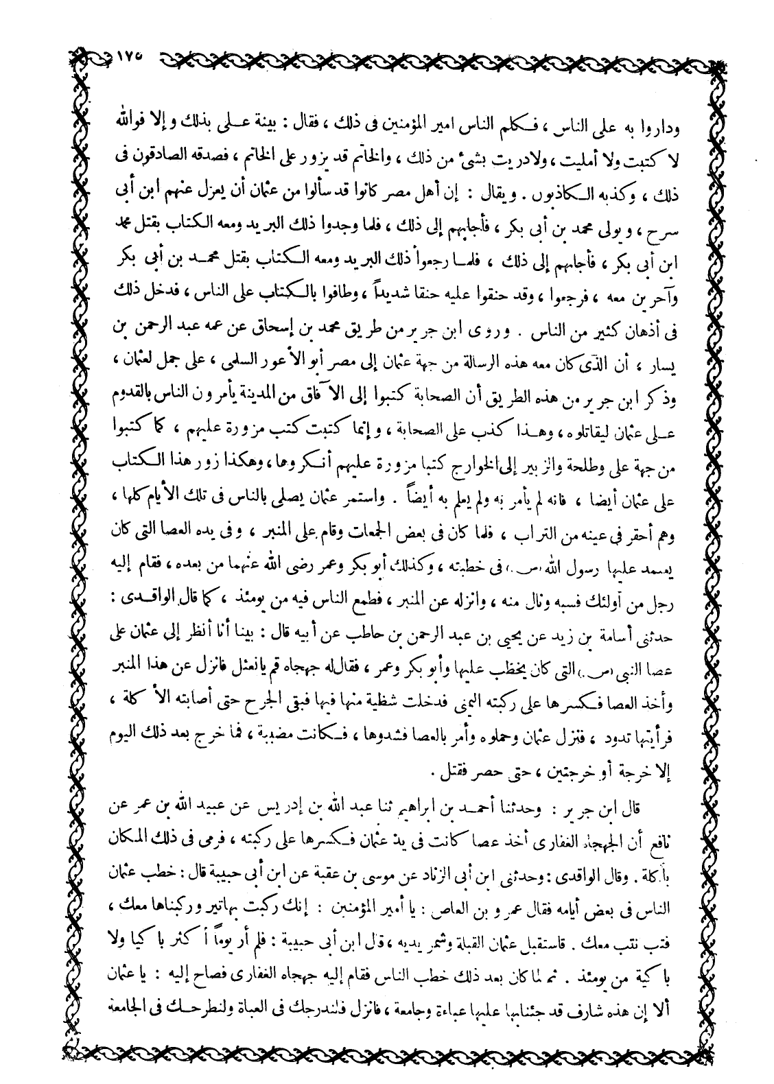 وَدَارُوا بِهِ عَلَى النَّاسِ، فَكَلَّمَ النَّاسُ أَمِيرَ الْمُؤْمِنِينَ فِي ذَلِكَ، فَقَالَ: بَيِّنَةٌ عَلَيَّ بِذَلِكَ وإلا فو الله لَا كَتَبْتُ وَلَا أَمْلَيْتُ، وَلَا دَرَيْتُ بِشَيْءٍ مِنْ ذَلِكَ، وَالْخَاتَمُ قَدْ يُزَوَّرُ عَلَى الْخَاتَمِ، فَصَدَّقَهُ الصَّادِقُونَ فِي ذَلِكَ، وَكَذَّبَهُ الْكَاذِبُونَ. وَيُقَالُ: إِنَّ أَهْلَ مِصْرَ كَانُوا قَدْ سَأَلُوا مِنْ عُثْمَانَ أَنْ يَعْزِلَ عَنْهُمُ ابْنَ أَبِي سَرْحٍ، وَيُوَلِّيَ مُحَمَّدَ بْنَ أَبِي بَكْرٍ، فَأَجَابَهُمْ إِلَى ذلك، فلما وَجَدُوا ذَلِكَ الْبَرِيدَ وَمَعَهُ الْكِتَابُ بِقَتْلِ مُحَمَّدِ ابن أَبِي بَكْرٍ، فَأَجَابَهُمْ إِلَى ذَلِكَ، فَلَمَّا رَجَعُوا ذَلِكَ الْبَرِيدَ وَمَعَهُ الْكِتَابُ بِقَتْلِ مُحَمَّدِ بْنِ أَبِي بَكْرٍ وَآخَرِينَ مَعَهُ، فَرَجَعُوا، وَقَدْ حَنِقُوا عَلَيْهِ حَنَقًا شَدِيدًا، وَطَافُوا بِالْكِتَابِ عَلَى النَّاسِ، فَدَخَلَ ذَلِكَ فِي أَذْهَانِ كَثِيرٍ مِنَ النَّاسِ. وَرَوَى ابْنُ جَرِيرٍ مِنْ طَرِيقِ مُحَمَّدِ بْنِ إِسْحَاقَ عَنْ عَمِّهِ عَبْدِ الرَّحْمَنِ بْنِ يَسَارٍ، أَنَّ الَّذِي كَانَ مَعَهُ هَذِهِ الرِّسَالَةُ مِنْ جِهَةِ عُثْمَانَ إِلَى مِصْرَ أَبُو الْأَعْوَرِ السُّلَمِيُّ، عَلَى جَمَلٍ لِعُثْمَانَ، وَذَكَرَ ابْنُ جَرِيرٍ مِنْ هَذِهِ الطَّرِيقِ أَنَّ الصَّحَابَةَ كَتَبُوا إِلَى الْآفَاقِ مِنَ الْمَدِينَةِ يَأْمُرُونَ النَّاسَ بِالْقُدُومِ عَلَى عُثْمَانَ لِيُقَاتِلُوهُ، وَهَذَا كَذِبٌ عَلَى الصَّحَابَةِ، وَإِنَّمَا كُتِبَتْ كُتُبٌ مُزَوَّرَةٌ عَلَيْهِمْ، كَمَا كَتَبُوا مِنْ جِهَةِ عَلِيٍّ وَطَلْحَةَ وَالزُّبَيْرِ إِلَى الْخَوَارِجِ كُتُبًا مُزَوَّرَةً عَلَيْهِمْ أَنْكَرُوهَا، وَهَكَذَا زُوِّرَ هَذَا الْكُتَّابُ عَلَى عُثْمَانَ أَيْضًا، فَإِنَّهُ لَمْ يَأْمُرْ بِهِ وَلَمْ يَعْلَمْ بِهِ أَيْضًا. وَاسْتَمَرَّ عُثْمَانُ يُصَلِّي بِالنَّاسِ فِي تِلْكَ الْأَيَّامِ كُلِّهَا، وَهُمْ أَحْقَرُ فِي عَيْنِهِ مِنَ التُّرَابِ، فَلَمَّا كَانَ فِي بَعْضِ الْجُمُعَاتِ وَقَامَ عَلَى الْمِنْبَرِ، وَفِي يَدِهِ الْعَصَا الَّتِي كَانَ يَعْتَمِدُ عَلَيْهَا رَسُولُ اللَّهِ صَلَّى اللَّهُ عَلَيْهِ وَسَلَّمَ فِي خُطْبَتِهِ، وَكَذَلِكَ أَبُو بَكْرٍ وَعُمَرُ رَضِيَ اللَّهُ عَنْهُمَا مِنْ بَعْدِهِ، فَقَامَ إِلَيْهِ رَجُلٌ مِنْ أُولَئِكَ فَسَبَّهُ وَنَالَ مِنْهُ، وَأَنْزَلَهُ عَنِ الْمِنْبَرِ، فَطَمِعَ النَّاسِ فِيهِ مِنْ يَوْمَئِذٍ، كَمَا قَالَ الْوَاقِدِيُّ: