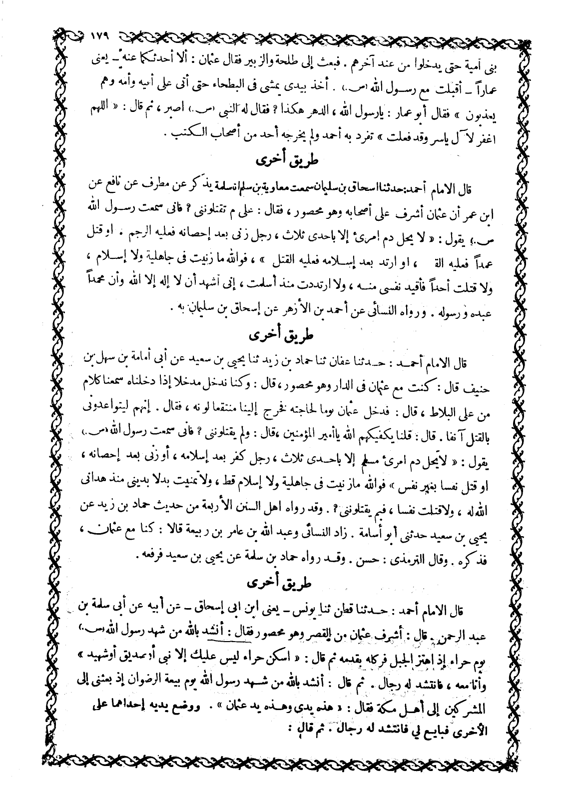 قَالَ الْإِمَامُ أحمد: حدثنا إسحاق بن سليمان سمعت معاوية بن مسلم أنا سلمة يذكر عن مطرف عَنْ نَافِعٍ عَنِ ابْنِ عُمَرَ أَنَّ عُثْمَانَ أشرف على أصحابه وهو محصور، فقال: على م تقتلوننى؟ فَإِنِّي سَمِعْتُ رَسُولَ اللَّهِ صَلَّى اللَّهُ عَلَيْهِ وَسَلَّمَ يقول: «لا يحل دم امرئ إِلَّا بِإِحْدَى ثَلَاثٍ، رَجُلٌ زَنَى بَعْدَ إِحْصَانِهِ فَعَلَيْهِ الرَّجْمُ، أَوْ قَتَلَ عَمْدًا فَعَلَيْهِ الْقَوَدُ، أو ارتد بعد إسلامه فعليه القتل» ، فو الله مَا زَنَيْتُ فِي جَاهِلِيَّةٍ وَلَا إِسْلَامٍ، وَلَا قَتَلْتُ أَحَدًا فَأُقِيدَ نَفْسِي مِنْهُ، وَلَا ارْتَدَدْتُ مُنْذُ أَسْلَمْتُ، إِنِّي أَشْهَدُ أَنْ لَا إِلَهَ إِلَّا اللَّهُ وَأَنَّ مُحَمَّدًا عَبْدُهُ وَرَسُولُهُ. وَرَوَاهُ النَّسَائِيُّ عَنْ أَحْمَدَ بْنِ الْأَزْهَرِ عَنْ إِسْحَاقَ بْنِ سُلَيْمَانَ بِهِ.