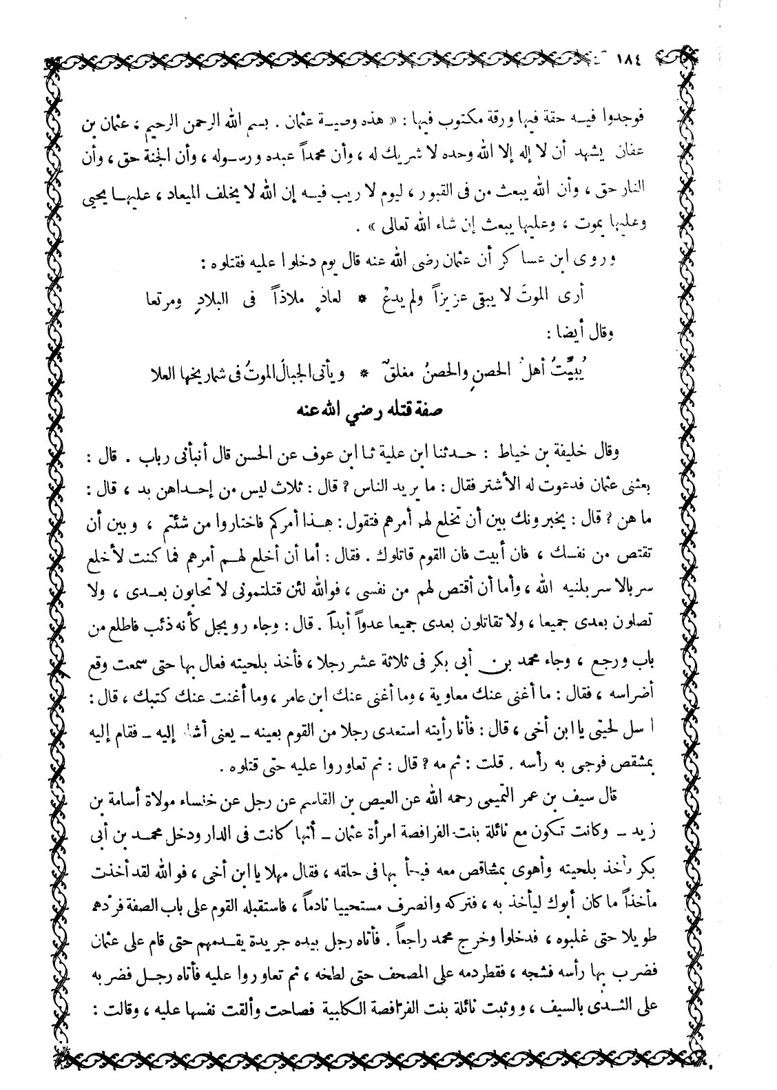 فَوَجَدُوا فِيهِ حُقَّةً فِيهَا وَرَقَةٌ مَكْتُوبٌ فِيهَا: «هَذِهِ وَصِيَّةُ عُثْمَانَ. بِسْمِ اللَّهِ الرَّحْمَنِ الرَّحِيمِ، عُثْمَانُ بْنُ عَفَّانَ يُشْهَدَ أَنْ لَا إِلَهَ إِلَّا اللَّهُ وَحْدَهُ لَا شَرِيكَ لَهُ، وَأَنَّ مُحَمَّدًا عَبْدُهُ وَرَسُولُهُ، وَأَنَّ الْجَنَّةَ حَقٌّ، وَأَنَّ النَّارَ حَقٌّ، وَأَنَّ اللَّهَ يَبْعَثُ مَنْ فِي الْقُبُورِ، لِيَوْمٍ لَا رَيْبَ فِيهِ إِنَّ اللَّهَ لَا يخلف الميعاد، عليها يحيى وَعَلَيْهَا يَمُوتُ، وَعَلَيْهَا يُبْعَثُ إِنْ شَاءَ اللَّهُ تَعَالَى» .