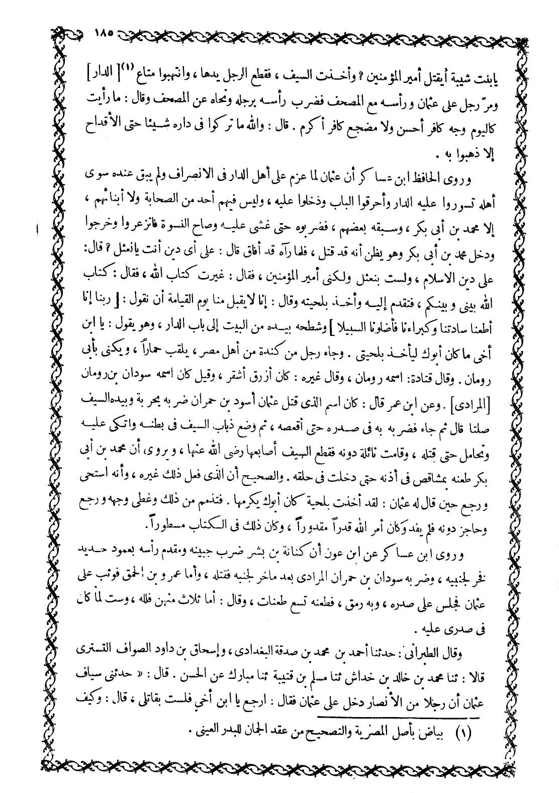 عَلَى دِينِ الْإِسْلَامِ، وَلَسْتُ بِنَعْثَلٍ وَلَكِنِّي أَمِيرُ الْمُؤْمِنِينَ، فَقَالَ: غَيَّرْتَ كِتَابَ اللَّهِ، فَقَالَ: كِتَابُ اللَّهِ بَيْنِي وَبَيْنَكُمْ، فَتَقَدَّمَ إِلَيْهِ وَأَخَذَ بِلِحْيَتِهِ وَقَالَ: إِنَّا لَا يُقْبَلُ مِنَّا يَوْمَ الْقِيَامَةِ أَنْ نَقُولَ: (رَبَّنَا إِنَّا أَطَعْنَا سادتنا وكبراءنا فأضلونا السبيلا) وشطحه بِيَدِهِ مِنَ الْبَيْتِ إِلَى بَابِ الدَّارِ، وَهُوَ يَقُولُ: يَا ابْنَ أَخِي مَا كَانَ أَبُوكَ لِيَأْخُذَ بِلِحْيَتِي. وَجَاءَ رَجُلٌ مِنْ كِنْدَةَ مِنْ أَهْلِ مِصْرَ، يُلَقَّبُ حِمَارًا، وَيُكَنَّى بِأَبِي رُومَانَ. وَقَالَ قَتَادَةُ: اسْمُهُ رُومَانُ، وَقَالَ غَيْرُهُ: كَانَ أَزْرَقَ أَشْقَرَ، وَقِيلَ كَانَ اسْمُهُ سُودَانَ بْنَ رُومَانَ [الْمُرَادِيَّ] . وَعَنِ ابْنِ عُمَرَ قَالَ: كَانَ اسْمُ الَّذِي قَتَلَ عُثْمَانَ أَسْوَدُ بْنُ حُمْرَانَ ضربه بحربة وبيده السيف صلتا قال ثُمَّ جَاءَ فَضَرَبَهُ بِهِ فِي صَدْرِهِ حَتَّى أَقْعَصَهُ، ثُمَّ وَضَعَ ذُبَابَ السَّيْفِ فِي بَطْنِهِ واتكى عَلَيْهِ وَتَحَامَلَ حَتَّى قَتَلَهُ، وَقَامَتْ نَائِلَةُ دُونَهُ فَقَطَعَ السَّيْفُ أَصَابِعَهَا رَضِيَ اللَّهُ عَنْهَا، وَيُرْوَى أَنَّ مُحَمَّدَ بْنَ أَبِي بَكْرٍ طَعْنَهُ بِمَشَاقِصَ في أذنه حتى دخلت في حَلْقَهُ. وَالصَّحِيحُ أَنَّ الَّذِي فَعَلَ ذَلِكَ غَيْرُهُ، وأنه استحى وَرَجَعَ حِينَ قَالَ لَهُ عُثْمَانُ: لَقَدْ أَخَذْتَ بِلِحْيَةٍ كَانَ أَبُوكَ يُكْرِمُهَا. فَتَذَمَّمَ مِنْ ذَلِكَ وغطى وجهه ورجع وحاجز دُونَهُ فَلَمْ يُفِدْ وَكَانَ أَمْرُ اللَّهِ قَدَرًا مَقْدُورًا، وَكَانَ ذَلِكَ فِي الْكِتَابِ مَسْطُورًا.