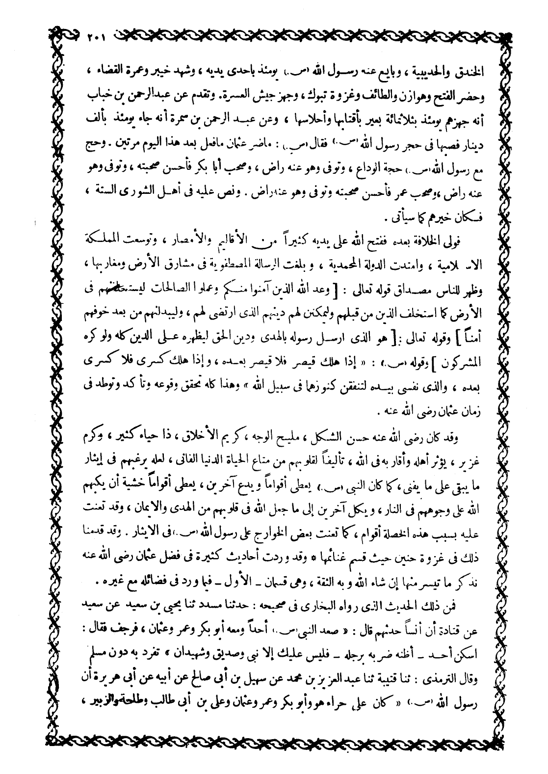 ائْذَنْ لَهُ وَبَشِّرْهُ بِالْجَنَّةِ. ثُمَّ جَاءَ عُمَرُ فَقَالَ ائْذَنْ لَهُ وَبَشِّرْهُ بِالْجَنَّةِ، ثُمَّ جَاءَ عُثْمَانُ فَقَالَ: ائْذَنْ لَهُ وَبَشِّرْهُ بِالْجَنَّةِ عَلَى بَلْوَى تُصِيبُهُ، فَدَخَلَ وَهُوَ يَقُولُ: اللَّهمّ صَبْرًا وَفِي رِوَايَةٍ- اللَّهُ الْمُسْتَعَانُ» رَوَاهُ عَنْهُ قَتَادَةُ وَأَيُّوبُ السِّخْتِيَانِيُّ. وَقَالَ الْبُخَارِيُّ: وَقَالَ حَمَّادُ بْنُ زَيْدٍ: حَدَّثَنَا عَاصِمٌ الْأَحْوَلُ وَعَلِيُّ بْنُ الْحَكَمِ سَمِعَا أَبَا عُثْمَانَ يُحَدِّثُ عَنْ أَبِي مُوسَى الْأَشْعَرِيِّ بِنَحْوِهِ، وَزَادَ عَاصِمٌ أَنَّ رَسُولَ اللَّهِ صَلَّى اللَّهُ عَلَيْهِ وَسَلَّمَ كان قاعدا في مكان قَدِ انْكَشَفَ عَنْ رُكْبَتَيْهِ، أَوْ رُكْبَتِهِ، فَلَمَّا دَخَلَ عُثْمَانُ غَطَّاهَا. وَهُوَ فِي الصَّحِيحَيْنِ أَيْضًا مِنْ حَدِيثِ سَعِيدِ بْنِ الْمُسَيَّبِ عَنْ أَبِي مُوسَى، وَفِيهِ «أَنَّ أَبَا بَكْرٍ وَعُمَرَ دَلَّيَا أَرْجُلَهُمَا مَعَ رَسُولِ اللَّهِ فِي بَابِ الْقُفِّ وَهُوَ فِي الْبِئْرِ، وَجَاءَ عُثْمَانُ فَلَمْ يَجِدْ له موضعا» قال سعيد: فأولت ذلك قبورهم اجتمعت وانفرد عثمان.