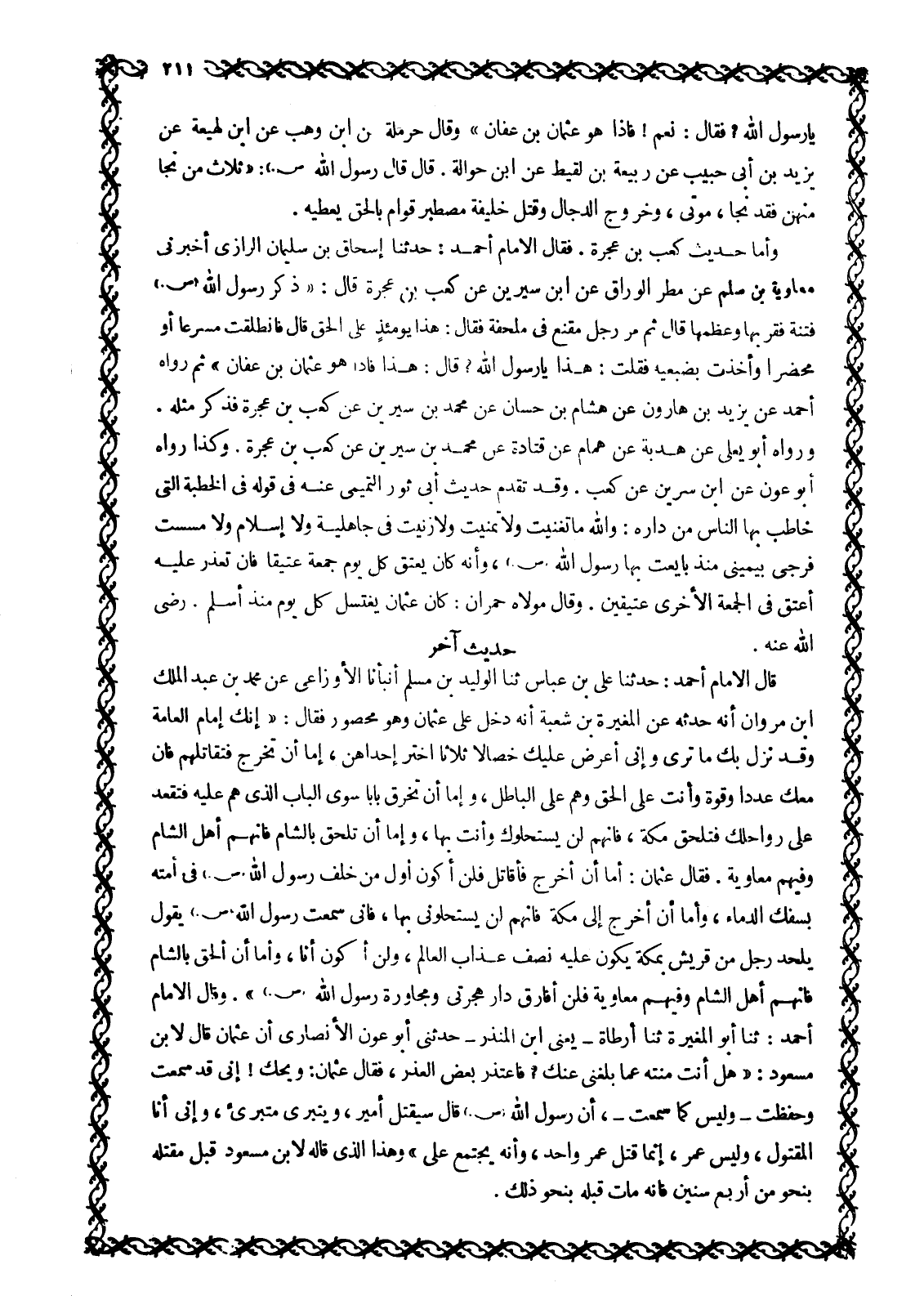 «شَهِدْتُ عُثْمَانَ يَوْمَ حُصِرَ فِي مَوْضِعِ الْجَنَائِزِ وَلَوْ أُلْقِيَ حَجَرٌ لَمْ يَقَعْ إِلَّا عَلَى رَأْسِ رَجُلٍ فَرَأَيْتُ عُثْمَانَ أَشْرَفَ مِنَ الخوخة التي تلى باب مقام جبرئيل، فَقَالَ: أَيُّهَا النَّاسُ! أَفِيكُمْ طَلْحَةُ؟ فَسَكَتُوا، ثُمَّ قَالَ: أَيُّهَا النَّاسُ! أَفِيكُمْ طَلْحَةُ بْنُ عُبَيْدِ اللَّهِ؟ فَسَكَتُوا، ثُمَّ قَالَ: أَيُّهَا النَّاسُ! أَفِيكُمْ طَلْحَةُ؟ فَقَامَ طَلْحَةُ بْنُ عُبَيْدِ اللَّهِ فَقَالَ لَهُ عُثْمَانُ: أَلَا أَرَاكَ هَاهُنَا؟ مَا كُنْتُ أَرَى أَنَّكَ تَكُونُ فِي جَمَاعَةِ قَوْمٍ تَسْمَعُ نداى آخر ثلاث مرات، ثم لا تجيئني؟ أَنْشُدُكَ اللَّهَ يَا طَلْحَةُ تَذْكُرُ يَوْمَ كُنْتُ أَنَا وَأَنْتَ مَعَ رَسُولِ اللَّهِ صَلَّى اللَّهُ عَلَيْهِ وَسَلَّمَ فِي مَوْضِعِ كَذَا وَكَذَا لَيْسَ مَعَهُ أَحَدٌ مِنْ أَصْحَابِهِ غَيْرِي وَغَيْرُكَ؟ فَقَالَ: نَعَمْ! قَالَ: فَقَالَ لَكَ رَسُولِ اللَّهِ صَلَّى اللَّهُ عَلَيْهِ وَسَلَّمَ أَنَّهُ مَا مِنْ نَبِيٍّ إلا ومعه من أصحابه رفيق فِي الْجَنَّةِ، وَإِنَّ عُثْمَانَ بْنَ عَفَّانَ هَذَا- يعنى نفسه- رَفِيقِي فِي الْجَنَّةِ؟ فَقَالَ طَلْحَةُ: اللَّهمّ نَعَمْ!» تفرد به أحمد] [1]