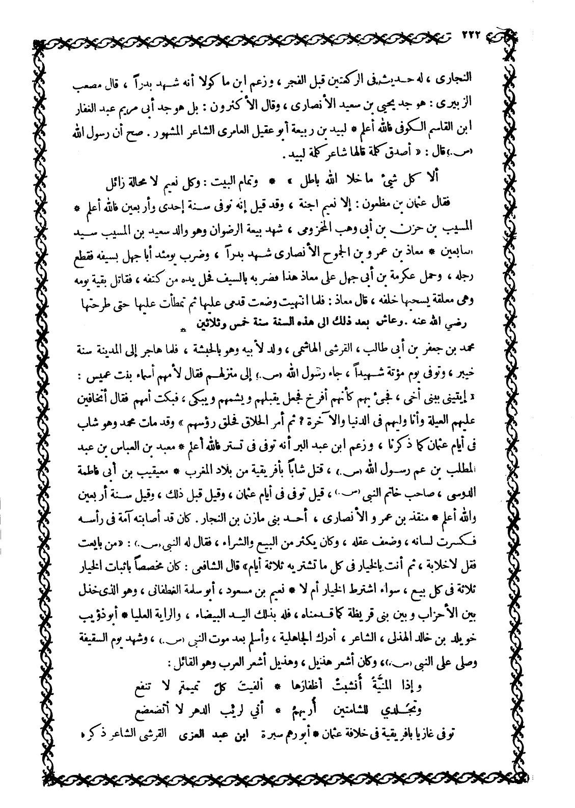 فِي هَذَا الْفَصْلِ مُحَمَّدُ بْنُ سَعْدٍ وَحْدَهُ أَبُو زُبَيْدٍ الطَّائِيُّ، الشَّاعِرُ، اسْمُهُ حَرْمَلَةُ بْنُ الْمُنْذِرِ كَانَ نَصْرَانِيًّا وَكَانَ يُجَالِسُ الْوَلِيدَ بْنَ عُقْبَةَ فَأَدْخَلَهُ عَلَى عُثْمَانَ فَاسْتَنْشَدَهُ شَيْئًا مِنْ شِعْرِهِ فَأَنْشَدَهُ قَصِيدَةً لَهُ فِي الْأَسَدِ بَدِيعَةً، فَقَالَ لَهُ عُثْمَانُ: تَفْتَأُ تَذْكُرُ الْأَسَدَ مَا حَيِيتَ؟ إِنِّي لَأَحْسَبُكَ جَبَانًا نَصْرَانِيًّا أَبُو سَبْرَةَ بْنُ أَبِي رُهْمٍ الْعَامِرِيُّ، أَخُو أَبِي سَلَمَةَ بْنِ عَبْدِ الْأَسَدِ، أُمُّهُمَا بَرَّةُ بِنْتُ عَبْدِ الْمُطَّلِبِ، هَاجَرَ إِلَى الْحَبَشَةِ وَشَهِدَ بَدْرًا وَمَا بعدها، قال الزبير: لَا نَعْلَمُ بَدْرِيًّا سَكَنَ مَكَّةَ بَعْدَ النَّبِيِّ صلّى الله عليه وسلّم سواه، قال: وأهله ببدر في ذَلِكَ أَبُو لُبَابَةَ بْنُ عَبْدِ الْمُنْذِرِ أَحَدُ نُقَبَاءِ لَيْلَةِ الْعَقَبَةِ، وَقِيلَ إِنَّهُ تُوُفِّيَ فِي خِلَافَةِ عَلِيٍّ وَاللَّهُ أَعْلَمُ أَبُو هَاشِمِ بْنُ عتبة نقدم وَفَاتُهُ فِي سَنَةِ إِحْدَى وَعِشْرِينَ، وَقِيلَ فِي خِلَافَةِ عُثْمَانَ وَاللَّهُ أَعْلَمُ.