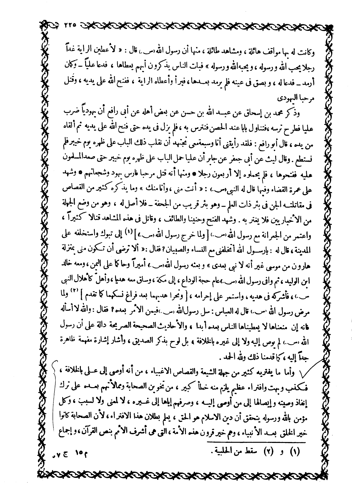 السَّلَفِ وَالْخَلَفِ، فِي الدُّنْيَا وَالْآخِرَةِ، وللَّه الْحَمْدُ. وما قد يَقُصُّهُ بَعْضُ الْقُصَّاصِ مِنَ الْعَوَامِّ وَغَيْرِهِمْ فِي الأسواق وغيرها من الوصية لعلى في الآداب والأخلاق فِي الْمَأْكَلِ وَالْمَشْرَبِ وَالْمَلْبَسِ، مِثْلَ مَا يَقُولُونَ: يَا عَلِيُّ لَا تَعْتَمَّ وَأَنْتَ قَاعِدٌ، يَا عَلِيُّ لَا تَلْبَسْ سَرَاوِيلَكَ وَأَنْتَ قَائِمٌ، يَا عَلِيُّ لَا تُمْسِكْ عِضَادَتَيِ الْبَابِ، وَلَا تَجْلِسْ على أسكفة الباب، ولا تخيط ثَوْبَكَ وَهُوَ عَلَيْكَ، وَنَحْوَ ذَلِكَ، كُلُّ ذَلِكَ من الهذيانات فلا أصل لشيء منه، بل هو اختلاق بعض السفلة الجهلة، ولا يعول على ذلك ويغتر به إلا غبي عيى. ثُمَّ لَمَّا مَاتَ رَسُولَ اللَّهِ صَلَّى اللَّهُ عَلَيْهِ وَسَلَّمَ كَانَ عَلِيٌّ مِنْ جُمْلَةِ مَنْ غَسَّلَهُ وَكَفَّنَهُ وَوَلِيَ دَفْنَهُ كَمَا تَقَدَّمَ ذَلِكَ مُفَصَّلًا وللَّه الْحَمْدُ وَالْمِنَّةُ. وَسَيَأْتِي فِي بَابِ فضائله ذكر تَزْوِيجِ رَسُولِ اللَّهِ صَلَّى اللَّهُ عَلَيْهِ وَسَلَّمَ لَهُ من فاطمة بَعْدَ وَقْعَةِ بَدْرٍ فَوُلِدَ لَهُ مِنْهَا حَسَنٌ وَحُسَيْنٌ وَمُحَسِّنٌ كَمَا قَدَّمْنَا. وَقَدْ وَرَدَتْ أَحَادِيثُ في ذلك لا يصلح شيء مِنْهَا بَلْ أَكْثَرُهَا مِنْ وَضْعِ الرَّوَافِضِ وَالْقُصَّاصِ. وَلَمَّا بُويِعَ الصِّدِّيقُ يَوْمَ السَّقِيفَةِ كَانَ عَلِيٌّ مِنْ جُمْلَةِ مَنْ بَايَعَ بِالْمَسْجِدِ كَمَا قَدَّمْنَا. وَكَانَ بَيْنَ يَدَيِ الصِّدِّيقِ كَغَيْرِهِ مِنْ أُمَرَاءِ الصَّحَابَةِ يَرَى طَاعَتَهُ فَرْضًا عَلَيْهِ، وَأَحَبَّ الْأَشْيَاءِ إِلَيْهِ، وَلَمَّا تُوُفِّيَتْ فَاطِمَةُ بَعْدَ سِتَّةِ أَشْهُرٍ- وكانت قد تغضبت بعض الشيء عَلَى أَبِي بَكْرٍ بِسَبَبِ الْمِيرَاثِ الَّذِي فَاتَهَا مِنْ أَبِيهَا عَلَيْهِ السَّلَامُ، وَلَمْ تَكُنِ اطَّلَعَتْ عَلَى النَّصِّ الْمُخْتَصِّ بِالْأَنْبِيَاءِ وَأَنَّهُمْ لَا يُوَرَّثُونَ، فَلَمَّا بَلَغَهَا سَأَلَتْ أَبَا بَكْرٍ أَنْ يَكُونَ زَوْجُهَا نَاظِرًا عَلَى هَذِهِ الصَّدَقَةِ، فَأَبَى ذَلِكَ عَلَيْهَا، فَبَقِيَ فِي نَفْسِهَا شَيْءٌ كَمَا قَدَّمْنَا، وَاحْتَاجَ عَلِيٌّ أَنْ يُدَارِيَهَا بَعْضَ الْمُدَارَاةِ- فَلَمَّا توفيت جدد الْبَيْعَةَ مَعَ الصِّدِّيقِ رَضِيَ اللَّهُ عَنْهُمَا، فَلَمَّا تُوُفِّيَ أَبُو بَكْرٍ وَقَامَ عُمَرُ فِي الْخِلَافَةِ بِوَصِيَّةِ أَبِي بَكْرٍ إِلَيْهِ بِذَلِكَ، كَانَ عَلِيٌّ مِنْ جُمْلَةِ مَنْ بَايَعَهُ، وَكَانَ مَعَهُ يُشَاوِرُهُ فِي الْأُمُورِ، وَيُقَالُ إِنَّهُ اسْتَقْضَاهُ فِي أَيَّامِ خلافته، وقدم معه من جُمْلَةِ سَادَاتِ أُمَرَاءِ الصَّحَابَةِ إِلَى الشَّامِ، وَشَهِدَ خُطْبَتَهُ بِالْجَابِيَةِ، فَلَمَّا طُعِنَ عُمَرُ وَجَعَلَ الْأَمْرَ شُورَى فِي سِتَّةٍ أَحَدُهُمْ عَلِيٌّ، ثُمَّ خُلِصَ مِنْهُمْ بِعُثْمَانَ وَعَلِيٍّ كَمَا قَدَّمْنَا، فَقُدِّمَ عُثْمَانُ على على، فسمع وَأَطَاعَ، فَلَمَّا قُتِلَ عُثْمَانُ يَوْمَ الْجُمْعَةِ لِثَمَانِ عَشْرَةَ خَلَتْ مِنْ ذِي الْحِجَّةِ سَنَةَ خَمْسَةٍ وَثَلَاثِينَ عَلَى الْمَشْهُورِ.