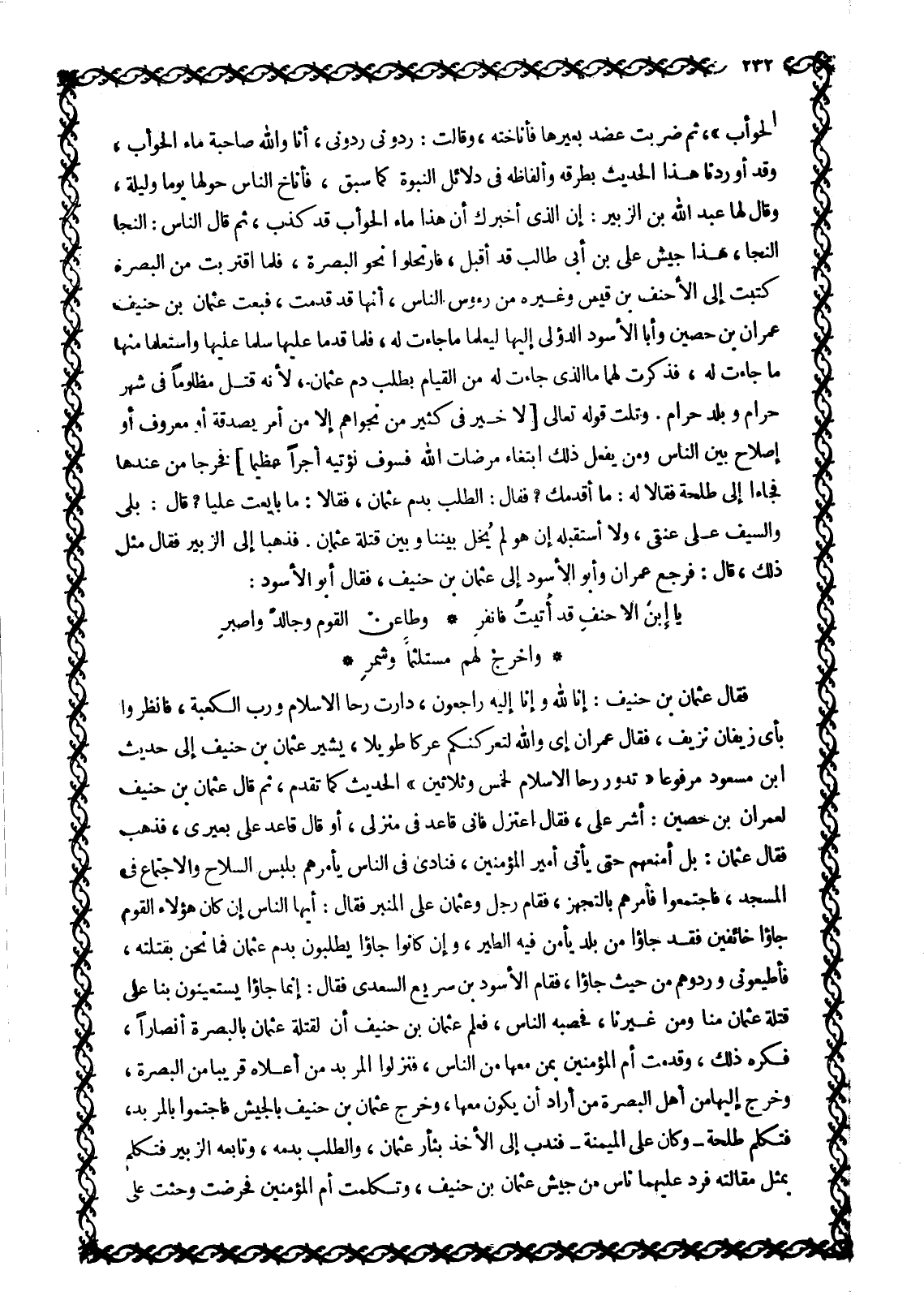 القتال، فتناور طوائف من أطراف الجيش فَتَرَامَوْا بِالْحِجَارَةِ، ثُمَّ تَحَاجَزَ النَّاسُ وَرَجَعَ كُلُّ فَرِيقٍ إِلَى حَوْزَتِهِ، وَقَدْ صَارَتْ طَائِفَةٌ مِنْ جَيْشِ عُثْمَانَ بْنِ حُنَيْفٍ إِلَى جَيْشِ عَائِشَةَ، فكثروا، وجاء حارثة ابن قدامة السعدي فقال: يا أمير الْمُؤْمِنِينَ! وَاللَّهِ لَقَتْلُ عُثْمَانَ أَهْوَنُ مِنْ خُرُوجِكِ مِنْ بَيْتِكِ عَلَى هَذَا الْجَمَلِ عُرْضَةً لِلسِّلَاحِ، إن كنت أتيتينا طَائِعَةً فَارْجِعِي مِنْ حَيْثُ جِئْتِ إِلَى مَنْزِلِكِ، وإن كنت أتيتينا مُكْرَهَةً فَاسْتَعِينِي بِالنَّاسِ فِي الرُّجُوعِ وَأَقْبَلَ حُكَيْمُ بْنُ جَبَلَةَ- وَكَانَ عَلَى خَيْلِ عُثْمَانَ بْنِ حُنَيْفٍ- فَأَنْشَبَ الْقِتَالَ وَجَعَلَ أَصْحَابُ أُمِّ الْمُؤْمِنِينَ يَكُفُّونَ أَيْدِيَهُمْ وَيَمْتَنِعُونَ مِنَ الْقِتَالِ، وَجَعَلَ حُكَيْمٌ يَقْتَحِمُ عَلَيْهِمْ فَاقْتَتَلُوا عَلَى فَمِ السِّكَّةِ، وَأَمَرَتْ عَائِشَةُ أَصْحَابَهَا فَتَيَامَنُوا حَتَّى انْتَهَوْا إِلَى مَقْبَرَةِ بَنِي مَازِنٍ، وَحَجَزَ اللَّيْلُ بَيْنَهُمْ، فَلَمَّا كَانَ اليوم الثاني قصدوا للقتال، فَاقْتَتَلُوا قِتَالًا شَدِيدًا، إِلَى أَنْ زَالَ النَّهَارُ، وَقُتِلَ خَلْقٌ كَثِيرٌ مِنْ أَصْحَابِ ابْنِ حُنَيْفٍ، وَكَثُرَتِ الْجِرَاحُ فِي الْفَرِيقَيْنِ، فَلَمَّا عَضَّتْهُمُ الْحَرْبُ تَدَاعَوْا إِلَى الصُّلْحِ عَلَى أَنْ يَكْتُبُوا بَيْنَهُمْ كِتَابًا وَيَبْعَثُوا رَسُولًا إِلَى أَهْلِ الْمَدِينَةِ يَسْأَلُ أَهْلَهَا، إِنْ كَانَ طَلْحَةُ وَالزُّبَيْرُ أُكْرِهَا عَلَى الْبَيْعَةِ، خَرَجَ عُثْمَانُ بْنُ حُنَيْفٍ عَنِ الْبَصْرَةِ وأخلاها، وَإِنْ لَمْ يَكُونَا أُكْرِهَا عَلَى الْبَيْعَةِ خَرَجَ طلحة والزبير عنها وأخلوها لهم، وَبَعَثُوا بِذَلِكَ كَعْبَ بْنَ سُورٍ الْقَاضِي، فَقَدِمَ الْمَدِينَةَ يَوْمَ الْجُمُعَةِ، فَقَامَ فِي النَّاسِ، فَسَأَلَهُمْ: هَلْ بَايَعَ طَلْحَةُ وَالزُّبَيْرُ طَائِعَيْنِ أَوْ مُكْرَهَيْنِ؟ فَسَكَتَ النَّاسُ فَلَمْ يَتَكَلَّمْ إِلَّا أُسَامَةُ بْنُ زَيْدٍ، فَقَالَ: بَلْ كَانَا مُكْرَهَيْنِ، فَثَارَ إِلَيْهِ بعض الناس فأرادوا ضربه، فحاجف دُونَهُ صُهَيْبٌ، وَأَبُو أَيُّوبَ، وَجَمَاعَةٌ حَتَّى خَلَّصُوهُ، وَقَالُوا لَهُ: مَا وَسِعَكَ مَا وَسِعَنَا مِنَ السُّكُوتِ؟ فَقَالَ:
