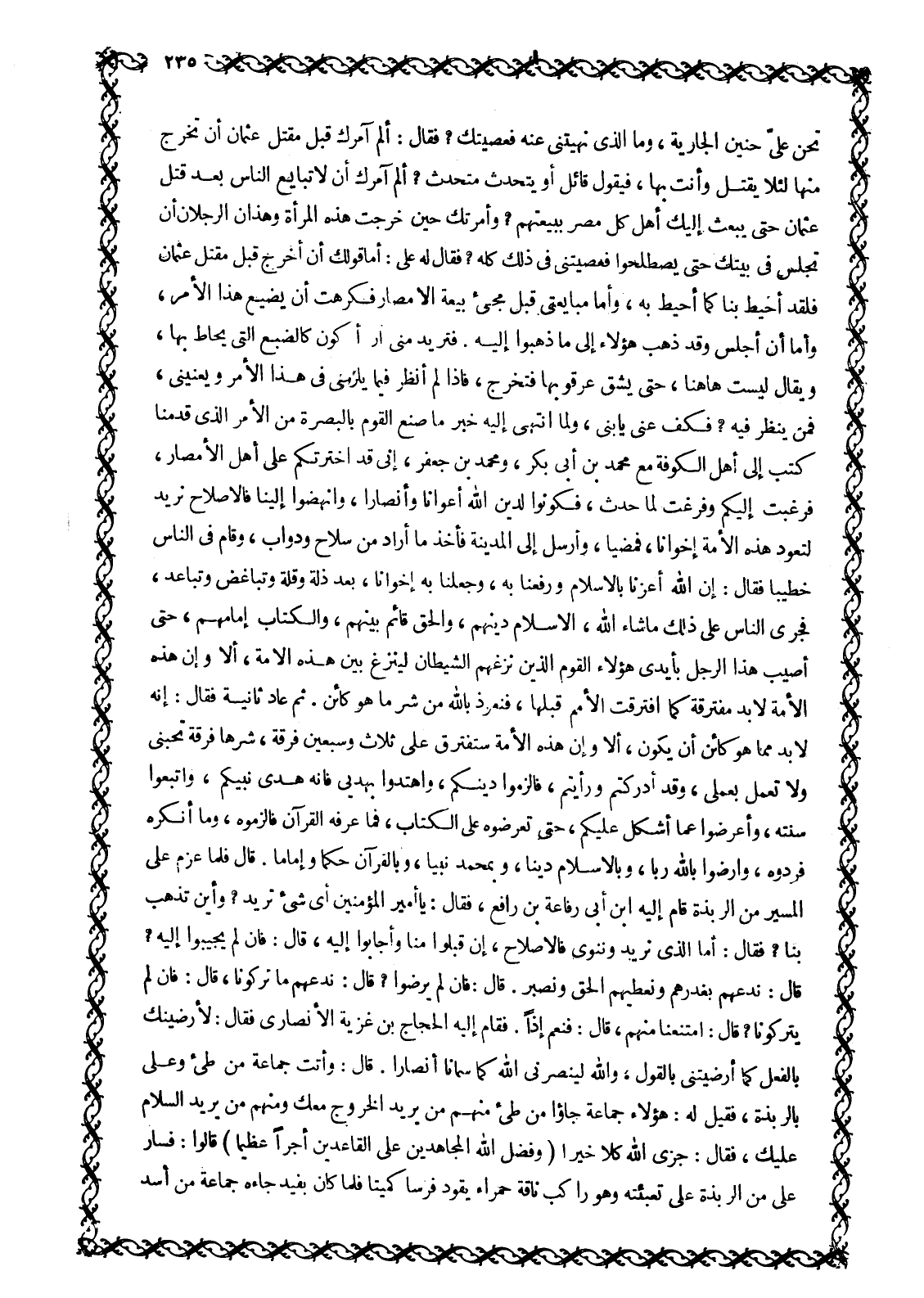 وطيئ، فعرضوا أنفسهم عليه فقال: فيمن مَعِي كِفَايَةٌ، وَجَاءَ رَجُلٌ مِنْ أَهْلِ الْكُوفَةِ يُقَالُ لَهُ عَامِرُ بْنُ مَطَرٍ الشَيْبَانِيُّ، فَقَالَ لَهُ عَلِيٌّ: مَا وَرَاءَكَ؟ فَأَخْبَرَهُ الْخَبَرَ، فَسَأَلَهُ عَنْ أَبِي مُوسَى فَقَالَ: إِنْ أَرَدْتَ الصُّلْحَ فَأَبُو مُوسَى صَاحِبُهُ، وَإِنْ أَرَدْتَ الْقِتَالَ فَلَيْسَ بِصَاحِبِهِ، فَقَالَ عَلِيٌّ: وَاللَّهِ مَا أُرِيدُ إِلَّا الصُّلْحَ مِمَّنْ تَمَرَّدَ عَلَيْنَا. وَسَارَ، فَلَمَّا اقْتَرَبَ مِنَ الْكُوفَةِ وَجَاءَهُ الْخَبَرُ بِمَا وَقَعَ مِنَ الأمر على جليته، من قتل وَمِنْ إِخْرَاجِ عُثْمَانَ بْنِ حُنَيْفٍ مِنَ الْبَصْرَةِ، وَأَخْذِهِمْ أَمْوَالَ بَيْتِ الْمَالِ، جَعَلَ يَقُولُ: اللَّهمّ عَافِنِي مِمَّا ابْتَلَيْتَ بِهِ طَلْحَةَ وَالزُّبَيْرَ، فَلَمَّا انْتَهَى إِلَى ذِي قَارٍ أَتَاهُ عُثْمَانُ بْنُ حُنَيْفٍ مُهَشَّمًا، وَلَيْسَ فِي وَجْهِهِ شَعْرَةٌ فَقَالَ: يَا أَمِيرَ الْمُؤْمِنِينَ بَعَثْتَنِي إِلَى الْبَصْرَةِ وَأَنَا ذو لحية، وقد جئتك أمردا، فقال: أصبت خيرا وأجرا. وَقَالَ عَنْ طَلْحَةَ وَالزُّبَيْرِ: اللَّهمّ احْلُلْ مَا عَقَدَا، وَلَا تُبْرِمْ مَا أَحْكَمَا فِي أَنْفُسِهِمَا، وَأَرِهِمَا الْمَسَاءَةَ فِيمَا قَدْ عَمِلَا- يَعْنِي فِي هَذَا الْأَمْرِ- وَأَقَامَ عَلِيٌّ بِذِي قَارٍ يَنْتَظِرُ جَوَابَ مَا كَتَبَ بِهِ مَعَ مُحَمَّدِ بْنِ أَبِي بَكْرٍ وَصَاحِبِهِ مُحَمَّدِ بْنِ جَعْفَرٍ- وَكَانَا قَدْ قَدِمَا بِكِتَابِهِ عَلَى أَبِي مُوسَى وَقَامَا فِي النَّاسِ بِأَمْرِهِ- فَلَمْ يُجَابَا فِي شَيْءٍ، فلما أمسوا دخل أناس من ذوى الحجى عَلَى أَبِي مُوسَى يَعْرِضُونَ عَلَيْهِ الطَّاعَةَ لِعَلِيٍّ، فَقَالَ: كَانَ هَذَا بِالْأَمْسِ فَغَضِبَ مُحَمَّدٌ وَمُحَمَّدٌ فَقَالَا لَهُ قَوْلًا غَلِيظًا: فَقَالَ لَهُمَا: وَاللَّهِ إِنَّ بَيْعَةَ عُثْمَانَ لَفِي عُنُقِي وَعُنُقِ صَاحِبِكُمَا، فَإِنْ لَمْ يَكُنْ بُدٌّ مِنْ قِتَالٍ فَلَا نُقَاتِلُ أَحَدًا حَتَّى نَفْرَغَ مِنْ قَتَلَةِ عُثْمَانَ حَيْثُ كَانُوا وَمَنْ كَانُوا، فَانْطَلَقَا إِلَى عَلِيٍّ فَأَخْبَرَاهُ الْخَبَرَ، وَهُوَ بِذِي قَارٍ، فَقَالَ لِلْأَشْتَرِ: أنت صاحب أبى موسى والمعرض فِي كُلِّ شَيْءٍ فَاذْهَبْ أَنْتَ وَابْنُ عَبَّاسٍ فَأَصْلِحْ مَا أَفْسَدْتَ، فَخَرَجَا فَقَدِمَا الْكُوفَةَ وَكَلَّمَا أبا موسى واستعانا عليه بنفر من الْكُوفَةِ فَقَامَ فِي النَّاسِ فَقَالَ: أَيُّهَا النَّاسُ، إِنَّ أَصْحَابَ مُحَمَّدٍ صَلَّى اللَّهُ عَلَيْهِ وَسَلَّمَ الَّذِينَ صَحِبُوهُ أَعْلَمُ باللَّه وَرَسُولِهِ مِمَّنْ لَمْ يصحبه، وإن لكم يكن عَلَيْنَا حَقًّا وَأَنَا مُؤَدٍّ إِلَيْكُمْ نَصِيحَةً، كَانَ الرَّأْيُ أَنْ لَا تَسْتَخِفُّوا بِسُلْطَانِ اللَّهِ وَأَنْ لا تجترءوا عَلَى أَمْرِهِ، وَهَذِهِ فِتْنَةٌ النَّائِمُ فِيهَا خَيْرٌ مِنَ الْيَقْظَانِ، وَالْيَقِظَانُ خَيْرٌ مِنَ الْقَاعِدِ، وَالْقَاعِدُ خَيْرٌ مِنَ الْقَائِمِ وَالْقَائِمُ خَيْرٌ مِنَ الرَّاكِبِ، وَالرَّاكِبُ خَيْرٌ مِنَ السَّاعِي فَاغْمِدُوا السُّيُوفَ وَأَنْصِلُوا الْأَسِنَّةَ، وَاقْطَعُوا الْأَوْتَارَ، وَآوُوا الْمُضْطَهَدَ وَالْمَظْلُومَ حَتَّى يَلْتَئِمَ هَذَا الْأَمْرُ، وَتَنْجَلِيَ هَذِهِ الْفِتْنَةُ، فَرَجَعَ ابْنُ عَبَّاسٍ وَالْأَشْتَرُ إِلَى عَلِيٍّ فَأَخْبَرَاهُ الْخَبَرَ، فَأَرْسَلَ الْحَسَنَ وَعَمَّارَ بْنَ يَاسِرٍ، وَقَالَ لِعَمَّارٍ: انْطَلِقْ فَأَصْلِحْ مَا أَفْسَدْتَ، فَانْطَلَقَا حَتَّى دَخَلَا الْمَسْجِدَ فَكَانَ أَوَّلَ مَنْ سَلَّمَ عَلَيْهِمَا مَسْرُوقُ بْنُ الْأَجْدَعِ، فَقَالَ لِعَمَّارٍ: عَلَامَ قَتَلْتُمْ عُثْمَانَ؟ فَقَالَ: عَلَى شَتْمِ أَعْرَاضِنَا وَضَرْبِ أَبْشَارِنَا، فَق