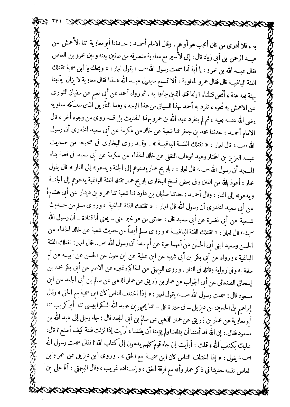 أَحْمَدَ بْنِ عَبْدَانَ أَنَا أَحْمَدُ بْنُ عُبَيْدٍ الله الصفار ثنا الأسقاطي ثنا أبو مصعب ثنا يوسف بن الْمَاجِشُونُ عَنْ أَبِيهِ عَنْ أَبِي عُبَيْدَةَ عَنْ مُحَمَّدِ بْنِ عَمَّارِ بْنِ يَاسِرٍ عَنْ مَوْلَاةٍ لِعَمَّارٍ قَالَتْ: «اشْتَكَى عَمَّارٌ شَكْوَى أَرِقَ مِنْهَا فَغُشِيَ عَلَيْهِ، فَأَفَاقَ وَنَحْنُ نَبْكِي حَوْلَهُ، فَقَالَ: مَا تَبْكُونَ؟ أَتَخْشَوْنَ أَنْ أَمُوتَ عَلَى فِرَاشِي؟ أَخْبَرَنِي حَبِيبِي صَلَّى اللَّهُ عَلَيْهِ وَسَلَّمَ أَنَّهُ تَقْتُلُنِي الْفِئَةُ الْبَاغِيَةُ، وَأَنَّ آخِرَ زَادِي مِنَ الدُّنْيَا مَذْقَةٌ مِنْ لَبَنٍ» وَقَالَ أَحْمَدُ: ثَنَا ابْنُ أَبِي عَدِيٍّ عَنْ دَاوُدَ عَنْ أَبِي نَضْرَةَ عَنْ أَبِي سَعِيدٍ الْخُدْرِيِّ قَالَ: «أَمَرَنَا رَسُولُ اللَّهِ صَلَّى اللَّهُ عَلَيْهِ وَسَلَّمَ بِبِنَاءِ الْمَسْجِدِ فَجَعَلْنَا نَنْقُلُ لَبِنَةً لَبِنَةً وَكَانَ عَمَّارٌ يَنْقُلُ لَبِنَتَيْنِ لَبِنَتَيْنِ، فَتَتَرَّبَ رَأْسُهُ قَالَ: فَحَدَّثَنِي أصحابى ولم أسمعه من رسول الله أَنَّهُ جَعَلَ يَنْفُضُ رَأْسَهُ وَيَقُولُ: وَيْحَكَ يَا ابْنَ سُمَيَّةَ تَقْتُلُكَ الْفِئَةُ الْبَاغِيَةُ» تَفَرَّدَ بِهِ أحمد وما زاده الروافض في هذا الحديث بعد قوله الباغية «لا أنا لها والله شَفَاعَتِي يَوْمَ الْقِيَامَةِ فَهُوَ كَذِبٌ وَبَهْتٌ عَلَى رَسُولِ اللَّهِ صَلَّى اللَّهُ عَلَيْهِ وَسَلَّمَ، فَإِنَّهُ قَدْ ثَبَتَتِ الْأَحَادِيثُ عَنْهُ صَلَوَاتُ اللَّهِ عَلَيْهِ وسلامه بتسمية الفريقين مسلمين، كما سنورده قريبا إن شاء الله. قَالَ ابْنُ جَرِيرٍ وَقَدْ ذُكِرَ أَنَّ عَمَّارًا لَمَّا قُتِلَ قَالَ عَلِيٌّ لِرَبِيعَةَ وَهَمْدَانَ: أَنْتُمْ دِرْعِي وَرُمْحِي، فَانْتُدِبَ لَهُ نَحْوٌ مِنَ اثْنَيْ عشر ألفا، وتقدمهم على ببلغته فَحَمَلَ وَحَمَلُوا مَعَهُ حَمْلَةَ رَجُلٍ وَاحِدٍ، فَلَمْ يَبْقَ لِأَهْلِ الشَّامِ صَفٌّ إِلَّا انْتَقَضَ وَقَتَلُوا كُلَّ مَنِ انْتَهَوْا إِلَيْهِ حَتَّى بَلَغُوا مُعَاوِيَةَ وَعَلِيٌّ يُقَاتِلُ وَيَقُولُ: