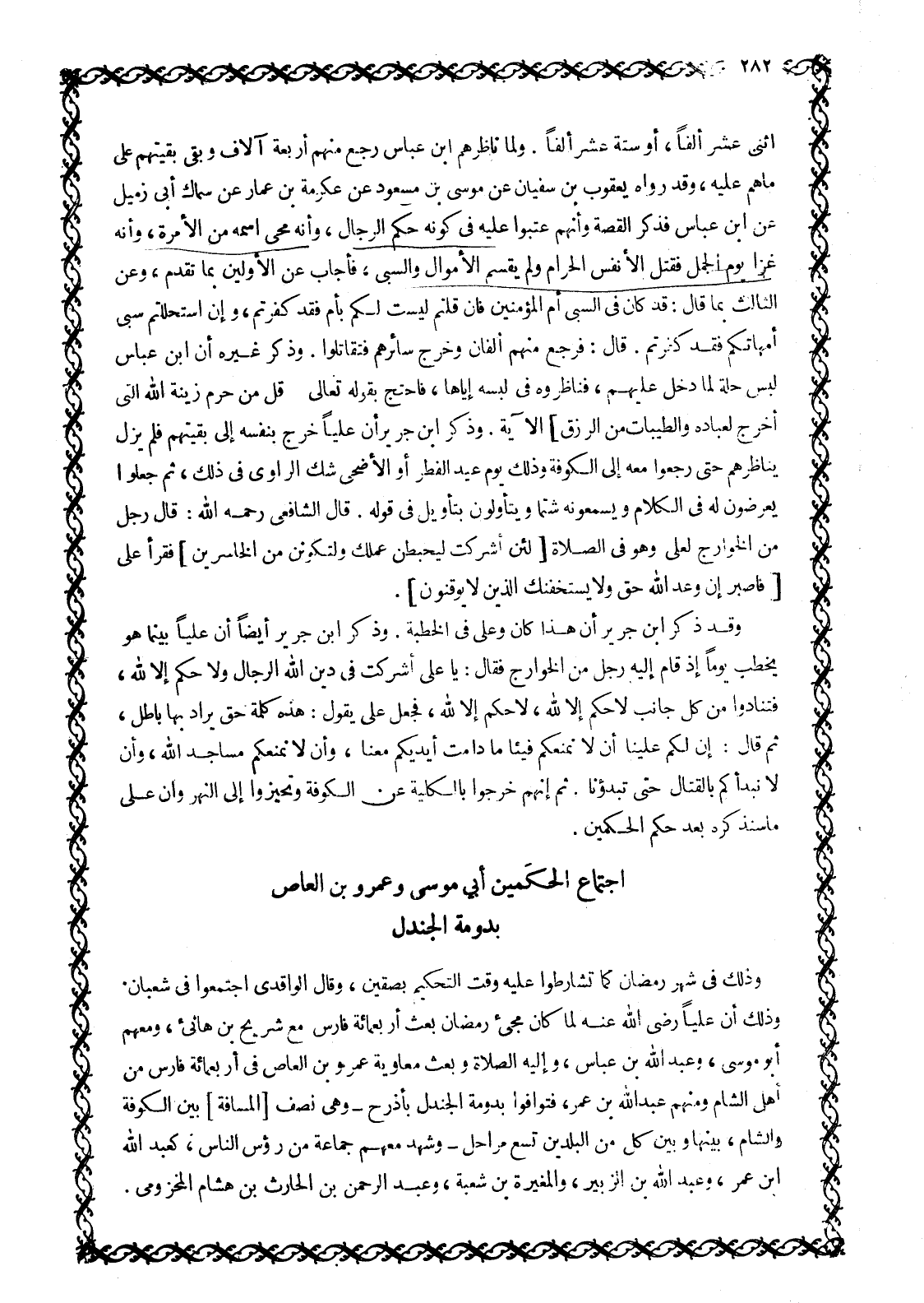 فَقَالَ: يَا بُنَيَّ أَفِي الْفِتْنَةِ تَأْمُرُنِي أَنْ أَكُونَ رَأْسًا؟ لَا وَاللَّهِ حَتَّى أُعْطَى سَيْفًا إِنْ ضَرَبْتُ بِهِ مُؤْمِنًا نَبَا عَنْهُ وَإِنْ ضَرَبْتُ بِهِ كَافِرًا قَتَلْتُهُ، سَمِعْتُ رَسُولَ اللَّهِ صَلَّى اللَّهُ عَلَيْهِ وَسَلَّمَ يَقُولُ: «إِنَّ اللَّهَ يحب الغنى الخفى التقى» وهذا السياق كان عَكْسُ الْأَوَّلِ، وَالظَّاهِرُ أَنَّ عُمَرَ بْنَ سَعْدٍ اسْتَعَانَ بِأَخِيهِ عَامِرٍ عَلَى أَبِيهِ لِيُشِيرَ عَلَيْهِ أَنْ يَحْضُرَ أَمْرَ التَّحْكِيمِ لَعَلَّهُمْ يَعْدِلُونَ عَنْ معاوية وعلى وَيُوَلُّونَهُ فَامْتَنَعَ سَعْدٌ مِنْ ذَلِكَ وَأَبَاهُ أَشَدَّ الْإِبَاءِ وَقَنِعَ بِمَا هُوَ فِيهِ مِنَ الْكِفَايَةِ وَالْخَفَاءِ كَمَا ثَبَتَ فِي صَحِيحِ مُسْلِمٍ أَنَّ رَسُولَ اللَّهِ صَلَّى اللَّهُ عَلَيْهِ وَسَلَّمَ قال: قَدْ «أَفْلَحَ مَنْ أَسْلَمَ وَرُزِقَ كَفَافًا وَقَنَّعَهُ اللَّهُ بِمَا آتَاهُ» وَكَانَ عُمَرُ بْنُ سَعْدٍ هذا يحب الامارة، فَلَمْ يَزَلْ ذَلِكَ دَأْبَهُ حَتَّى كَانَ هُوَ أمير السَّرِيَّةِ الَّتِي قَتَلَتِ الْحُسَيْنَ بْنَ عَلِيٍّ رَضِيَ اللَّهُ عَنْهُ كَمَا سَيَأْتِي بَيَانُهُ فِي مَوْضِعِهِ، ولو قنع بما كان أبوه عليه لم يكن شيء من ذلك. وللمقصود أَنَّ سَعْدًا لَمْ يَحْضُرْ أَمْرَ التَّحْكِيمِ وَلَا أَرَادَ ذَلِكَ وَلَا هَمَّ بِهِ، وَإِنَّمَا حَضَرَهُ مَنْ ذَكَرْنَا. فَلَمَّا اجْتَمَعَ الْحَكَمَانِ تَرَاوَضَا عَلَى المصلحة للمسلمين، ونظرا فِي تَقْدِيرِ أُمُورٍ ثُمَّ اتَّفَقَا عَلَى أَنْ يَعْزِلَا عَلِيًّا وَمُعَاوِيَةَ ثُمَّ يَجْعَلَا الْأَمْرَ شُورَى بَيْنَ النَّاسِ لِيَتَّفِقُوا عَلَى الْأَصْلَحِ لَهُمْ مِنْهُمَا أَوْ مِنْ غَيْرِهِمَا، وَقَدْ أَشَارَ أَبُو مُوسَى بِتَوْلِيَةِ عَبْدِ اللَّهِ بْنِ عُمَرَ بْنِ الْخَطَّابِ، فقال له عمرو: فَوَلِّ ابْنِي عَبْدَ اللَّهِ فَإِنَّهُ يُقَارِبُهُ فِي الْعِلْمِ وَالْعَمَلِ وَالزُّهْدِ. فَقَالَ لَهُ أَبُو مُوسَى: إنك قد غمست ابنك في الفتن مَعَكَ، وَهُوَ مَعَ ذَلِكَ رَجُلُ صِدْقٍ.