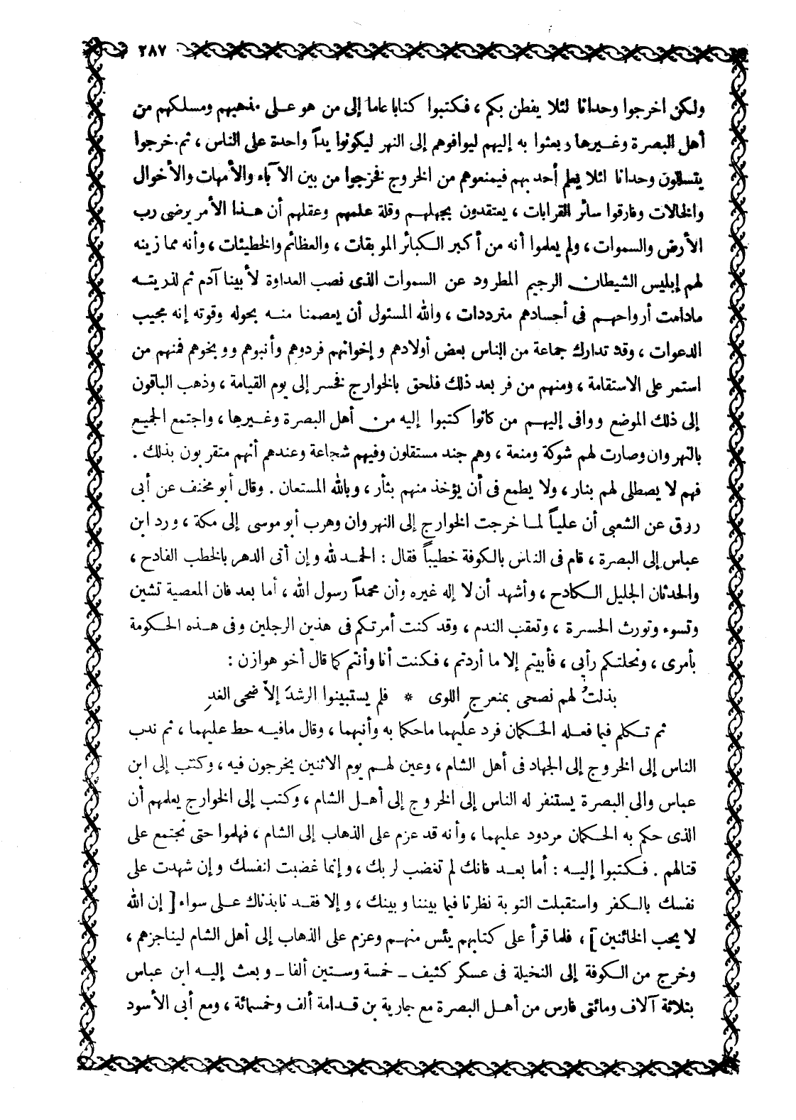 الدؤلي ألف وسبعمائة، فكمل جيش على فِي ثَمَانِيَةٍ وَسِتِّينَ أَلْفَ فَارِسٍ وَمِائَتَيْ فَارِسٍ وقام على أمير المؤمنين خطيبا فحثهم على الجهاد والصبر عند لقاء العدو، وهو عازم على الشام، فبينما هو كذلك إِذْ بَلَغَهُ أَنَّ الْخَوَارِجَ قَدْ عَاثُوا فِي الأرض فسادا وسفكوا الدماء وقطعوا السبل وَاسْتَحَلُّوا الْمَحَارِمَ، وَكَانَ مِنْ جُمْلَةِ مَنْ قَتَلُوهُ عَبْدُ اللَّهِ بْنُ خَبَّابٍ صَاحِبَ رَسُولِ اللَّهِ صَلَّى اللَّهُ عَلَيْهِ وَسَلَّمَ، أَسَرُوهُ وَامْرَأَتَهُ مَعَهُ وهي حامل فقالوا: من أنت؟ قال: أَنَا عَبْدُ اللَّهِ بْنُ خَبَّابٍ صَاحِبَ رَسُولِ اللَّهِ صَلَّى اللَّهُ عَلَيْهِ وَسَلَّمَ وانكم قَدْ رَوَّعْتُمُونِي فَقَالُوا: لَا بَأْسَ عَلَيْكَ، حَدِّثْنَا مَا سَمِعْتَ مِنْ أَبِيكَ فَقَالَ: سَمِعْتُ أَبِي يَقُولُ: سَمِعْتُ رَسُولَ اللَّهِ صَلَّى اللَّهُ عَلَيْهِ وَسَلَّمَ يَقُولُ: «سَتَكُونُ فِتْنَةٌ الْقَاعِدُ فِيهَا خَيْرٌ مِنَ الْقَائِمِ، وَالْقَائِمُ خَيْرٌ مِنَ الْمَاشِي، وَالْمَاشِي خَيْرٌ مِنَ السَّاعِي» فاقتادوه بِيَدِهِ فَبَيْنَمَا هُوَ يَسِيرُ مَعَهُمْ إِذْ لَقِيَ بَعْضُهُمْ خِنْزِيرًا لِبَعْضِ أَهْلِ الذِّمَّةِ فَضَرَبَهُ بَعْضُهُمْ فَشَقَّ جِلْدَهُ فَقَالَ لَهُ آخَرُ: لِمَ فَعَلْتَ هَذَا وَهُوَ لِذِمِّيٍّ؟ فَذَهَبَ إِلَى ذَلِكَ الذِّمِّيِّ فاستحله وأرضاه وبينا هُوَ مَعَهُمْ إِذْ سَقَطَتْ تَمْرَةٌ مِنْ نَخْلَةٍ فَأَخَذَهَا أَحَدُهُمْ فَأَلْقَاهَا فِي فَمِهِ، فَقَالَ لَهُ آخَرُ: بِغَيْرِ إِذْنٍ وَلَا ثَمَنٍ؟ فَأَلْقَاهَا ذَاكَ مِنْ فَمِهِ، وَمَعَ هَذَا قَدَّمُوا عَبْدَ اللَّهِ بْنَ خَبَّابٍ فَذَبَحُوهُ، وَجَاءُوا إِلَى امْرَأَتِهِ فَقَالَتْ: إني امرأة حبلى، ألا تتقون الله، فَذَبَحُوهَا وَبَقَرُوا بَطْنَهَا عَنْ وَلَدِهَا، فَلَمَّا بَلَغَ النَّاسَ هَذَا مِنْ صَنِيعِهِمْ خَافُوا إِنْ هُمْ ذهبوا إلى الشام واشتغلوا بقتال أهله أن يخلفهم هؤلاء في ذراريهم وديارهم بهذا الصنع، فَخَافُوا غَائِلَتَهُمْ، وَأَشَارُوا عَلَى عَلِيٍّ بِأَنْ يَبْدَأَ بهؤلاء، ثم إذا فرغ منهم ذهب إلى أهل الشام بعد ذلك والناس آمنون من شر هؤلاء فَاجْتَمَعَ الرَّأْيُ عَلَى هَذَا وَفِيهِ خِيَرَةٌ عَظِيمَةٌ لهم ولأهل الشام أيضا فأرسل على إلى الخوارج رسولا من جهته وهو الحرب بن مرة العبديّ، فقال: اخْبُرْ لِي خَبَرَهُمْ، وَاعْلَمْ لِي أَمْرَهُمْ وَاكْتُبْ إِلَيَّ بِهِ عَلَى الْجَلِيَّةِ، فَلَمَّا قَدِمَ عَلَيْهِمُ قَتَلُوهُ وَلَمْ يُنْظِرُوهُ، فَلَمَّا بَلَغَ ذَلِكَ عَلِيًّا عزم على الذهاب إليهم أولا قبل أَهْلَ الشَّامِ.