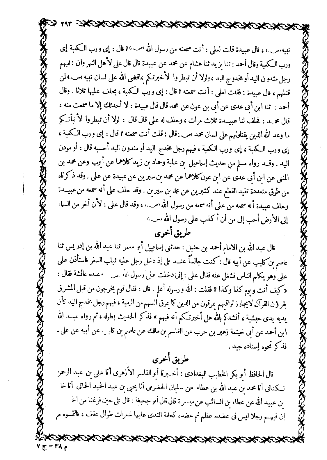قَالَ الْإِمَامُ أَحْمَدُ: حَدَّثَنَا أَبُو سَعِيدٍ مَوْلَى بَنِي هَاشِمٍ ثَنَا إِسْمَاعِيلُ بْنُ مُسْلِمٍ الْعَبْدِيُّ ثَنَا أَبُو كَثِيرٍ مَوْلَى الْأَنْصَارِ قَالَ: كُنْتُ مَعَ سَيِّدِي مَعَ عَلِيِّ بْنِ أَبِي طَالِبٍ حَيْثُ قُتِلَ أَهْلُ النَّهْرَوَانِ، فَكَأَنَّ النَّاسَ وَجَدُوا فِي أَنْفُسِهِمْ مِنْ قَتْلِهِمْ، فَقَالَ عَلِيٌّ: يَا أَيُّهَا النَّاسُ إِنَّ رَسُولَ اللَّهِ صَلَّى اللَّهُ عَلَيْهِ وَسَلَّمَ «قَدْ حَدَّثَنَا بِأَقْوَامٍ يَمْرُقُونَ مِنَ الدِّينِ كَمَا يَمْرُقُ السَّهْمُ مِنَ الرَّمِيَّةِ ثُمَّ لَا يَرْجِعُونَ فِيهِ أَبَدًا حَتَّى يَرْجِعَ السَّهْمُ عَلَى فُوقِهِ، وَإِنَّ آيَةَ ذَلِكَ أَنَّ فِيهِمْ رَجُلًا أَسْوَدَ مُخْدَجَ الْيَدِ إِحْدَى يَدَيْهِ كَثَدْيِ الْمَرْأَةِ، لَهَا حَلَمَةٌ كَحَلَمَةِ ثَدْيِ الْمَرْأَةِ، حَوْلَهُ سَبْعُ هَلَبَاتٍ فَالْتَمِسُوهُ فَإِنِّي أُرَاهُ فِيهِمْ، فَالْتَمَسُوهُ فَوَجَدُوهُ إِلَى شَفِيرِ النَّهْرِ تَحْتَ الْقَتْلَى فَأَخْرَجُوهُ فَكَبَّرَ عَلِيٌّ، فَقَالَ: اللَّهُ أَكْبَرُ! صَدَقَ اللَّهُ وَرَسُولُهُ، وَإِنَّهُ لَمُتَقَلِّدٌ قَوْسًا لَهُ عَرَبِيَّةً فَأَخَذَهَا بِيَدِهِ فَجَعَلَ يَطْعَنُ بِهَا فِي مُخْدَجَتِهِ وَيَقُولُ: صَدَقَ اللَّهُ وَرَسُولُهُ. وَكَبَّرَ النَّاسُ حِينَ رَأَوْهُ وَاسْتَبْشَرُوا وَذَهَبَ عَنْهُمْ مَا كَانُوا يَجِدُونَ» تَفَرَّدَ بِهِ أَحْمَدُ.
