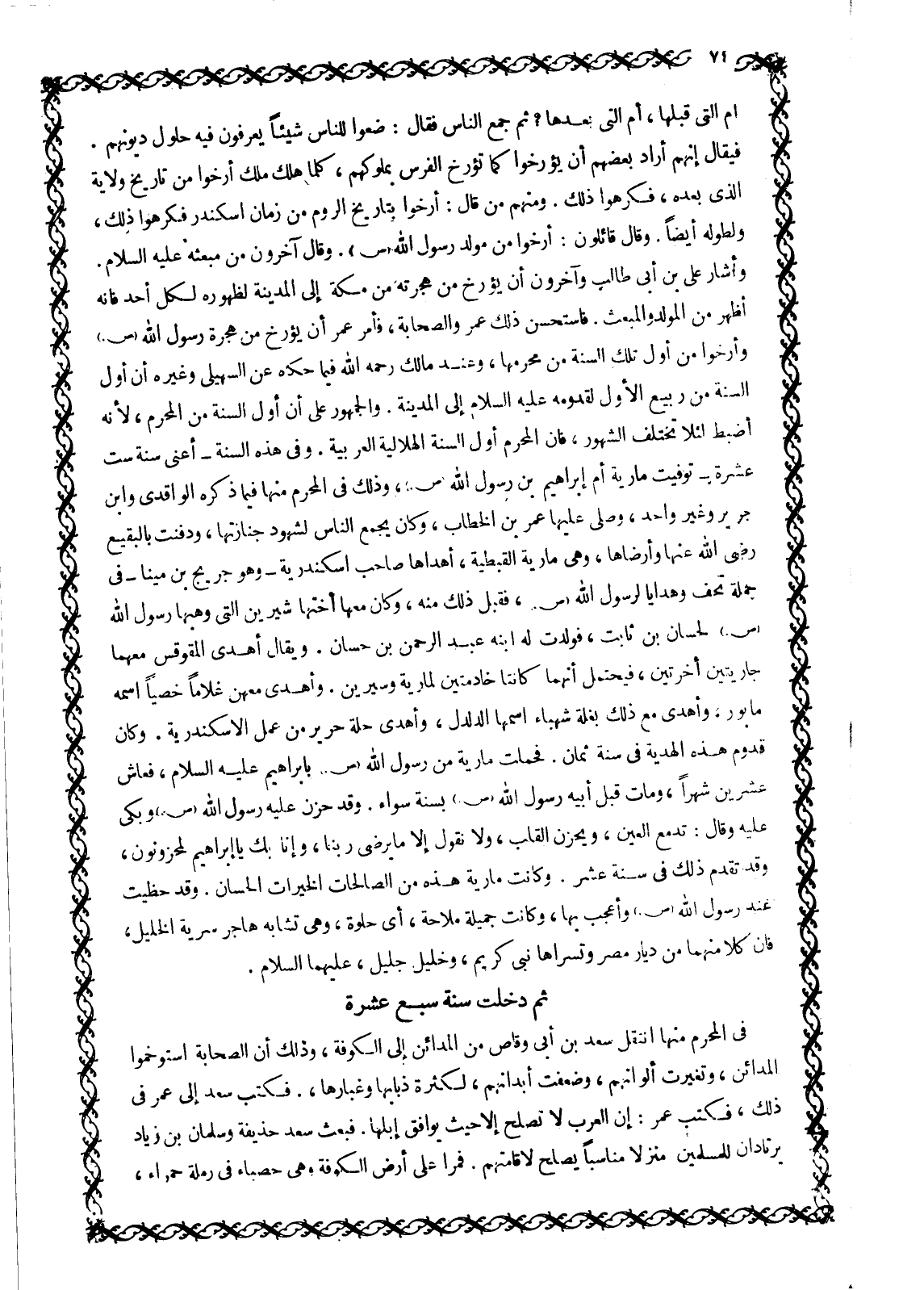 وَأَشَارَ عَلِيُّ بْنُ أَبِي طَالِبٍ وَآخَرُونَ أَنْ يُؤَرَّخَ مِنْ هِجْرَتِهِ مِنْ مَكَّةَ إِلَى الْمَدِينَةِ لِظُهُورِهِ لِكُلِّ أَحَدٍ فَإِنَّهُ أَظْهَرُ مِنَ الْمَوْلِدِ وَالْمَبْعَثِ. فَاسْتَحْسَنَ ذَلِكَ عُمَرُ وَالصَّحَابَةُ، فَأَمَرَ عُمَرُ أَنْ يُؤَرَّخَ مِنْ هِجْرَةِ رَسُولِ اللَّهِ صَلَّى اللَّهُ عَلَيْهِ وَسَلَّمَ وَأَرَّخُوا مِنْ أَوَّلِ تِلْكَ السَّنَةِ مِنْ مُحَرَّمِهَا، وَعِنْدَ مَالِكٍ رَحِمَهُ اللَّهُ فيما حكاه عن السُّهَيْلِيُّ وَغَيْرُهُ أَنَّ أَوَّلَ السَّنَةِ مِنْ رَبِيعٍ الأول لقدومه عليه السلام إلى المدينة. وَالْجُمْهُورُ عَلَى أَنَّ أَوَّلَ السَّنَةِ مِنَ الْمُحَرَّمِ، لِأَنَّهُ أَضْبَطُ لِئَلَّا تَخْتَلِفَ الشُّهُورُ، فَإِنَّ الْمُحَرَّمَ أَوَّلُ السَّنَةِ الْهِلَالِيَّةِ الْعَرَبِيَّةِ. وَفِي هَذِهِ السَّنَةِ- أَعْنِي سَنَةَ سِتَّ عَشْرَةَ- تُوُفِّيَتْ مَارِيَةُ أُمُّ إِبْرَاهِيمَ بْنِ رَسُولِ اللَّهِ صَلَّى اللَّهُ عَلَيْهِ وَسَلَّمَ، وَذَلِكَ فِي الْمُحَرَّمِ مِنْهَا فِيمَا ذَكَرَهُ الْوَاقِدِيُّ وَابْنُ جَرِيرٍ وَغَيْرُ وَاحِدٍ، وَصَلَّى عَلَيْهَا عُمَرُ بْنُ الْخَطَّابِ، وَكَانَ يَجْمَعُ النَّاسَ لِشُهُودِ جِنَازَتِهَا، وَدُفِنَتْ بِالْبَقِيعِ رَضِيَ اللَّهُ عَنْهَا وَأَرْضَاهَا، وَهِيَ مَارِيَةُ الْقِبْطِيَّةُ، أَهْدَاهَا صَاحِبُ إِسْكَنْدَرِيَّةَ- وَهُوَ جُرَيْجُ بْنُ مِينَا- فِي جُمْلَةِ تُحَفٍ وَهَدَايَا لِرَسُولِ اللَّهِ صَلَّى اللَّهُ عَلَيْهِ وَسَلَّمَ، فَقَبَّلَ ذَلِكَ مِنْهُ، وكان معها أختها شيرين الَّتِي وَهَبَهَا رَسُولُ اللَّهِ صَلَّى اللَّهُ عَلَيْهِ وَسَلَّمَ لِحَسَّانَ بْنِ ثَابِتٍ، فَوَلَدَتْ لَهُ ابْنَهُ عَبْدَ الرَّحْمَنِ بْنَ حَسَّانَ. وَيُقَالُ أَهْدَى الْمُقَوْقِسُ معهما جاريتين أخرتين، فَيُحْتَمَلُ أَنَّهُمَا كَانَتَا خَادِمَتَيْنِ لِمَارِيَةَ وَسِيرِينَ. وَأَهْدَى مَعَهُنَّ غُلَامًا خَصِيًّا اسْمُهُ مَأْبُورٌ، وَأَهْدَى مَعَ ذَلِكَ بَغْلَةً شَهْبَاءَ اسْمُهَا الدُّلْدُلُ، وَأَهْدَى حُلَّةَ حَرِيرٍ مِنْ عَمَلِ الْإِسْكَنْدَرِيَّةِ. وَكَانَ قُدُومُ هَذِهِ الْهَدِيَّةِ فِي سَنَةِ ثَمَانٍ. فَحَمَلَتْ مَارِيَةُ مِنْ رَسُولِ اللَّهِ صَلَّى اللَّهُ عَلَيْهِ وَسَلَّمَ بِإِبْرَاهِيمَ عَلَيْهِ السَّلَامُ، فَعَاشَ عِشْرِينَ شَهْرًا، وَمَاتَ قَبْلَ أَبِيهِ رَسُولِ اللَّهِ صَلَّى اللَّهُ عَلَيْهِ وَسَلَّمَ بِسَنَةٍ سَوَاءٍ. وَقَدْ حَزِنَ عَلَيْهِ رَسُولُ اللَّهِ صَلَّى اللَّهُ عَلَيْهِ وَسَلَّمَ وَبَكَى عَلَيْهِ وَقَالَ: تَدْمَعُ الْعَيْنُ، وَيَحْزَنُ الْقَلْبُ، وَلَا نَقُولُ إِلَّا مَا يُرْضِي رَبَّنَا، وَإِنَّا بِكَ يَا إِبْرَاهِيمُ لَمَحْزُونُونَ، وَقَدْ تَقَدَّمَ ذَلِكَ فِي سَنَةِ عَشْرٍ. وَكَانَتْ مَارِيَةُ هَذِهِ مِنَ الصَّالِحَاتِ الْخَيِّرَاتِ الْحِسَانِ. وَقَدْ حَظِيَتْ عِنْدَ رَسُولِ اللَّهِ صَلَّى اللَّهُ عَلَيْهِ وَسَلَّمَ وَأُعْجِبَ بِهَا، وَكَانَتْ جَمِيلَةً مُلَّاحَةً، أَيْ حُلْوَةً، وَهِيَ تُشَابِهُ هَاجَرَ سُرِّيَّةَ الْخَلِيلِ، فَإِنَّ كُلًّا مِنْهُمَا مِنْ دِيَارِ مِصْرَ وَتَسَرَّاهَا نَبِيٌّ كَرِيمٌ، وَخَلِيلٌ جَلِيلٌ، عَلَيْهِمَا السَّلَامُ.