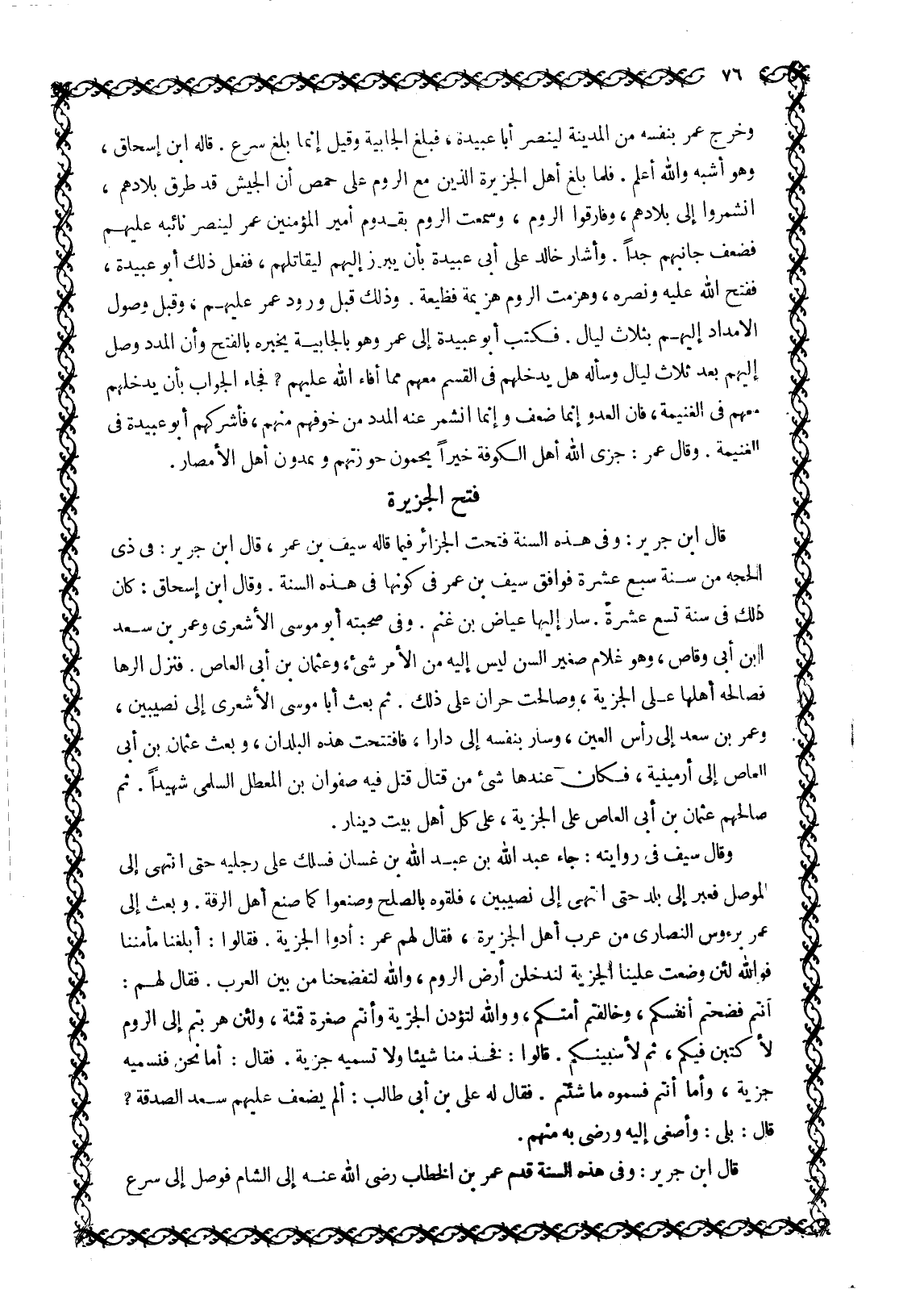 قَالَ ابْنُ جَرِيرٍ: وَفِي هَذِهِ السنة فتحت الجزائر فِيمَا قَالَهُ سَيْفُ بْنُ عُمَرَ، قَالَ ابْنُ جَرِيرٍ: فِي ذِي الْحِجَّةِ مِنْ سَنَةِ سَبْعَ عَشْرَةَ فَوَافَقَ سَيْفَ بْنَ عُمَرَ فِي كَوْنِهَا فِي هَذِهِ السَّنَةِ. وَقَالَ ابْنُ إِسْحَاقَ: كَانَ ذَلِكَ فِي سَنَةِ تِسْعَ عَشْرَةَ. سَارَ إِلَيْهَا عِيَاضُ بْنُ غَنْمٍ. وَفِي صُحْبَتِهِ أَبُو مُوسَى الأشعري وعمر بن سعد ابن أَبِي وَقَّاصٍ، وَهُوَ غُلَامٌ صَغِيرُ السِّنِّ لَيْسَ إِلَيْهِ مِنَ الْأَمْرِ شَيْءٌ، وَعُثْمَانُ بْنُ أَبِي الْعَاصِ. فَنَزَلَ الرُّهَا فَصَالَحَهُ أَهْلُهَا عَلَى الْجِزْيَةِ، وَصَالَحَتْ حَرَّانُ عَلَى ذَلِكَ. ثُمَّ بَعَثَ أَبَا مُوسَى الْأَشْعَرِيَّ إِلَى نَصِيبِينَ، وَعُمَرَ بْنَ سَعْدٍ إِلَى رَأْسِ الْعَيْنِ، وَسَارَ بِنَفْسِهِ إِلَى دَارَا، فَافْتُتِحَتْ هَذِهِ الْبُلْدَانُ، وَبَعَثَ عُثْمَانَ بْنَ أَبِي الْعَاصِ إِلَى إِرْمِينِيَةَ، فَكَانَ عِنْدَهَا شَيْءٌ مِنْ قِتَالٍ قُتِلَ فِيهِ صَفْوَانُ بْنُ الْمُعَطَّلِ السُّلَمِيُّ شَهِيدًا. ثُمَّ صَالَحَهُمْ عُثْمَانُ بْنُ أَبِي الْعَاصِ عَلَى الْجِزْيَةِ، عَلَى كُلِّ أَهْلِ بَيْتٍ دِينَارٌ.
