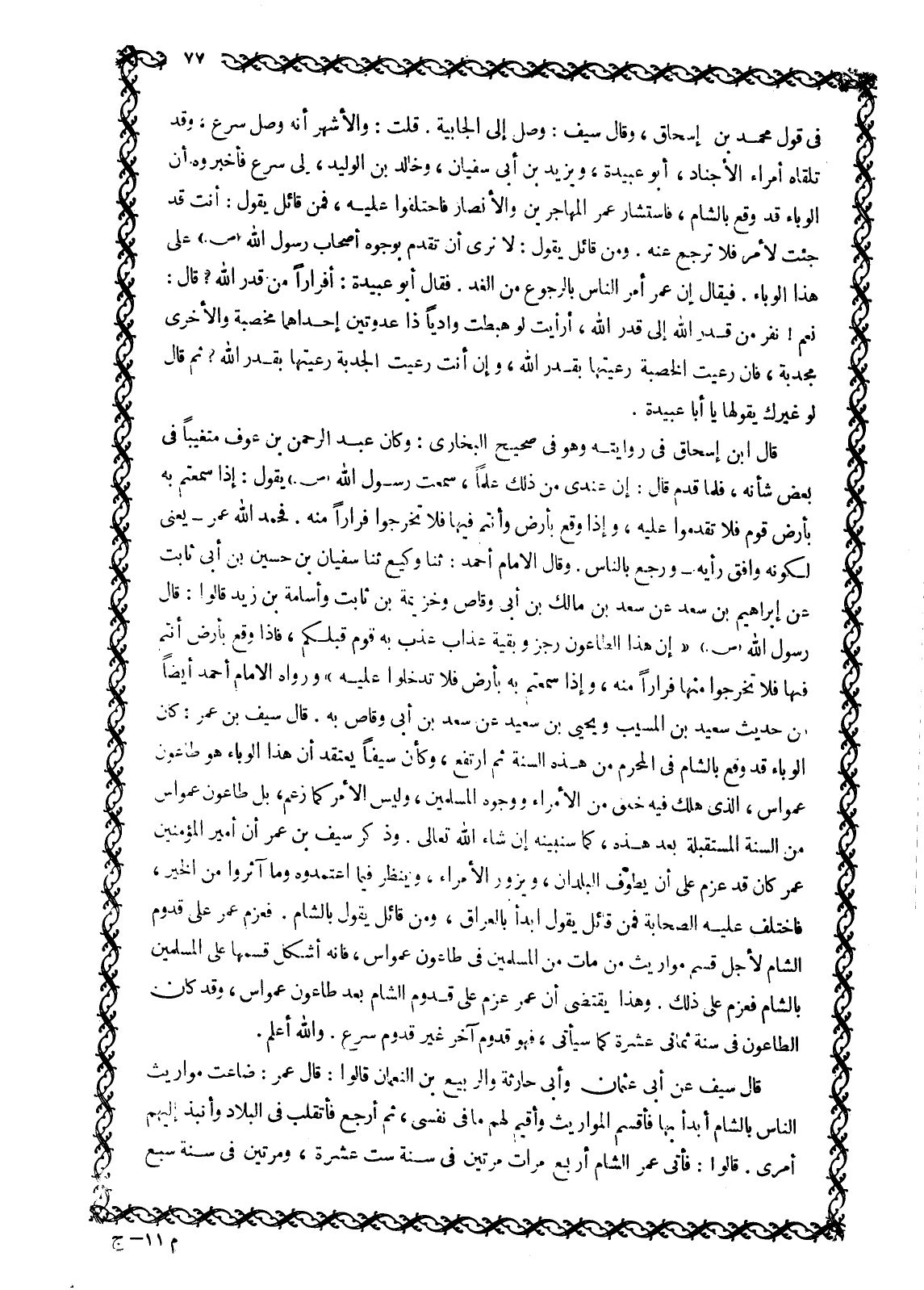 قَالَ ابْنُ إِسْحَاقَ فِي رِوَايَتِهِ وَهُوَ فِي صَحِيحِ الْبُخَارِيِّ: وَكَانَ عَبْدُ الرَّحْمَنِ بْنُ عَوْفٍ مُتَغَيِّبًا فِي بَعْضِ شَأْنِهِ، فَلَمَّا قَدِمَ قَالَ: إِنَّ عِنْدِي مِنْ ذَلِكَ عِلْمًا، سَمِعْتُ رَسُولَ اللَّهِ صَلَّى اللَّهُ عَلَيْهِ وَسَلَّمَ، يَقُولُ: إِذَا سمعتم به بأرض قوم فَلَا تَقْدَمُوا عَلَيْهِ، وَإِذَا وَقَعَ بِأَرْضٍ وَأَنْتُمْ فيها فلا تَخْرُجُوا فِرَارًا مِنْهُ. فَحَمِدَ اللَّهَ عُمَرُ- يَعْنِي لِكَوْنِهِ وَافَقَ رَأْيَهُ- وَرَجَعَ بِالنَّاسِ. وَقَالَ الْإِمَامُ أَحْمَدُ: ثَنَا وَكِيعٌ ثَنَا سُفْيَانُ بن حسين بْنِ أَبِي ثَابِتٍ عَنْ إِبْرَاهِيمَ بْنِ سَعْدِ عَنْ سَعْدِ بْنِ مَالِكِ بْنِ أَبِي وَقَّاصٍ وَخُزَيْمَةَ بْنِ ثَابِتٍ وَأُسَامَةَ بْنِ زَيْدٍ قَالُوا: قَالَ رَسُولُ اللَّهِ صَلَّى اللَّهُ عَلَيْهِ وَسَلَّمَ: «إِنَّ هَذَا الطَّاعُونَ رِجْزٌ وَبَقِيَّةُ عَذَابٍ عُذِّبَ بِهِ قَوْمٌ قَبْلَكُمْ، فَإِذَا وَقَعَ بِأَرْضٍ أَنْتُمْ فيها فَلَا تَخْرُجُوا مِنْهَا فِرَارًا مِنْهُ، وَإِذَا سَمِعْتُمْ بِهِ بِأَرْضٍ فَلَا تَدْخُلُوا عَلَيْهِ» وَرَوَاهُ الْإِمَامُ أَحْمَدُ أَيْضًا مِنْ حَدِيثِ سَعِيدِ بْنِ الْمُسَيَّبِ ويحيى بن سعيد عَنْ سَعْدِ بْنِ أَبِي وَقَّاصٍ بِهِ. قَالَ سَيْفُ بْنُ عُمَرَ: كَانَ الْوَبَاءُ قَدْ وَقَعَ بالشام في المحرم من هذه السنة ثُمَّ ارْتَفَعَ، وَكَأَنَّ سَيْفًا يَعْتَقِدُ أَنَّ هَذَا الْوَبَاءَ هُوَ طَاعُونُ عَمَوَاسَ، الَّذِي هَلَكَ فِيهِ خَلْقٌ مِنَ الْأُمَرَاءِ وَوُجُوهِ الْمُسْلِمِينَ، وَلَيْسَ الْأَمْرُ كَمَا زَعَمَ، بَلْ طَاعُونُ عَمَوَاسَ مِنَ السَّنَةِ الْمُسْتَقْبَلَةِ بَعْدَ هَذِهِ، كَمَا سَنُبَيِّنُهُ إِنْ شَاءَ اللَّهُ تَعَالَى. وَذَكَرَ سَيْفُ بْنُ عُمَرَ أَنَّ أَمِيرَ الْمُؤْمِنِينَ عُمَرَ كَانَ قَدْ عَزَمَ عَلَى أَنْ يَطُوفَ الْبُلْدَانَ، وَيَزُورَ الْأُمَرَاءَ، وَيَنْظُرَ فِيمَا اعْتَمَدُوهُ وَمَا آثَرُوا مِنَ الْخَيْرِ، فَاخْتَلَفَ عَلَيْهِ الصَّحَابَةُ فَمِنْ قَائِلٍ يَقُولُ ابْدَأْ بِالْعِرَاقِ، وَمِنْ قَائِلٍ يَقُولُ بِالشَّامِ، فَعَزَمَ عُمَرُ عَلَى قُدُومِ الشَّامِ لِأَجْلِ قَسْمِ مَوَارِيثِ مَنْ مَاتَ مِنَ الْمُسْلِمِينَ فِي طَاعُونِ عَمَوَاسَ، فَإِنَّهُ أَشْكَلَ قَسْمُهَا عَلَى الْمُسْلِمِينَ بِالشَّامِ فَعَزَمَ عَلَى ذَلِكَ. وَهَذَا يَقْتَضِي أَنَّ عُمَرَ عَزَمَ عَلَى قُدُومِ الشَّامِ بَعْدَ طَاعُونِ عَمَوَاسَ، وَقَدْ كَانَ الطَّاعُونُ فِي سَنَةِ ثَمَانِي عَشْرَةَ كَمَا سَيَأْتِي، فَهُوَ قُدُومٌ آخر غير قدوم سرع. وَاللَّهُ أَعْلَمُ.