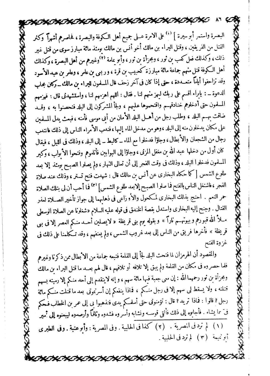 الْبَصْرَةِ وَاسْتَمَرَّ أَبُو سَبْرَةَ] [1] عَلَى الْإِمْرَةِ عَلَى جَمِيعِ أَهْلِ الْكُوفَةِ وَالْبَصْرَةِ، فَحَاصَرَهُمْ أَشْهُرًا وَكَثُرَ الْقَتْلُ مِنَ الْفَرِيقَيْنِ، وَقَتَلَ الْبَرَاءُ بْنُ مَالِكٍ أخو أنس بن مالك يومئذ مائة مبارز سِوَى مَنْ قَتَلَ غَيْرَ ذَلِكَ، وَكَذَلِكَ فَعَلَ كعب بن ثور، ومجزأة بن ثور، وأبو يمامة [2] وَغَيْرُهُمْ مِنْ أَهْلِ الْبَصْرَةِ، وَكَذَلِكَ أَهْلُ الْكُوفَةِ قَتَلَ مِنْهُمْ جَمَاعَةٌ مِائَةً مُبَارَزَةً كَحَبِيبِ بْنِ قُرَّةَ، وَرِبْعِيِّ بْنِ عَامِرٍ، وَعَامِرِ بْنِ عَبْدِ الْأَسْوَدِ وَقَدْ تَزَاحَفُوا أَيَّامًا مُتَعَدِّدَةً، حَتَّى إِذَا كَانَ فِي آخِرِ زَحْفٍ قَالَ الْمُسْلِمُونَ لِلْبَرَاءِ، بْنِ مَالِكٍ- وَكَانَ مُجَابَ الدَّعْوَةِ-: يَا بَرَاءُ أَقْسِمْ عَلَى رَبِّكَ لَيَهْزِمَنَّهُمْ لَنَا. فَقَالَ: اللَّهمّ اهمزهم لَنَا، وَاسْتَشْهِدْنِي قَالَ: فَهَزَمَهُمُ الْمُسْلِمُونَ حَتَّى أَدْخَلُوهُمْ خَنَادِقَهُمْ وَاقْتَحَمُوهَا عَلَيْهِمْ، وَلَجَأَ الْمُشْرِكُونَ إِلَى الْبَلَدِ فَتَحَصَّنُوا بِهِ، وَقَدْ ضَاقَتْ بِهِمُ الْبَلَدُ، وَطَلَبَ رَجُلٌ مِنْ أَهْلِ الْبَلَدِ الْأَمَانَ مِنْ أَبِي مُوسَى فَأَمَّنَهُ، فَبَعَثَ يَدُلُّ الْمُسْلِمِينَ عَلَى مَكَانٍ يَدْخُلُونَ مِنْهُ إِلَى الْبَلَدِ، وَهُوَ مِنْ مَدْخَلِ الْمَاءِ إِلَيْهَا، فَنَدَبَ الْأُمَرَاءُ النَّاسَ إِلَى ذَلِكَ فانتدب رِجَالٌ مِنَ الشُّجْعَانِ وَالْأَبْطَالِ، وَجَاءُوا فَدَخَلُوا مَعَ الْمَاءِ- كَالْبَطِّ- إِلَى الْبَلَدِ، وَذَلِكَ فِي اللَّيْلِ، فيقال كان أول من دخلها عَبْدُ اللَّهِ بْنُ مُغَفَّلٍ الْمُزَنِيُّ، وَجَاءُوا إِلَى الْبَوَّابِينَ فَأَنَامُوهُمْ وَفَتَحُوا الْأَبْوَابَ، وَكَبَّرَ الْمُسْلِمُونَ فَدَخَلُوا الْبَلَدَ، وَذَلِكَ فِي وَقْتِ الْفَجْرِ إِلَى أَنْ تَعَالَى النَّهَارُ، وَلَمْ يُصَلُّوا الصُّبْحَ يَوْمَئِذٍ إِلَّا بَعْدَ طُلُوعِ الشَّمْسِ [كَمَا حَكَاهُ الْبُخَارِيُّ عَنْ أَنَسِ بْنِ مَالِكٍ قَالَ: شَهِدْتُ فَتْحَ تُسْتَرَ، وذلك عند صلاة الْفَجْرِ، فَاشْتَغَلَ النَّاسُ بِالْفَتْحِ فَمَا صَلَّوُا الصُّبْحَ إِلَّا بَعْدَ طُلُوعِ الشَّمْسِ] [3] فَمَا أُحِبُّ أَنَّ لِي بِتِلْكَ الصَّلَاةِ حُمْرَ النَّعَمِ. احْتَجَّ بِذَلِكَ الْبُخَارِيُّ لِمَكْحُولٍ وَالْأَوْزَاعِيِّ فِي ذَهَابِهِمَا إِلَى جَوَازِ تَأْخِيرِ الصَّلَاةِ لِعُذْرِ الْقِتَالِ. وَجَنَحَ إِلَيْهِ الْبُخَارِيُّ واستدل بقصة الخندق في قوله عليه السّلام «شَغَلُونَا عَنِ الصَّلَاةِ الْوُسْطَى مَلَأَ اللَّهُ قُبُورَهُمْ وَبُيُوتَهُمْ نَارًا» وَبِقَوْلِهِ يَوْمَ بَنِي قُرَيْظَةَ «لَا يُصَلِّيَنَّ أَحَدٌ مِنْكُمُ الْعَصْرَ إِلَّا فِي بَنِي قُرَيْظَةَ» فَأَخَّرَهَا فَرِيقٌ مِنَ النَّاسِ إِلَى بَعْدِ غُرُوبِ الشَّمْسِ، وَلَمْ يُعَنِّفْهُمْ، وَقَدْ تَكَلَّمْنَا عَلَى ذَلِكَ فِي غَزْوَةِ الْفَتْحِ وَالْمَقْصُودُ أَنَّ الْهُرْمُزَانَ لما فتحت الْبَلَدُ لَجَأَ إِلَى الْقَلْعَةِ فَتَبِعَهُ جَمَاعَةٌ مِنَ الْأَبْطَالِ مِمَّنْ ذَكَرْنَا وَغَيْرُهُمْ فَلَمَّا حَصَرُوهُ فِي مكان من القلعة ولم يبق إلا تلافه أو تلافهم، قَالَ لَهُمْ بَعْدَ مَا قَتَلَ الْبَرَاءَ بْنَ مَالِكٍ وَمَجْزَأَةَ بْنَ ثَوْرٍ رَحِمَهُمَا اللَّهُ: إِنَّ مَعِيَ جَعْبَةً فِيهَا مِائَةُ سَهْمٍ، وَإِنَّهُ لَا يَتَقَدَّمُ إِلَيَّ أَحَدٌ مِنْكُمْ إِلَّا رَمَيْتُهُ بِسَهْمٍ قتلته، وَلَا يَسْقُطُ لِي سَهْمٌ إِلَّا فِي رَجُلٍ منكم، فماذا ينفعكم إن أسرتموني بعد ما قَتَلْتُ مِنْكُمْ مِائَةَ رَجُلٍ؟ قَالُوا: فَمَاذَا تُرِيدُ؟ قَالَ: تُؤَمِّنُونِي حَتَّى أُسَلِّمَكُمْ يَدِي فَتَذْهَبُوا بِي إِلَى عُمَرَ بْنِ الْخَطَّابِ فَيَحْكُم