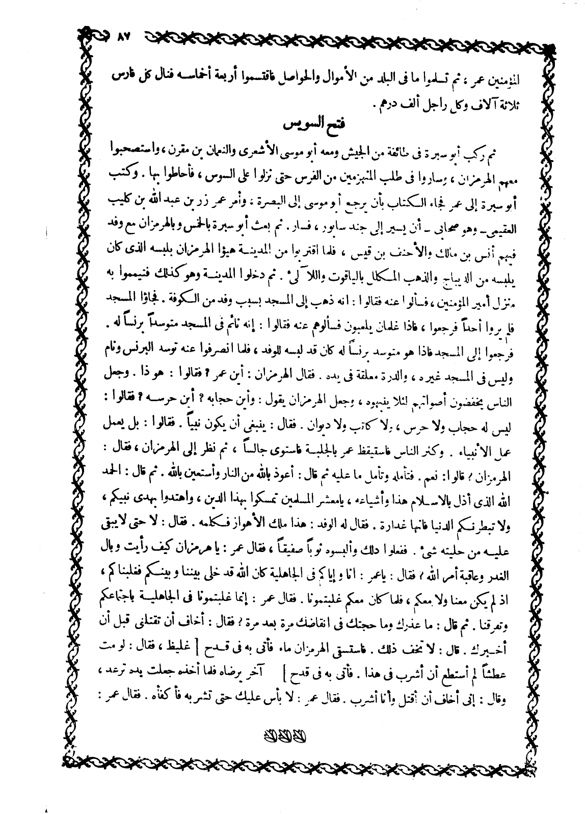 الْهُرْمُزَانُ؟ قَالُوا: نَعَمْ. فَتَأَمَّلَهُ وَتَأَمَّلَ مَا عَلَيْهِ ثُمَّ قَالَ: أَعُوذُ باللَّه مِنَ النَّارِ وَأَسْتَعِينُ باللَّه. ثُمَّ قَالَ: الحمد الله الَّذِي أَذَلَّ بِالْإِسْلَامِ هَذَا وَأَشْيَاعَهُ، يَا مَعْشَرَ الْمُسْلِمِينَ تَمَسَّكُوا بِهَذَا الدِّينِ، وَاهْتَدَوْا بِهَدْيِ نَبِيِّكُمْ، ولا تبطرنكم الدنيا فإنها غدارة. فَقَالَ لَهُ الْوَفْدُ: هَذَا مَلِكُ الْأَهْوَازِ فَكَلِّمْهُ. فَقَالَ: لَا حَتَّى لَا يَبْقَى عَلَيْهِ مِنْ حِلْيَتِهِ شَيْءٌ. فَفَعَلُوا ذَلِكَ وَأَلْبَسُوهُ ثَوْبًا صَفِيقًا، فقال عمر: يَا هُرْمُزَانُ كَيْفَ رَأَيْتَ وَبَالَ الْغَدْرِ وَعَاقِبَةَ أَمْرِ اللَّهِ؟ فَقَالَ: يَا عُمَرُ: إِنَّا وَإِيَّاكُمْ فِي الْجَاهِلِيَّةِ كَانَ اللَّهُ قَدْ خَلَّى بَيْنَنَا وَبَيْنَكُمْ فَغَلَبْنَاكُمْ، إِذْ لَمْ يَكُنْ مَعَنَا وَلَا مَعَكُمْ، فَلَمَّا كَانَ مَعَكُمْ غَلَبْتُمُونَا. فَقَالَ عُمَرُ: إِنَّمَا غَلَبْتُمُونَا فِي الْجَاهِلِيَّةِ بِاجْتِمَاعِكُمْ وَتَفَرُّقِنَا. ثُمَّ قال: ما عذرك وما حجتك في انقاضك مَرَّةً بَعْدَ مَرَّةٍ؟ فَقَالَ: أَخَافُ أَنْ تَقْتُلَنِي قَبْلَ أَنْ أُخْبِرَكَ. قَالَ: لَا تَخَفْ ذَلِكَ. فاستسقى الْهُرْمُزَانُ مَاءً فَأُتِيَ بِهِ فِي قَدَحٍ [غَلِيظٍ، فَقَالَ: لَوْ مُتُّ عَطَشًا لَمْ أَسْتَطِعْ أَنْ أَشْرَبَ فِي هَذَا. فَأُتِيَ بِهِ فِي قَدَحٍ] [1] آخَرَ يَرْضَاهُ فَلَمَّا أَخَذَهُ جَعَلَتْ يَدُهُ تَرْعَدُ، وَقَالَ: إِنِّي أَخَافُ أَنْ أُقْتَلَ وَأَنَا أَشْرَبُ. فَقَالَ عُمَرُ: لَا بَأْسَ عَلَيْكَ حَتَّى تَشْرَبَهُ فأكفاه. فقال عمر:
