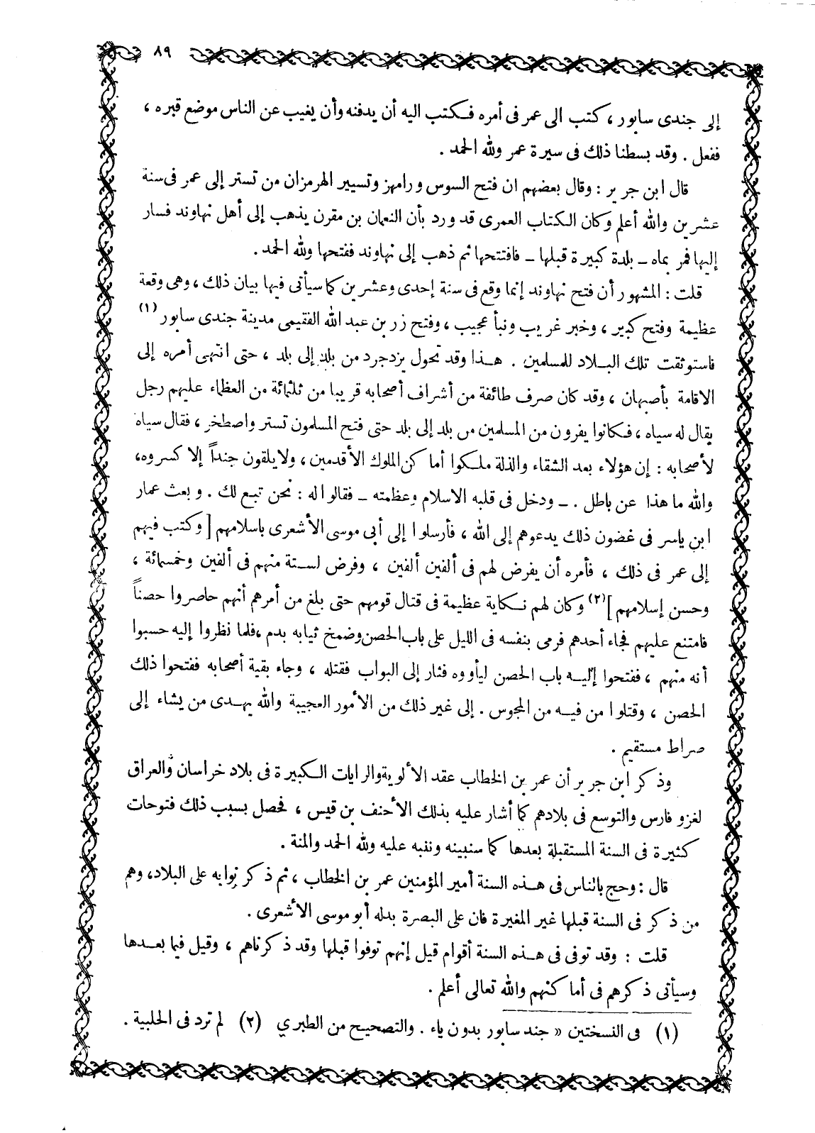 قُلْتُ: الْمَشْهُورُ أَنَّ فَتْحَ نَهَاوَنْدَ إِنَّمَا وَقَعَ فِي سَنَةِ إِحْدَى وَعِشْرِينَ كَمَا سَيَأْتِي فِيهَا بَيَانُ ذَلِكَ، وَهِيَ وَقْعَةٌ عَظِيمَةٌ وَفَتْحٌ كَبِيرٌ، وَخَبَرٌ غَرِيبٌ وَنَبَأٌ عَجِيبٌ، وَفَتَحَ زِرُّ بْنُ عَبْدِ اللَّهِ الْفُقَيْمِيُّ مدينة جنديسابور [1] فاستوثقت تِلْكَ الْبِلَادُ لِلْمُسْلِمِينَ. هَذَا وَقَدْ تَحَوَّلَ يَزْدَجِرْدُ مِنْ بَلَدٍ إِلَى بَلَدٍ، حَتَّى انْتَهَى أَمْرُهُ إِلَى الْإِقَامَةِ بِأَصْبَهَانَ، وَقَدْ كَانَ صَرَفَ طَائِفَةً مِنْ أَشْرَافِ أَصْحَابِهِ قَرِيبًا مِنْ ثَلَاثِمِائَةٍ مِنَ الْعُظَمَاءِ عَلَيْهِمْ رَجُلٌ يُقَالُ لَهُ سِيَاهُ، فَكَانُوا يَفِرُّونَ مِنَ الْمُسْلِمِينَ مِنْ بَلَدٍ إِلَى بَلَدٍ حَتَّى فَتَحَ الْمُسْلِمُونَ تُسْتَرَ وَإِصْطَخْرَ، فَقَالَ سِيَاهُ لِأَصْحَابِهِ: إِنَّ هَؤُلَاءِ بَعْدَ الشَّقَاءِ وَالذِّلَّةِ مَلَكُوا أَمَاكِنَ الْمُلُوكِ الْأَقْدَمِينَ، وَلَا يَلْقَوْنَ جُنْدًا إِلَّا كَسَرُوهُ، وَاللَّهِ مَا هَذَا عَنْ بَاطِلٍ. - وَدَخَلَ فِي قَلْبِهِ الْإِسْلَامُ وَعَظَمَتُهُ- فَقَالُوا لَهُ: نَحْنُ تبع لك. وبعث عمار ابن ياسر في غضون ذَلِكَ يَدْعُوهُمْ إِلَى اللَّهِ، فَأَرْسَلُوا إِلَى أَبِي مُوسَى الْأَشْعَرِيِّ بِإِسْلَامِهِمْ [وَكَتَبَ فِيهِمْ إِلَى عُمَرَ فِي ذَلِكَ، فَأَمَرَهُ أَنْ يَفْرِضَ لَهُمْ فِي أَلْفَيْنِ أَلْفَيْنِ، وَفَرَضَ لِسِتَّةٍ مِنْهُمْ فِي أَلْفَيْنِ وَخَمْسِمِائَةٍ، وَحَسُنَ إِسْلَامُهُمْ] [2] وَكَانَ لَهُمْ نِكَايَةٌ عَظِيمَةٌ فِي قِتَالِ قَوْمِهِمْ حَتَّى بَلَغَ مِنْ أَمْرِهِمْ أَنَّهُمْ حَاصَرُوا حِصْنًا فَامْتَنَعَ عَلَيْهِمْ فَجَاءَ أَحَدُهُمْ فَرَمَى بِنَفْسِهِ فِي اللَّيْلِ عَلَى بَابِ الْحِصْنِ وَضَمَّخَ ثِيَابَهُ بِدَمٍ، فَلَمَّا نَظَرُوا إِلَيْهِ حَسِبُوا أنه منهم، ففتحوا إليه باب الحصن ليأووه فَثَارَ إِلَى الْبَوَّابِ فَقَتَلَهُ، وَجَاءَ بَقِيَّةُ أَصْحَابِهِ فَفَتَحُوا ذَلِكَ الْحِصْنَ، وَقَتَلُوا مَنْ فِيهِ مِنَ الْمَجُوسِ. إِلَى غَيْرِ ذَلِكَ مِنَ الْأُمُورِ الْعَجِيبَةِ وَاللَّهُ يَهْدِي مَنْ يَشَاءُ إِلَى صِرَاطٍ مُسْتَقِيمٍ.