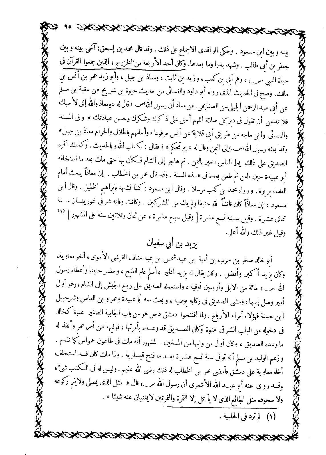 بَيْنَهُ وَبَيْنَ ابْنِ مَسْعُودٍ. وَحَكَى الْوَاقِدِيُّ الْإِجْمَاعَ عَلَى ذَلِكَ. وَقَدْ قَالَ مُحَمَّدُ بْنُ إِسْحَاقَ: آخَى بَيْنَهُ وَبَيْنَ جَعْفَرِ بْنِ أَبِي طَالِبٍ. وَشَهِدَ بَدْرًا وَمَا بَعْدَهَا. وَكَانَ أَحَدَ الْأَرْبَعَةِ مِنَ الْخَزْرَجِ، الَّذِينَ جَمَعُوا الْقُرْآنَ فِي حَيَاةِ النَّبِيِّ صَلَّى اللَّهُ عَلَيْهِ وَسَلَّمَ، وَهُمْ أُبَيُّ بْنُ كَعْبٍ، وَزَيْدُ بْنُ ثَابِتٍ، وَمُعَاذُ بْنُ جبل، وأبو زيد بن عمر بن أَنَسِ بْنِ مَالِكٍ. وَصَحَّ فِي الْحَدِيثِ الَّذِي رَوَاهُ أَبُو دَاوُدَ وَالنَّسَائِيُّ مِنْ حَدِيثِ حَيْوَةَ بْنِ شُرَيْحٍ عَنْ عُقْبَةَ بْنِ مُسْلِمٍ عَنْ أبى عبد الرحمن الجيلي عَنِ الصُّنَابِحِيِّ. عَنْ مُعَاذٍ أَنَّ رَسُولَ اللَّهِ صَلَّى اللَّهُ عَلَيْهِ وَسَلَّمَ قَالَ لَهُ «يَا مُعَاذُ وَاللَّهِ إِنِّي لَأُحِبُّكَ فَلَا تَدَعَنَّ أَنْ تَقُولَ فِي دُبُرِ كُلِّ صَلَاةٍ اللَّهمّ أَعِنِّي عَلَى ذِكْرِكَ وَشُكْرِكَ وَحُسْنِ عِبَادَتِكَ» وَفِي الْمُسْنَدِ وَالنَّسَائِيِّ وَابْنِ مَاجَهْ مِنْ طَرِيقِ أَبِي قِلَابَةَ عَنْ أَنَسٍ مَرْفُوعًا «وَأَعْلَمُهُمْ بِالْحَلَالِ وَالْحَرَامِ مُعَاذُ بْنُ جَبَلٍ» وَقَدْ بَعَثَهُ رَسُولُ اللَّهِ صَلَّى اللَّهُ عَلَيْهِ وَسَلَّمَ إِلَى الْيَمَنِ وَقَالَ لَهُ «بم تحكم» ؟ فقال: بكتاب الله وبالحديث. وَكَذَلِكَ أَقَرَّهُ الصِّدِّيقُ عَلَى ذَلِكَ يُعَلِّمُ النَّاسَ الْخَيْرَ بِالْيَمَنِ. ثُمَّ هَاجَرَ إِلَى الشَّامِ فَكَانَ بِهَا حَتَّى مَاتَ بَعْدَ مَا اسْتَخْلَفَهُ أَبُو عُبَيْدَةَ حِينَ طُعِنَ ثُمَّ طُعِنَ بَعْدَهُ فِي هَذِهِ السَّنَةِ. وَقَدْ قَالَ عُمَرُ بْنُ الْخَطَّابِ: إِنَّ مُعَاذًا يُبْعَثُ أَمَامَ الْعُلَمَاءِ بِرَبْوَةٍ. وَرَوَاهُ مُحَمَّدُ بْنُ كَعْبٍ مُرْسَلًا. وَقَالَ ابْنُ مَسْعُودٍ: كُنَّا نُشَبِّهُهُ بِإِبْرَاهِيمَ الْخَلِيلِ. وَقَالَ ابْنُ مَسْعُودٍ: إن معاذا كان قانتا الله حَنِيفًا وَلَمْ يَكُ مِنَ الْمُشْرِكِينَ. وَكَانَتْ وَفَاتُهُ شرقى غورينسان سنة ثماني عشرة. وقيل سنة تسع وعشرة [وقيل سبع عشرة، عن ثمان وثلاثين سنة عَلَى الْمَشْهُورِ] [1] وَقِيلَ غَيْرُ ذَلِكَ وَاللَّهُ أَعْلَمُ.
