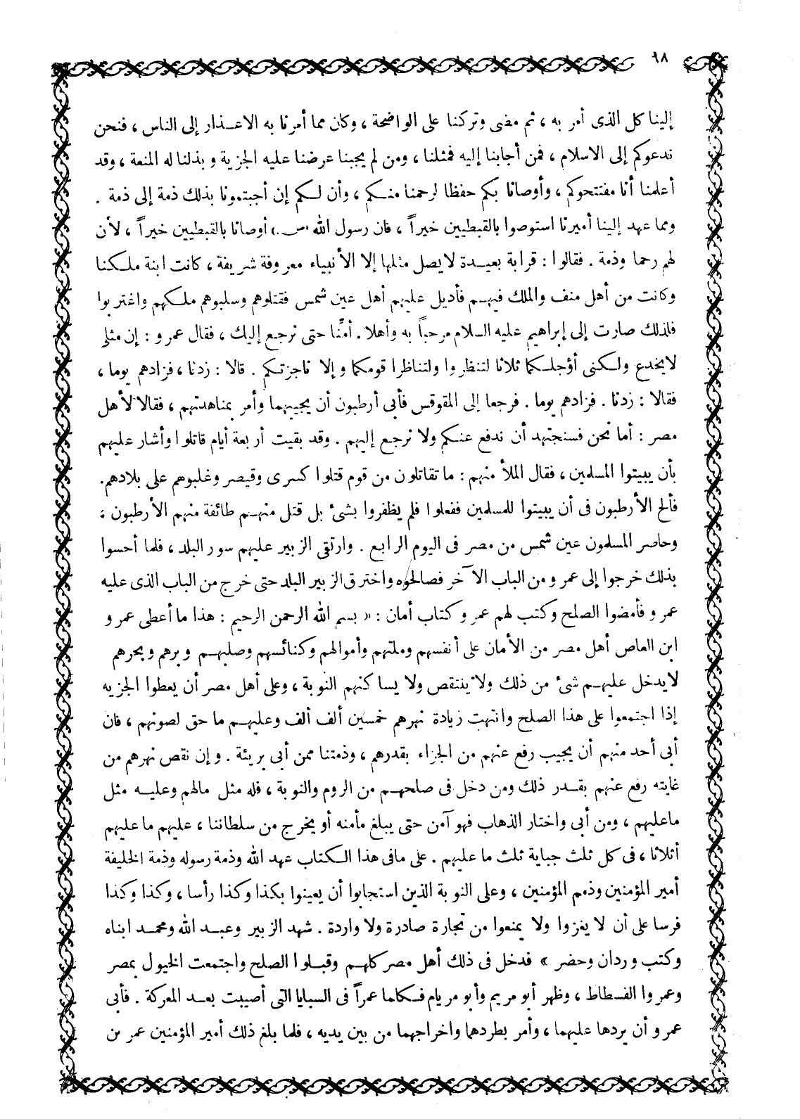 إِلَيْنَا كُلَّ الَّذِي أُمِرَ بِهِ، ثُمَّ مَضَى وَتَرَكَنَا عَلَى الْوَاضِحَةِ، وَكَانَ مِمَّا أَمَرَنَا بِهِ الْإِعْذَارُ إِلَى النَّاسِ، فَنَحْنُ نَدْعُوكُمْ إِلَى الْإِسْلَامِ، فَمَنْ أَجَابَنَا إِلَيْهِ فَمِثْلُنَا، وَمَنْ لَمْ يُجِبْنَا عَرَضْنَا عَلَيْهِ الْجِزْيَةَ وَبَذَلْنَا لَهُ الْمَنَعَةَ، وَقَدْ أَعْلَمَنَا أَنَّا مُفْتَتِحُوكُمْ، وَأَوْصَانَا بِكُمْ حِفْظًا لِرَحِمِنَا مِنْكُمْ، وَأَنَّ لَكُمْ إِنْ أَجَبْتُمُونَا بِذَلِكَ ذِمَّةً إِلَى ذِمَّةٍ وَمِمَّا عَهِدَ إِلَيْنَا أَمِيرُنَا اسْتَوْصُوا بِالْقِبْطِيِّينَ خَيْرًا، فَإِنَّ رَسُولَ اللَّهِ صَلَّى اللَّهُ عَلَيْهِ وَسَلَّمَ أَوْصَانَا بِالْقِبْطِيِّينَ خَيْرًا، لِأَنَّ لَهُمْ رَحِمًا وَذِمَّةً. فَقَالُوا: قَرَابَةٌ بَعِيدَةٌ لَا يَصِلُ مِثْلَهَا إِلَّا الْأَنْبِيَاءُ مَعْرُوفَةٌ شَرِيفَةٌ، كَانَتِ ابْنَةَ مَلِكِنَا وَكَانَتْ مَنْ أَهْلِ مَنْفَ وَالْمُلْكُ فِيهِمْ فَأُدِيلَ عَلَيْهِمْ أَهْلُ عَيْنِ شَمْسٍ فَقَتَلُوهُمْ وَسَلَبُوهُمْ مُلْكَهُمْ وَاغْتَرَبُوا فَلِذَلِكَ صَارَتْ إِلَى إِبْرَاهِيمَ عَلَيْهِ السَّلَامُ مَرْحَبًا بِهِ وَأَهْلًا. أَمِّنَّا حَتَّى نَرْجِعَ إِلَيْكَ، فَقَالَ عَمْرٌو: إِنَّ مِثْلِي لَا يُخْدَعُ ولكنى أؤجلكما ثلاثا لتنظروا ولتناظروا قَوْمَكُمَا وَإِلَّا نَاجَزْتُكُمْ. قَالَا: زِدْنَا، فَزَادَهُمْ يَوْمًا، فَقَالَا: زِدْنَا. فَزَادَهُمْ يَوْمًا. فَرَجَعَا إِلَى الْمُقَوْقِسِ فأبى أرطبون أن يجيبهما وأمر بمناهدتهم، فقالا لِأَهْلِ مِصْرَ: أَمَّا نَحْنُ فَسَنَجْتَهِدُ أَنْ نَدْفَعَ عَنْكُمْ وَلَا نَرْجِعَ إِلَيْهِمْ. وَقَدْ بَقِيَتْ أَرْبَعَةُ أيام قاتلوا وَأَشَارَ عَلَيْهِمْ بِأَنْ يُبَيِّتُوا الْمُسْلِمِينَ، فَقَالَ الْمَلَأُ مِنْهُمْ: مَا تُقَاتِلُونَ مِنْ قَوْمٍ قَتَلُوا كِسْرَى وَقَيْصَرَ وَغَلَبُوهُمْ عَلَى بِلَادِهِمْ.